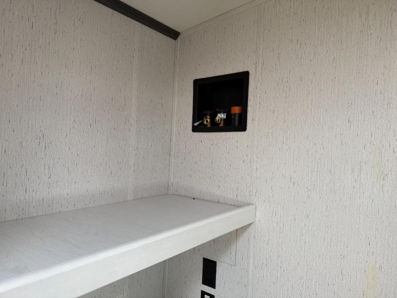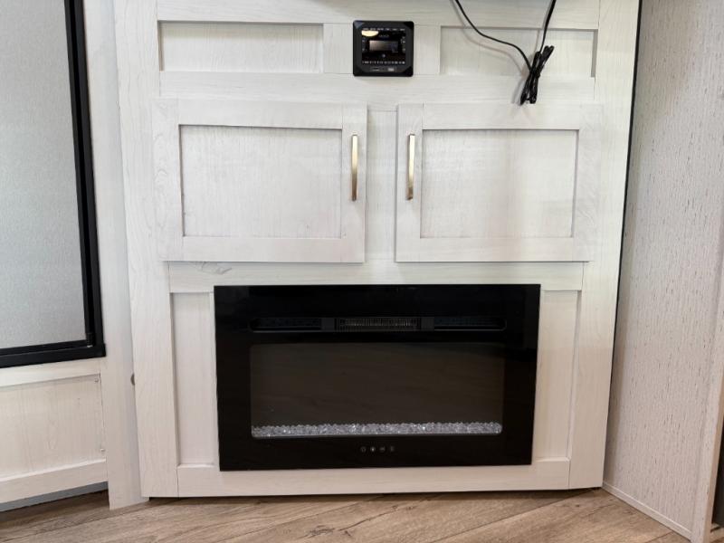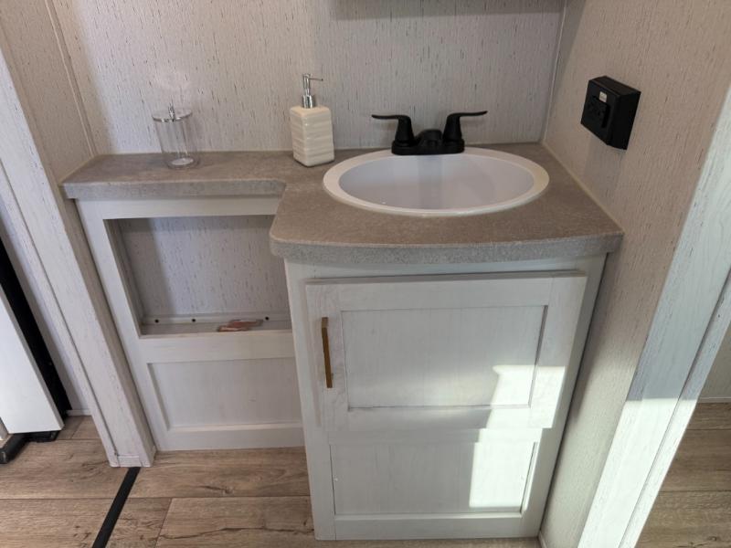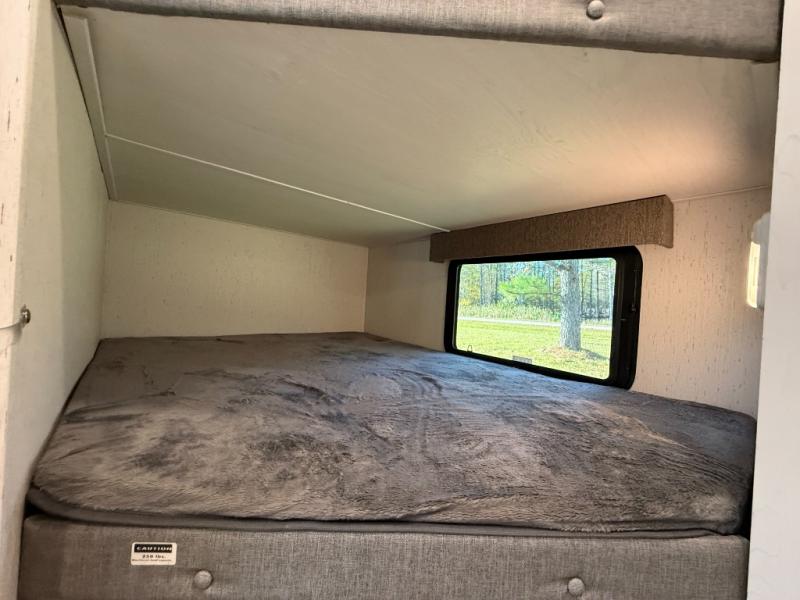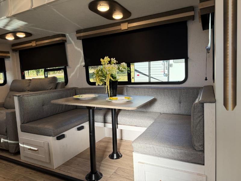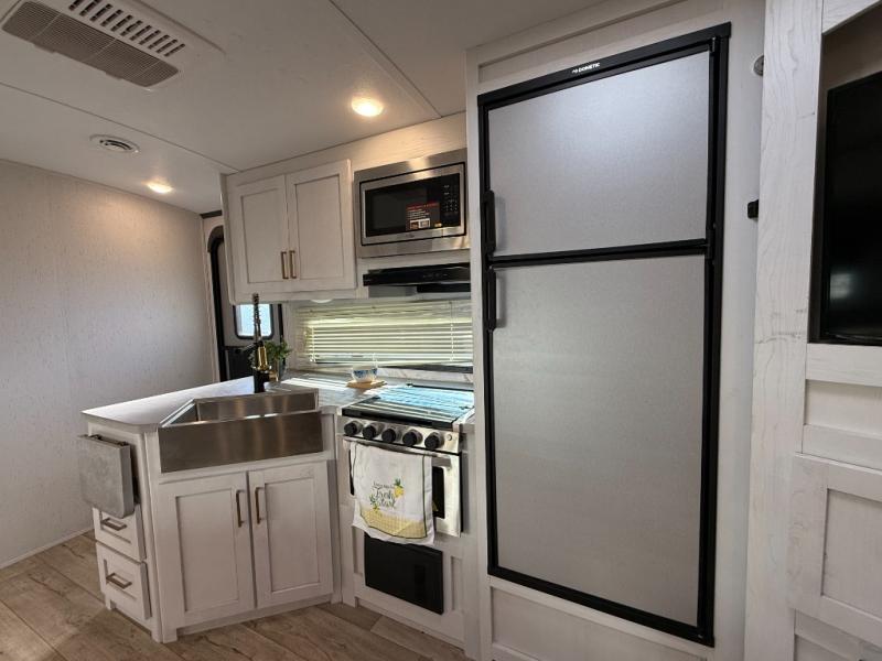 The family will love camping in this travel trailer! The kids can sleep in the rear private bunkhouse with the double-size bunk beds and store their clothes in the wardrobe. They can even bring a friend or two to sleep on the tri-fold sofa and U-shaped dinette slide once they are converted. You will enjoy your own privacy with the front bedroom which has a king bed with wardrobes/nightstands on either side and an entrance into the walk-through bathroom. You will easily be able to prepare your best meals in the kitchen with the countertop extension, the 10 cu. ft. double door refrigerator, and the glass top three burner cooktop with a 21" oven, plus there is a pantry behind the hinged entertainment center which has a LED TV to watch your favorite movies!