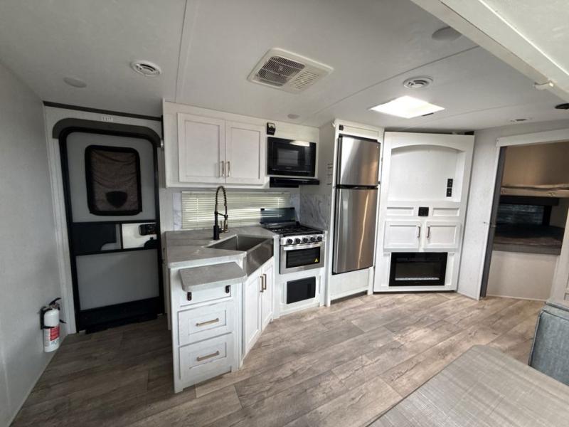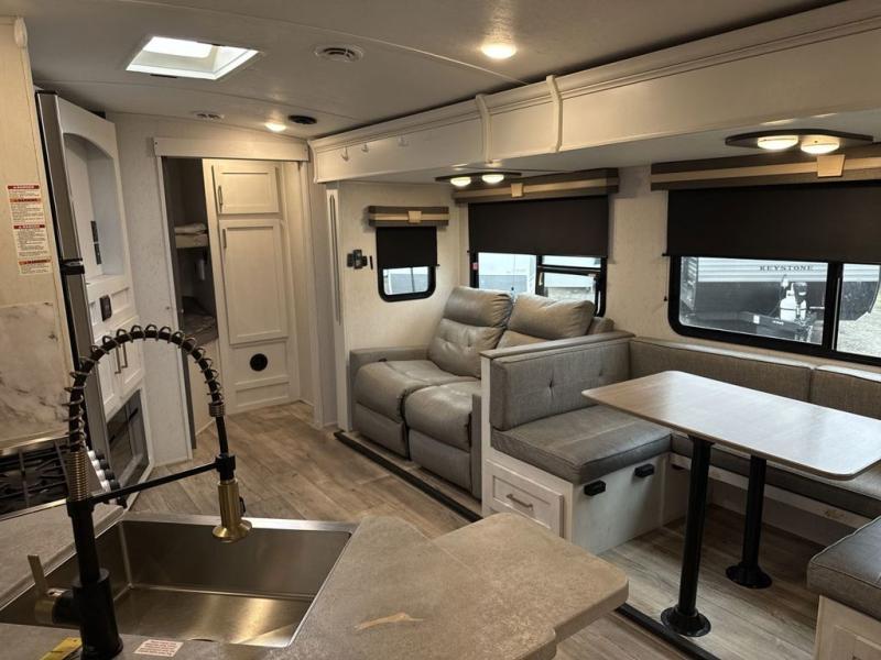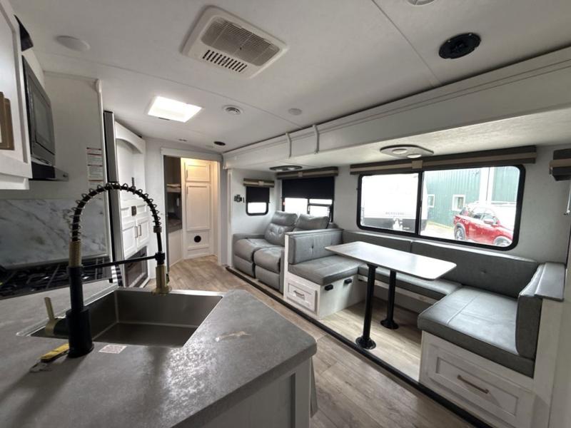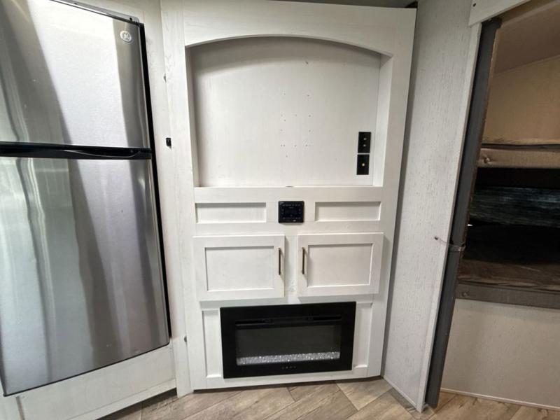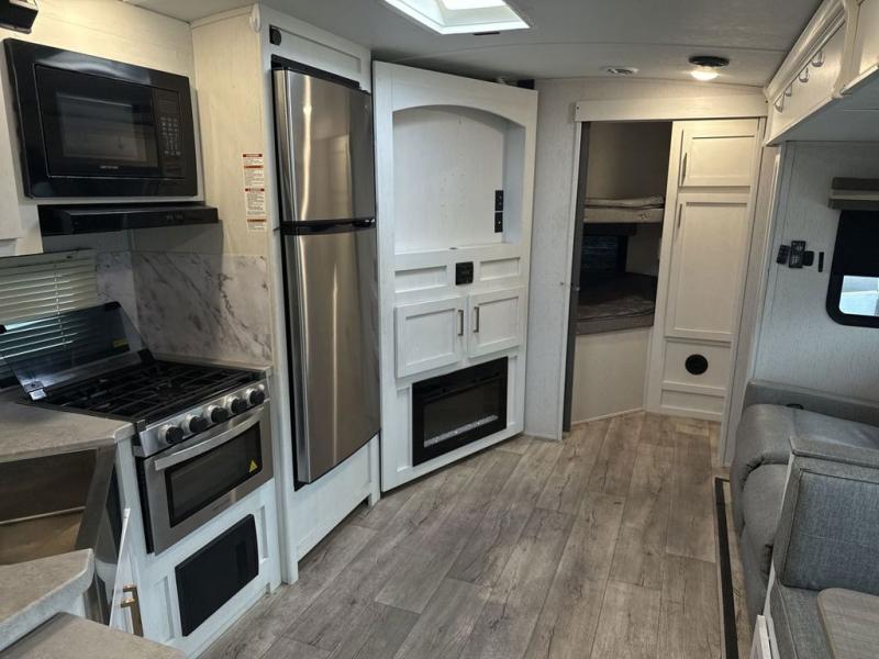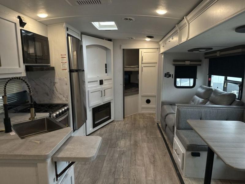 The family will love camping in this travel trailer! The kids can sleep in the rear private bunkhouse with the double-size bunk beds and store their clothes in the wardrobe. They can even bring a friend or two to sleep on the tri-fold sofa and U-shaped dinette slide once they are converted. You will enjoy your own privacy with the front bedroom which has a king bed with wardrobes/nightstands on either side and an entrance into the walk-through bathroom. You will easily be able to prepare your best meals in the kitchen with the countertop extension, the 10 cu. ft. double door refrigerator, and the glass top three burner cooktop with a 21" oven, plus there is a pantry behind the hinged entertainment center which has a LED TV to watch your favorite movies!