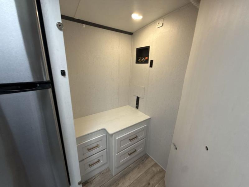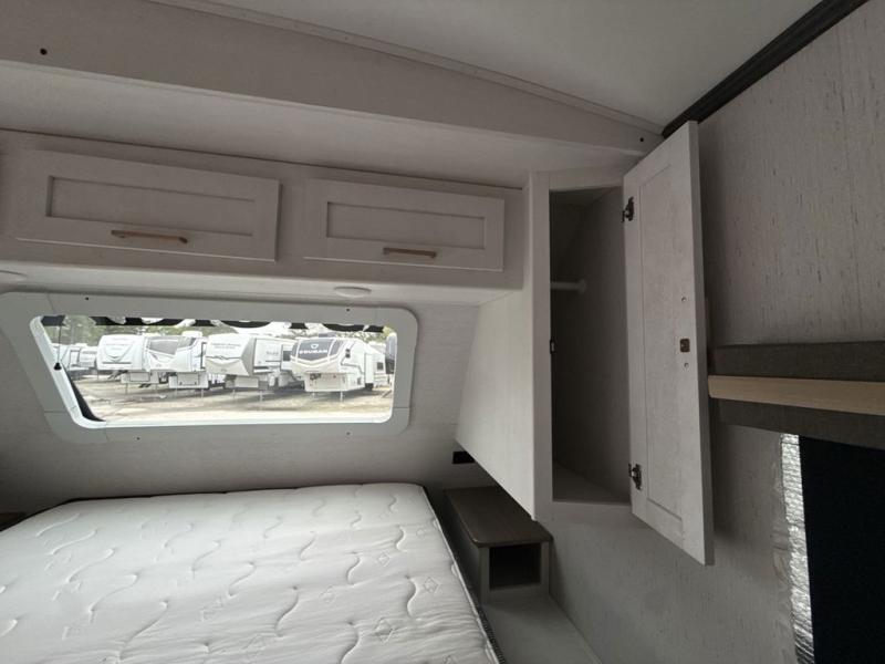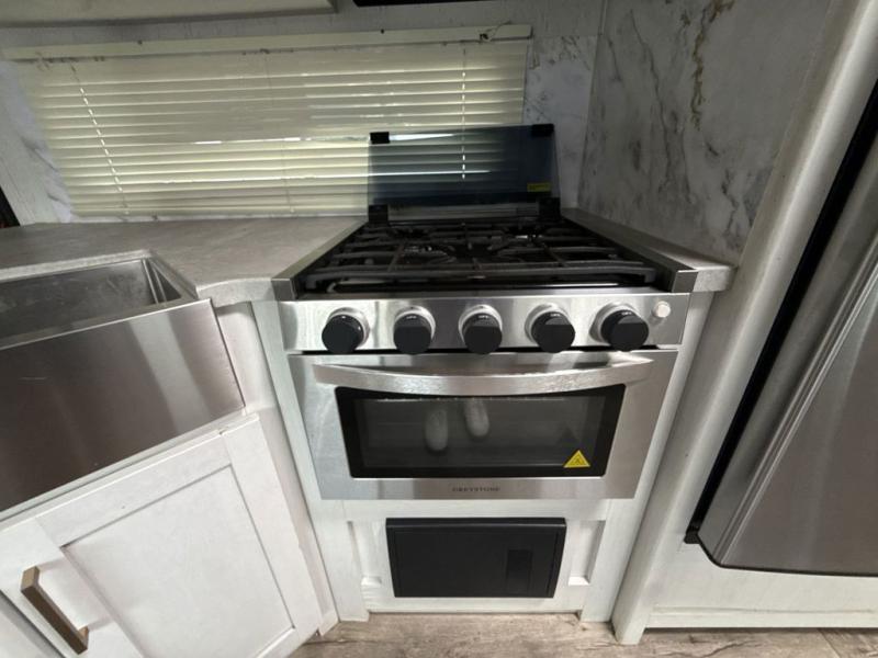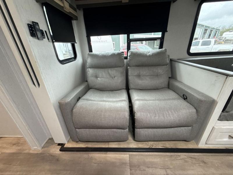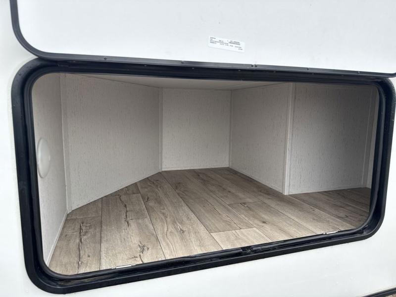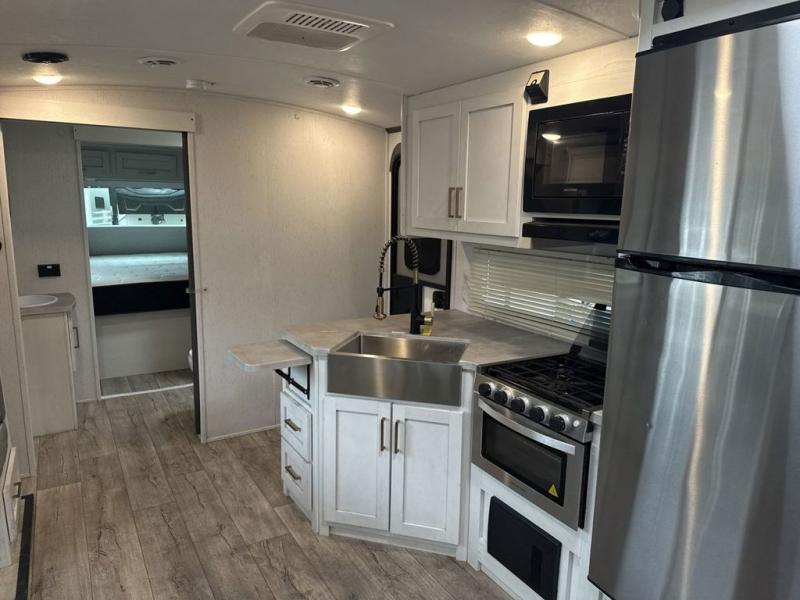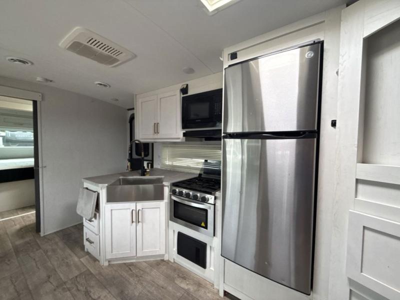 The family will love camping in this travel trailer! The kids can sleep in the rear private bunkhouse with the double-size bunk beds and store their clothes in the wardrobe. They can even bring a friend or two to sleep on the tri-fold sofa and U-shaped dinette slide once they are converted. You will enjoy your own privacy with the front bedroom which has a king bed with wardrobes/nightstands on either side and an entrance into the walk-through bathroom. You will easily be able to prepare your best meals in the kitchen with the countertop extension, the 10 cu. ft. double door refrigerator, and the glass top three burner cooktop with a 21" oven, plus there is a pantry behind the hinged entertainment center which has a LED TV to watch your favorite movies!