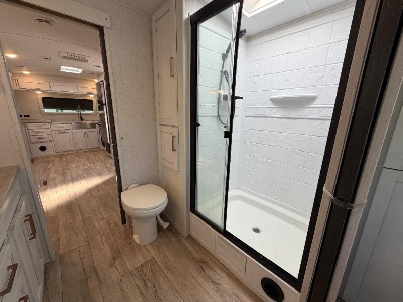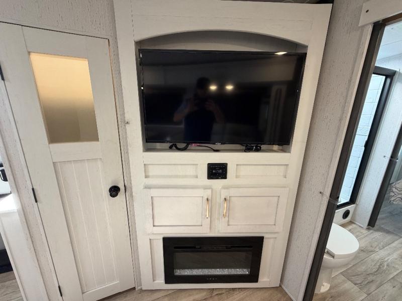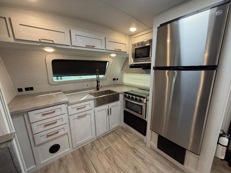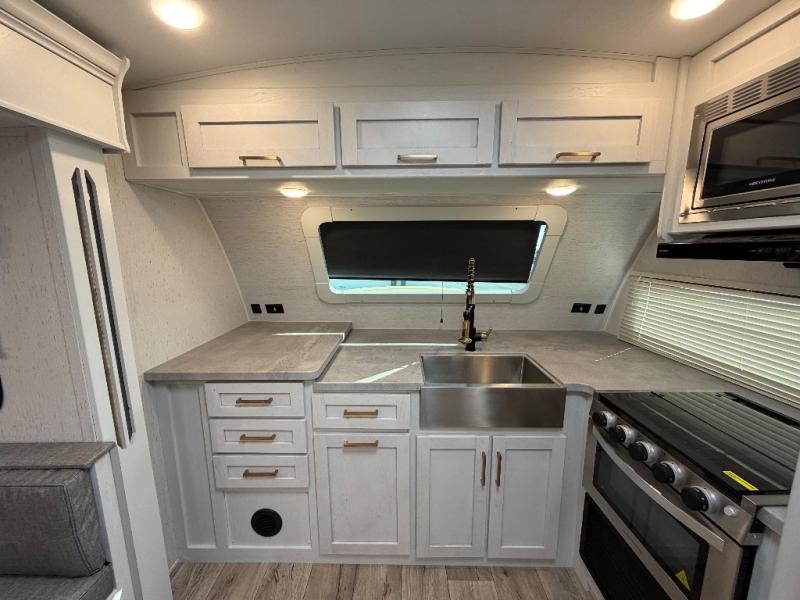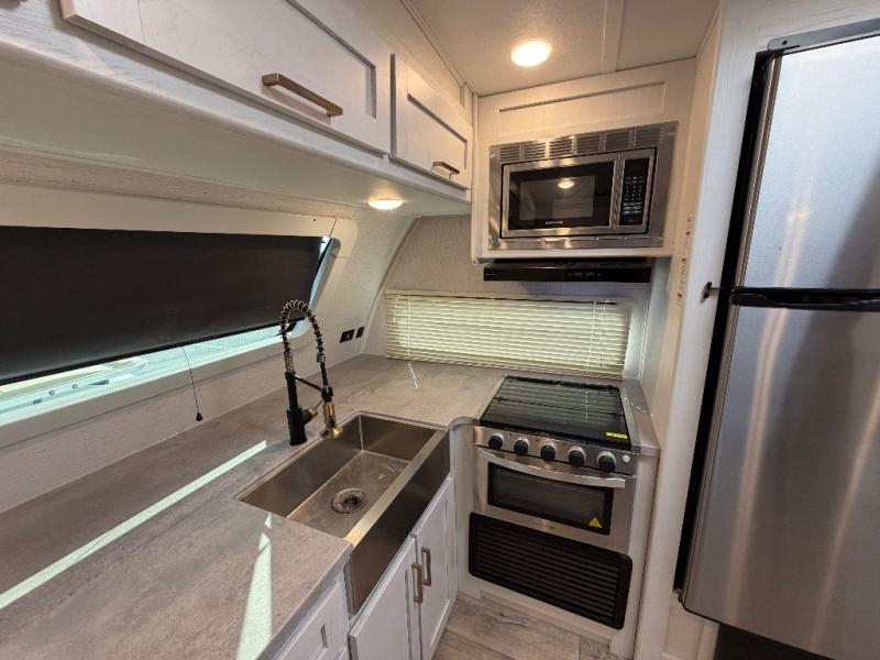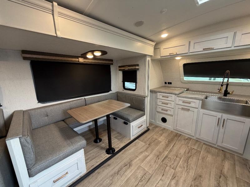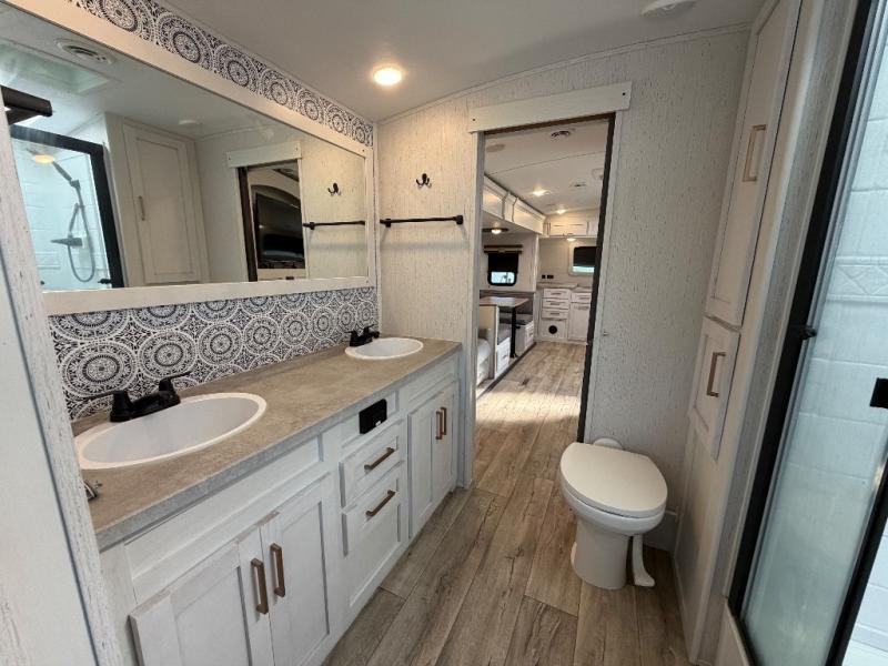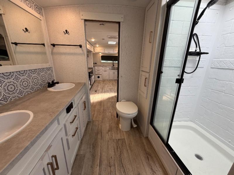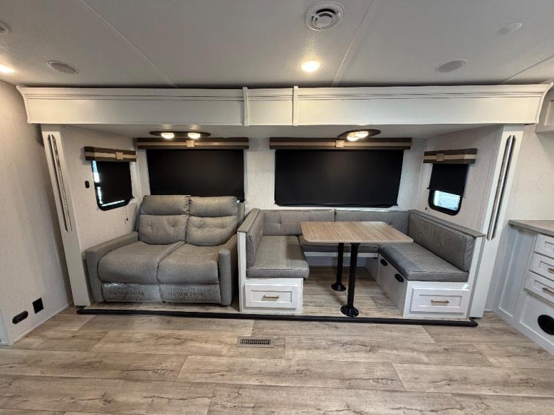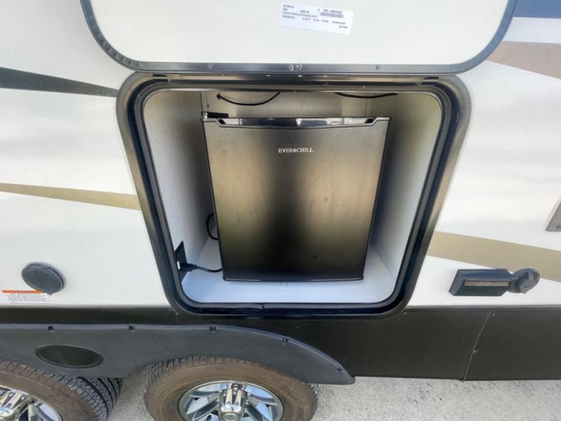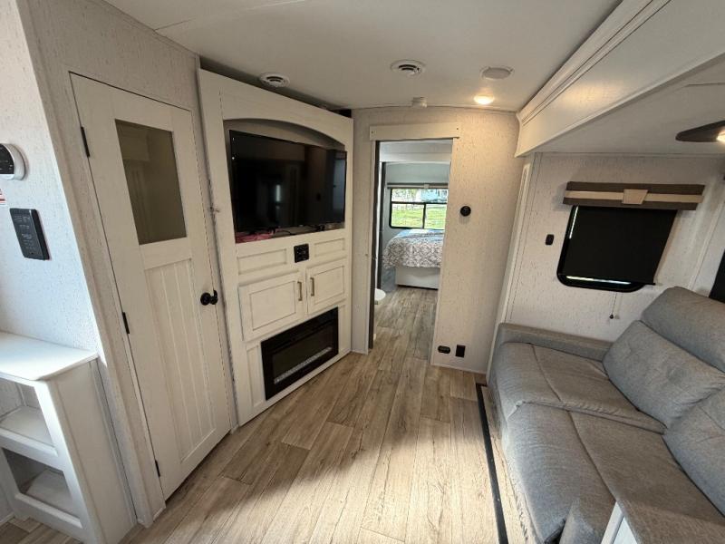 You will have everything you need for a comfortable camping trip with this travel trailer! It features a rear private bedroom with a king bed slide for more walking around space and an entrance into the walk-through bathroom which will come in handy at night. The bathroom also has a dual sink vanity for two to get ready at once in the mornings. The front kitchen has plenty of countertop space to prepare your best meals and even a pull out trash can, and you can comfortably enjoy them at the U-shaped dinette, plus it can transform into an extra sleeping space for a guest or two to tag along. What better way to relax at night than on the tri-fold sofa across from the hinged entertainment center!