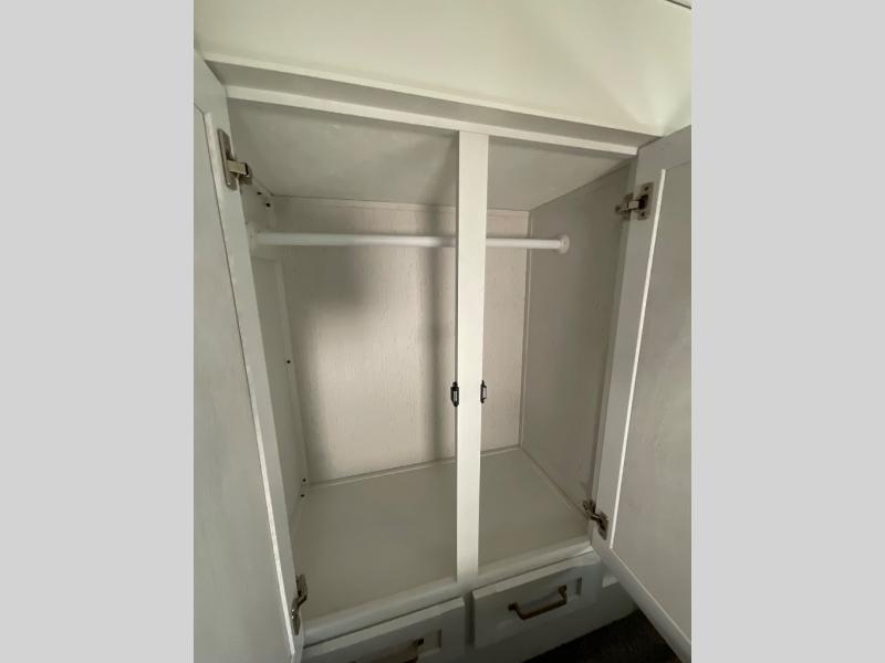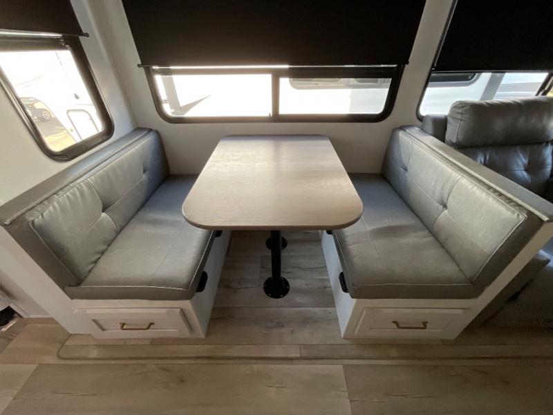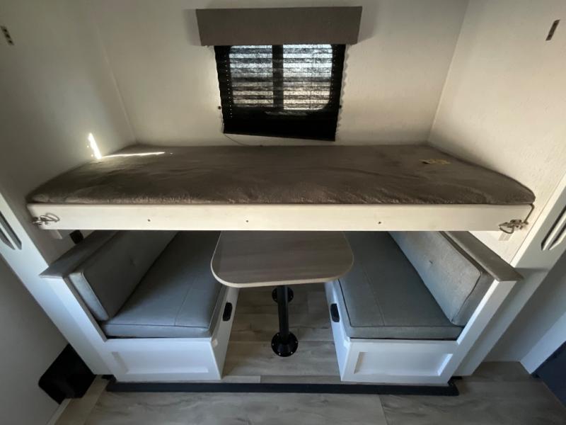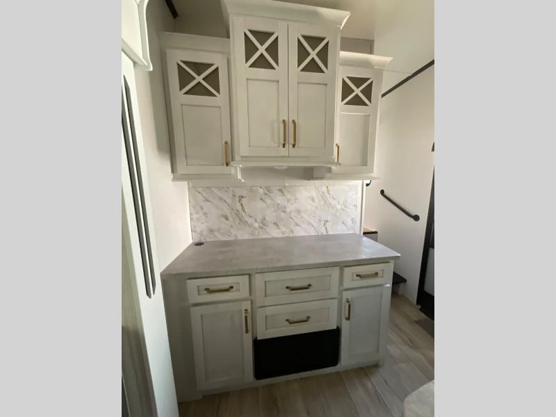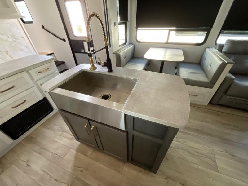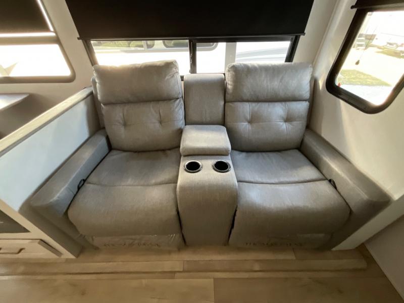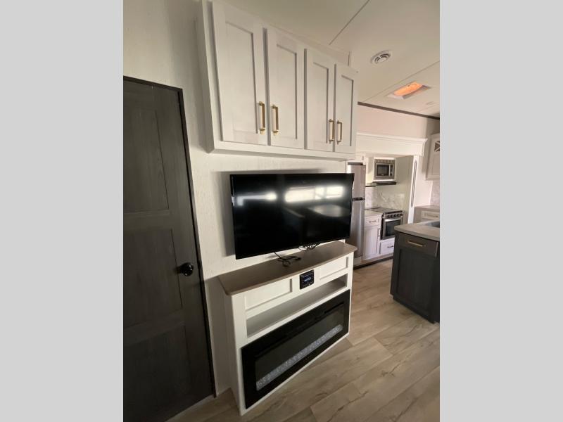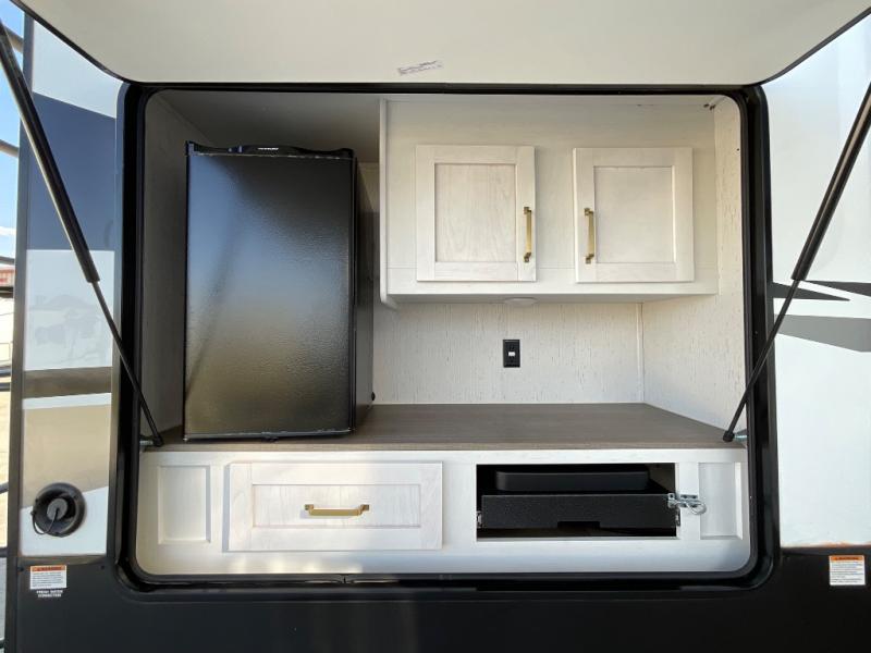 You won't believe all that this fifth wheel has to offer from the rear private bunkhouse with a flip up bunk above a dinette and a set of bunk beds with drawers below the lower bunk to the bath and a half. The theater seating is conveniently across from the entertainment center and next to the booth dinette so some can watch a movie on the 50" LED TV while others play card games. There is a kitchen island to make meal prepping easier and you can even breathe in some fresh air while you cook at the outside kitchen. End your days feeling squeaky clean after using the shower in the full bathroom, and then head to the front private bedroom to lay on the queen bed and your clothes will stay looking their best with the wardrobe slide!
