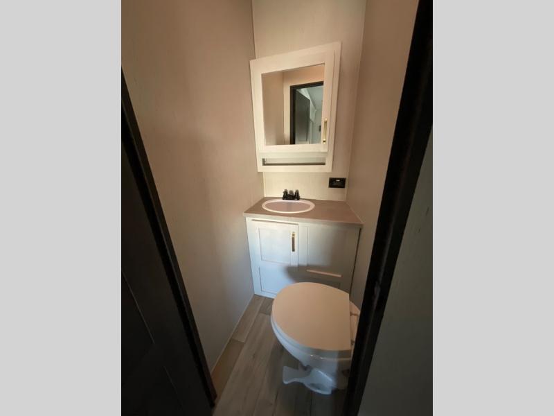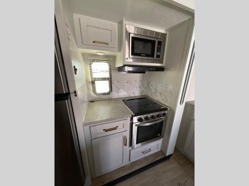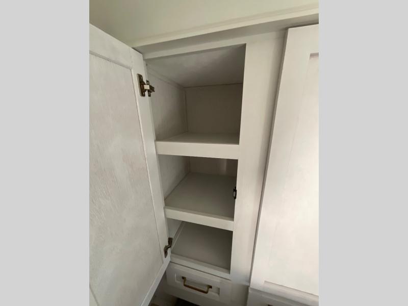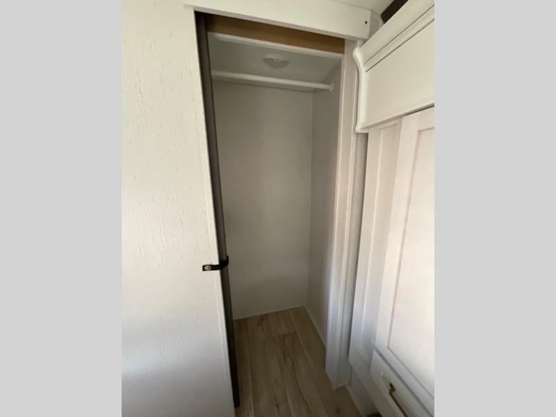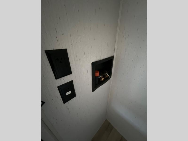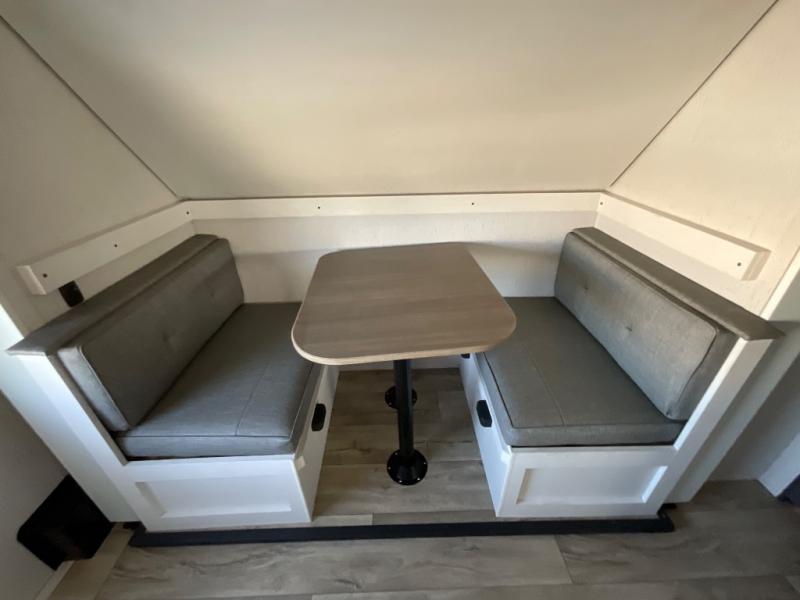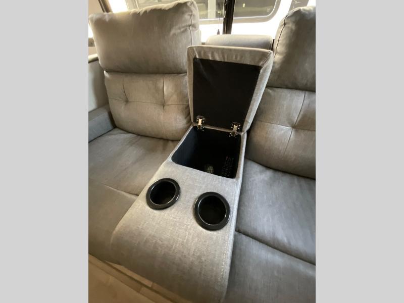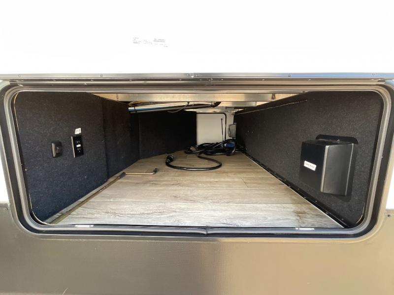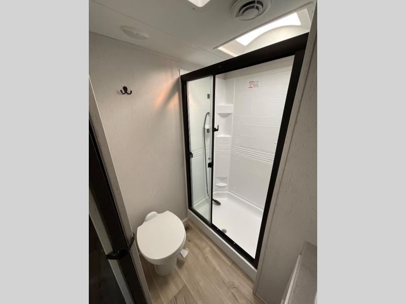 You won't believe all that this fifth wheel has to offer from the rear private bunkhouse with a flip up bunk above a dinette and a set of bunk beds with drawers below the lower bunk to the bath and a half. The theater seating is conveniently across from the entertainment center and next to the booth dinette so some can watch a movie on the 50" LED TV while others play card games. There is a kitchen island to make meal prepping easier and you can even breathe in some fresh air while you cook at the outside kitchen. End your days feeling squeaky clean after using the shower in the full bathroom, and then head to the front private bedroom to lay on the queen bed and your clothes will stay looking their best with the wardrobe slide!