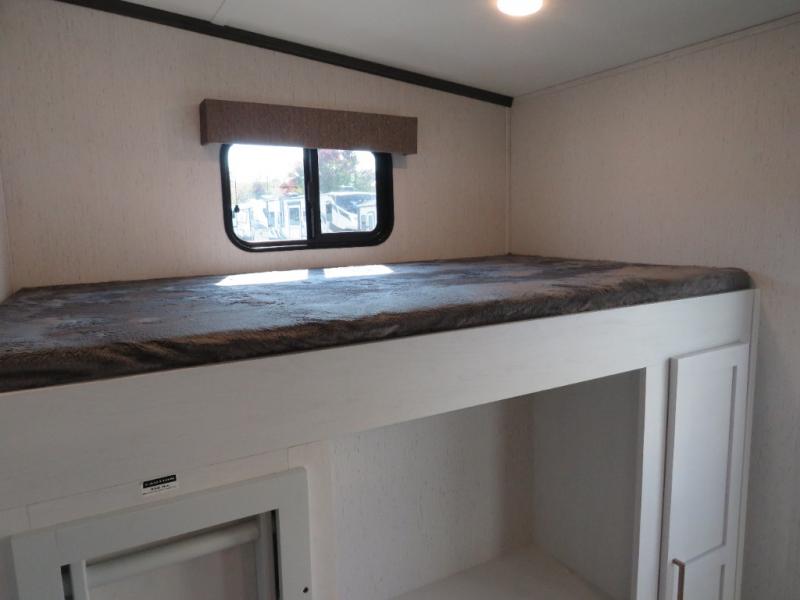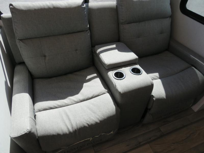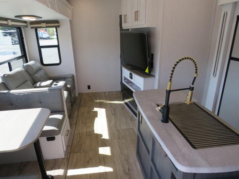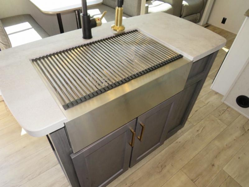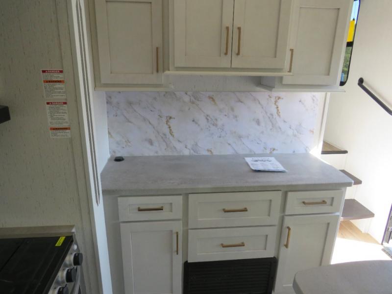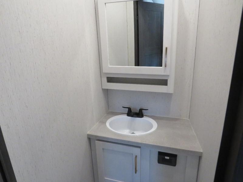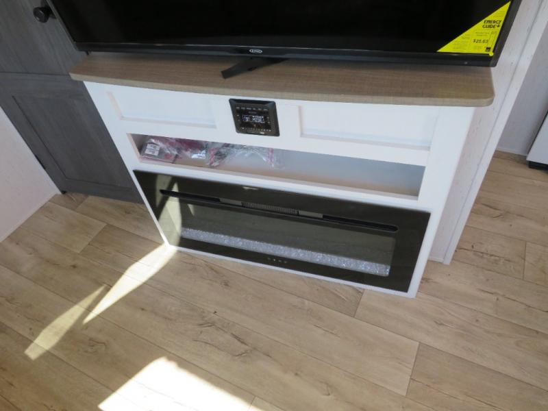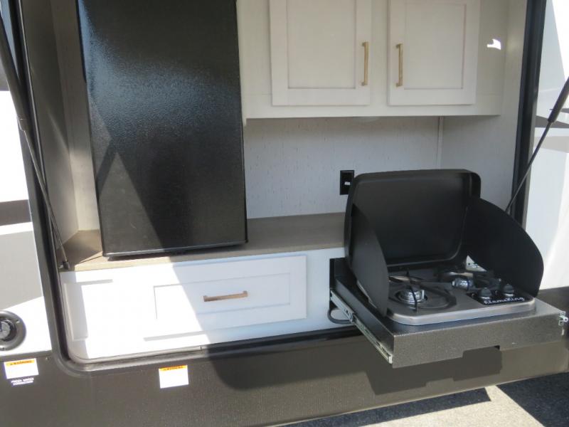 You won't believe all that this fifth wheel has to offer from the rear private bunkhouse with a flip up bunk above a dinette and a set of bunk beds with drawers below the lower bunk to the bath and a half. The theater seating is conveniently across from the entertainment center and next to the booth dinette so some can watch a movie on the 50" LED TV while others play card games. There is a kitchen island to make meal prepping easier and you can even breathe in some fresh air while you cook at the outside kitchen. End your days feeling squeaky clean after using the shower in the full bathroom, and then head to the front private bedroom to lay on the queen bed and your clothes will stay looking their best with the wardrobe slide!