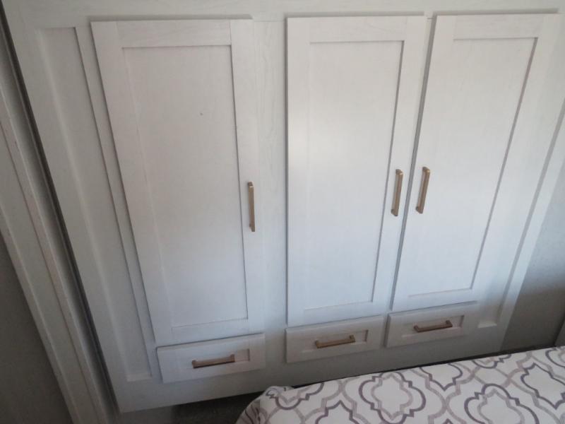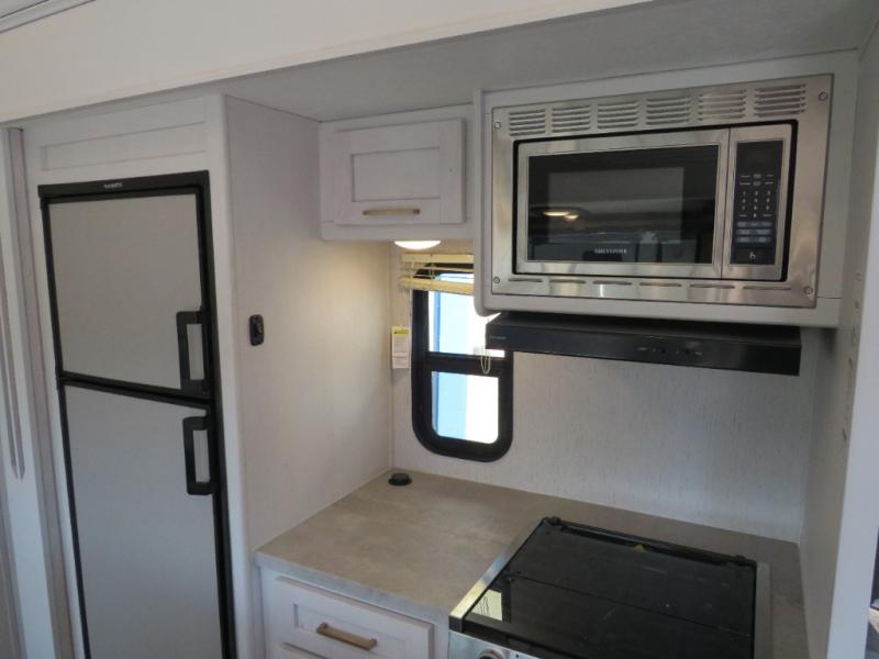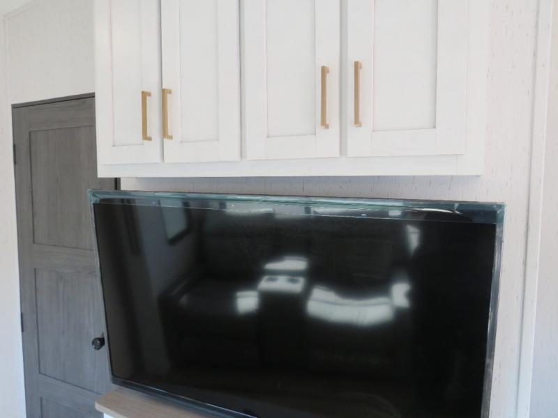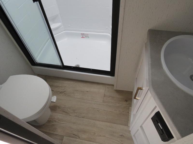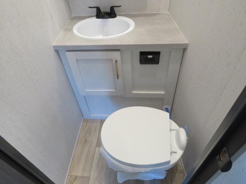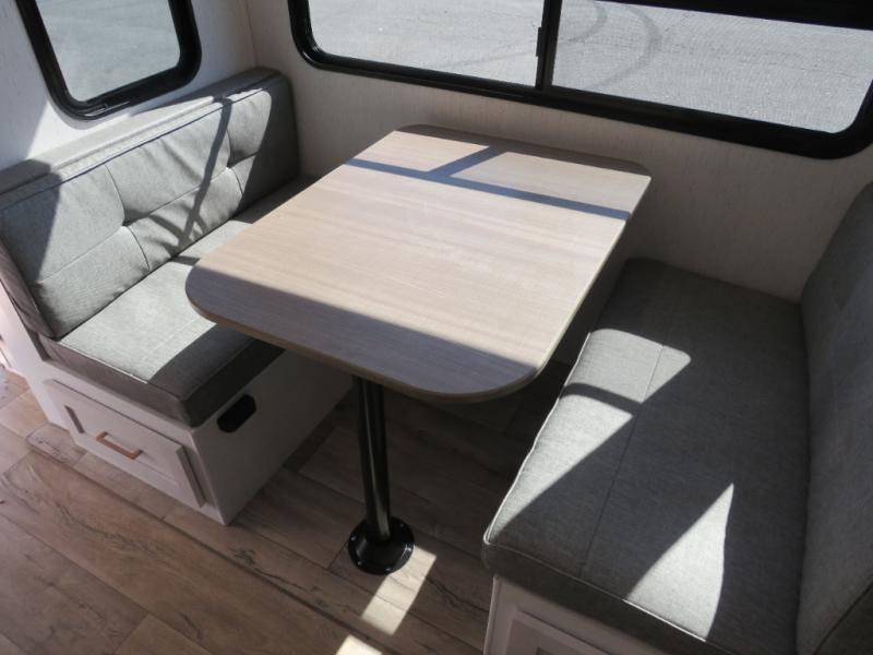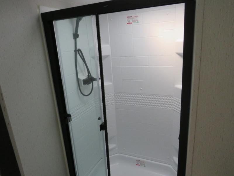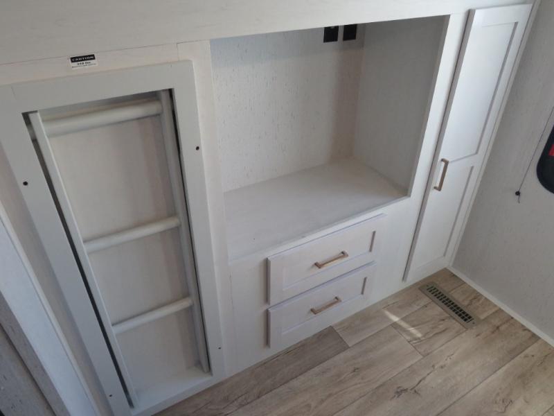 You won't believe all that this fifth wheel has to offer from the rear private bunkhouse with a flip up bunk above a dinette and a set of bunk beds with drawers below the lower bunk to the bath and a half. The theater seating is conveniently across from the entertainment center and next to the booth dinette so some can watch a movie on the 50" LED TV while others play card games. There is a kitchen island to make meal prepping easier and you can even breathe in some fresh air while you cook at the outside kitchen. End your days feeling squeaky clean after using the shower in the full bathroom, and then head to the front private bedroom to lay on the queen bed and your clothes will stay looking their best with the wardrobe slide!