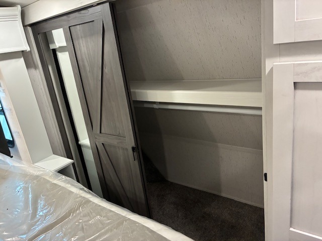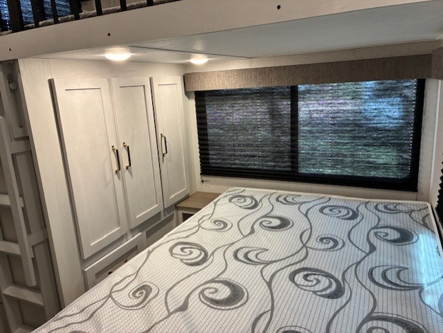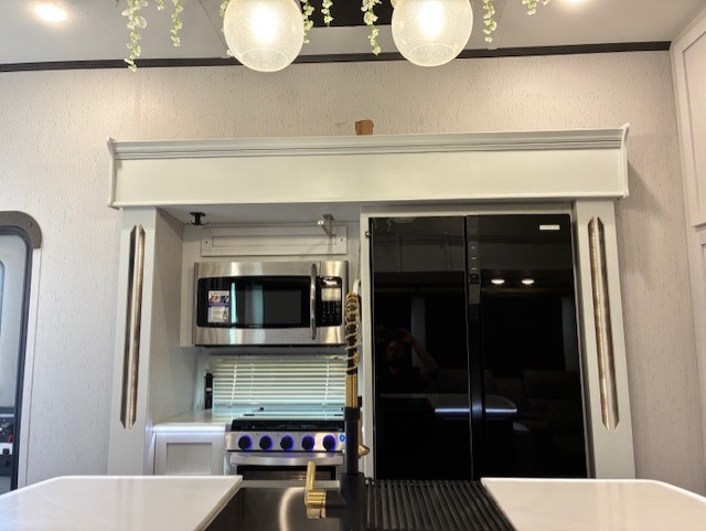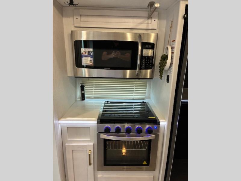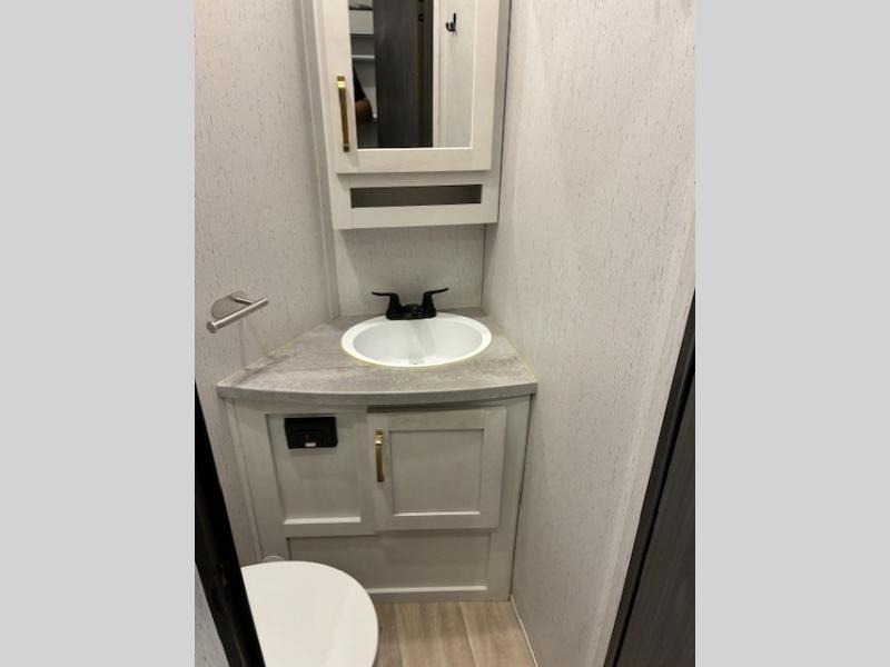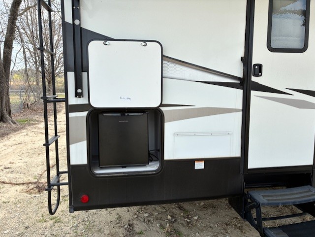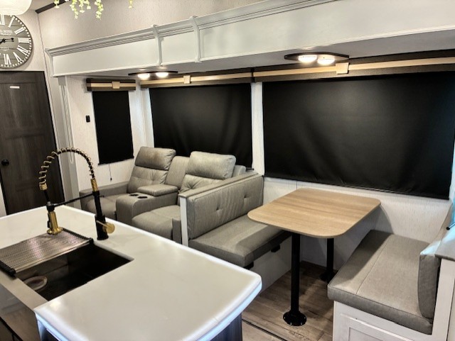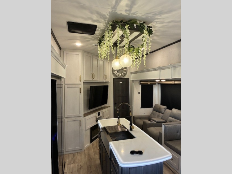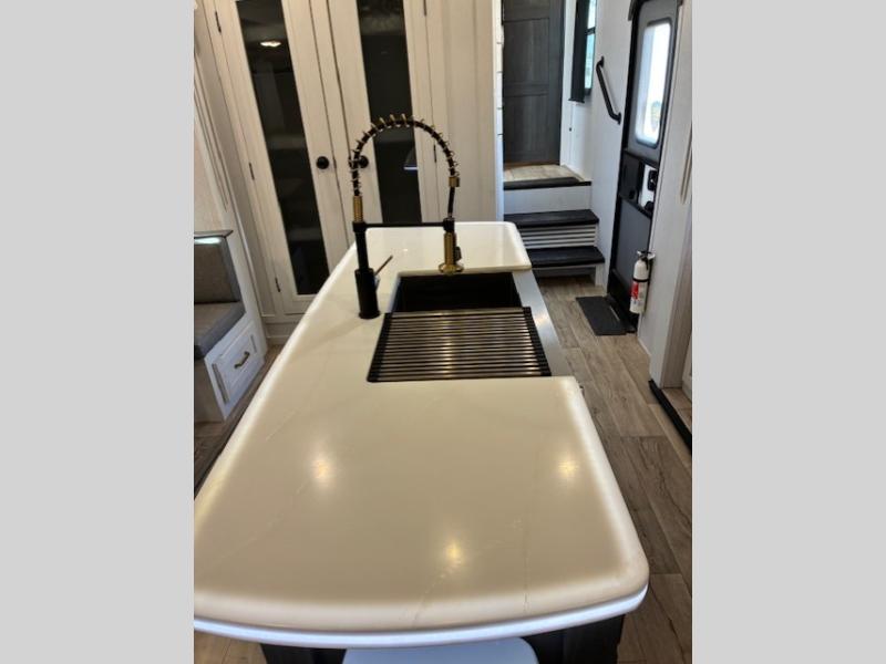 You will experience a smooth flow of traffic in and out of this fifth wheel with dual entry doors! One of the entrances even leads into the rear private bedroom which also has a 54" x 74" loft bed for storage or sleeping space, plus its very own half bathroom which will come in handy at night. The chef will enjoy preparing and serving meals using the kitchen island and all the amenities inside, plus they will enjoy cooking at the outdoor kitchen when wanting to be outside with everyone. Inside, there is a large pantry that is big enough to store everyone's favorite snacks, and the booth dinette offers a comfortable place to eat your meals or play card games. And the full bathroom has a dual sink vanity for two to get ready at once. When you're ready to wind down your nights, head to the front private bedroom and relax on the king bed slide!