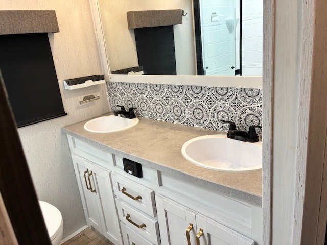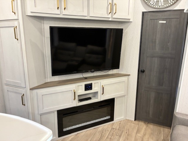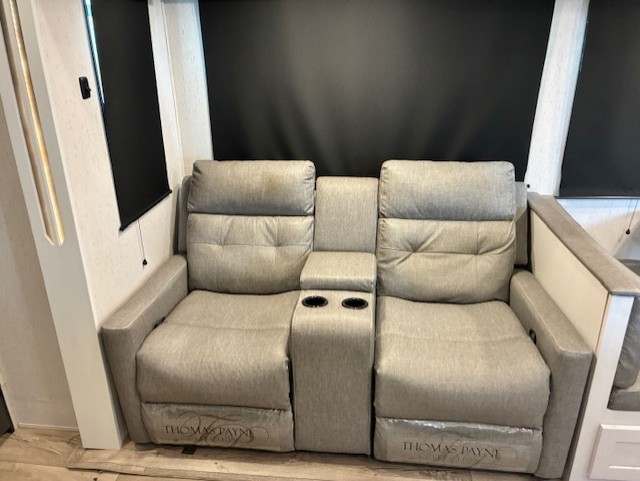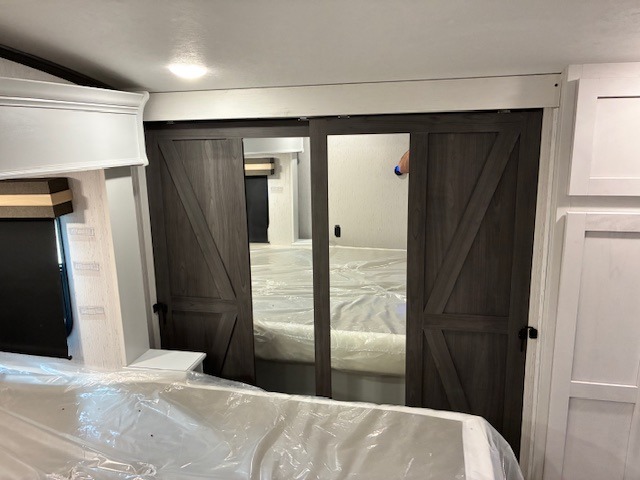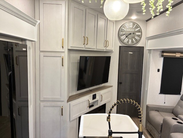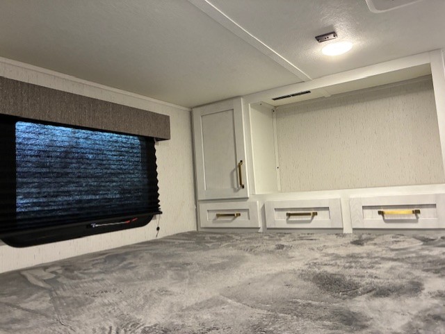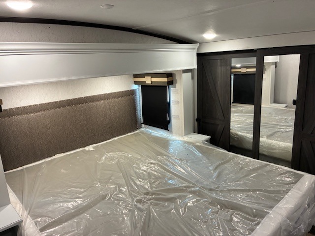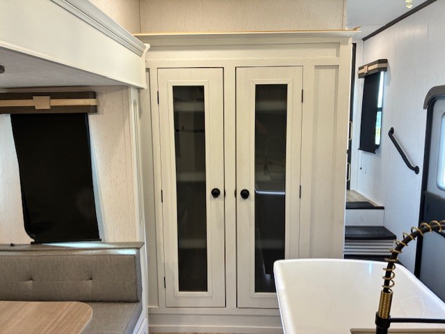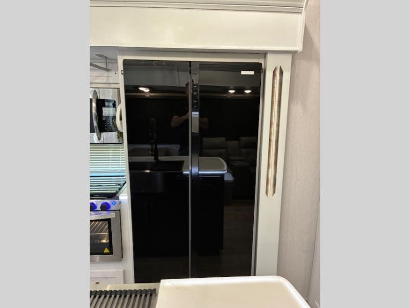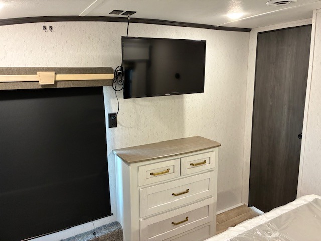 You will experience a smooth flow of traffic in and out of this fifth wheel with dual entry doors! One of the entrances even leads into the rear private bedroom which also has a 54" x 74" loft bed for storage or sleeping space, plus its very own half bathroom which will come in handy at night. The chef will enjoy preparing and serving meals using the kitchen island and all the amenities inside, plus they will enjoy cooking at the outdoor kitchen when wanting to be outside with everyone. Inside, there is a large pantry that is big enough to store everyone's favorite snacks, and the booth dinette offers a comfortable place to eat your meals or play card games. And the full bathroom has a dual sink vanity for two to get ready at once. When you're ready to wind down your nights, head to the front private bedroom and relax on the king bed slide!