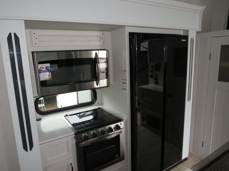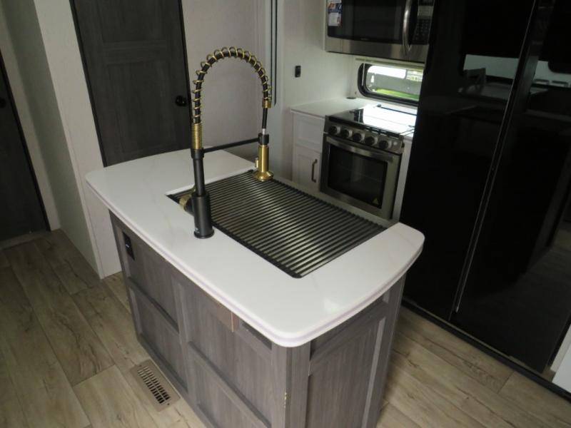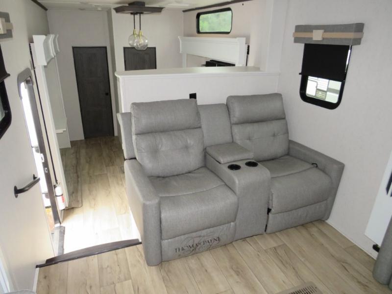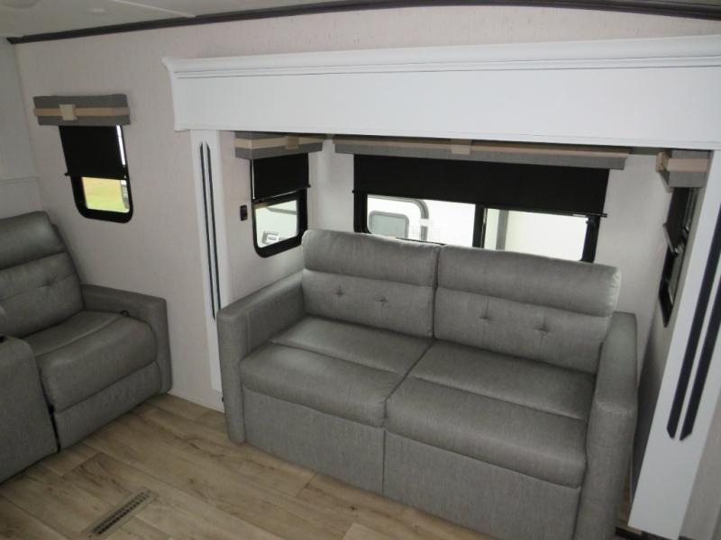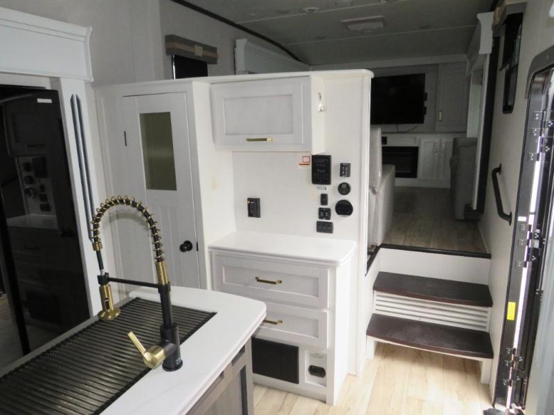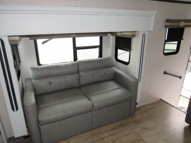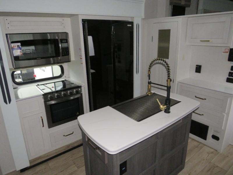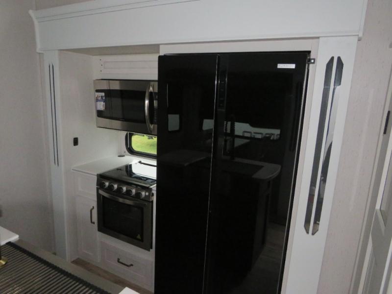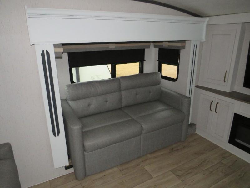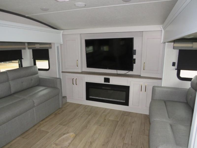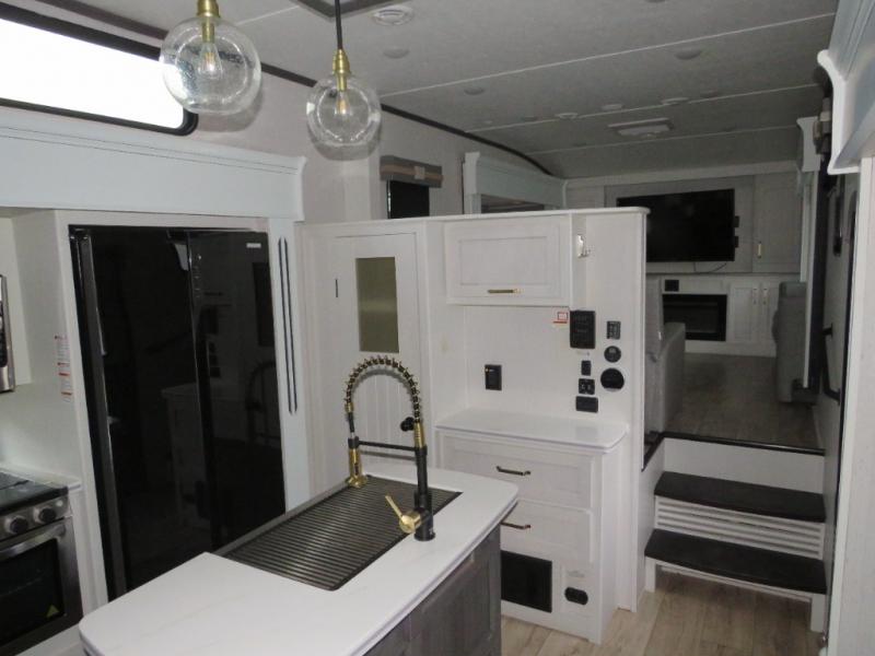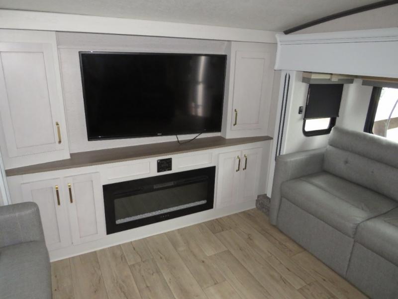 Experience a comfortable camping trip with this fifth wheel! The front living area not only has opposing sofa slides, but also theater seating across from an entertainment center with a 40" glass fireplace and a 50" LED TV. The separate kitchen has everything you will need to prepare delicious home cooked meals including a glass top three burner cooktop with a 21" oven and a kitchen island with a large sink that has a high rise faucet with sprayer for an easy clean up. There is even a half bathroom by the kitchen so you can use it and quickly get back to cooking. The primary suite has a king bed slide for more walking around space, an entertainment center for a comfortable movie night, and access to the spacious full rear bathroom with a dual sink vanity, storage and a space prepped for a washer/dryer option.