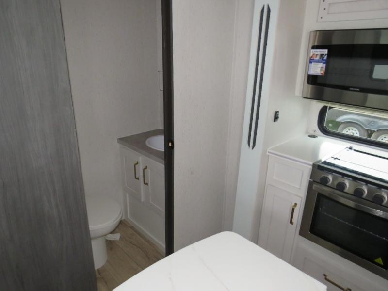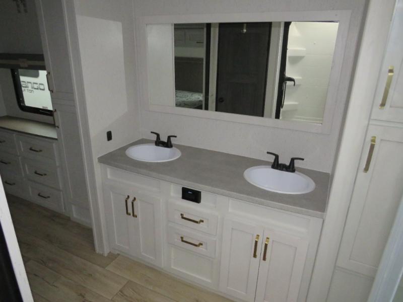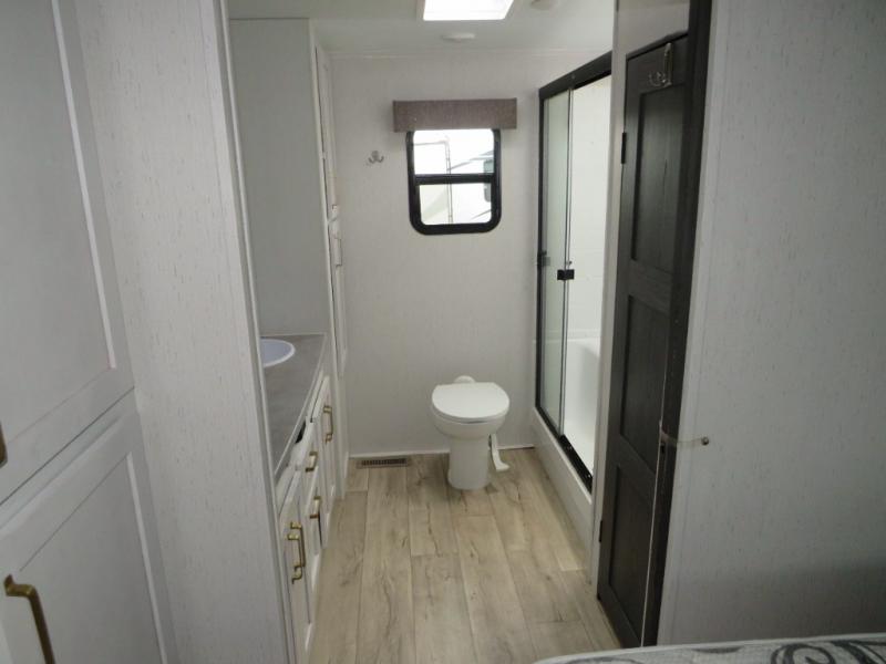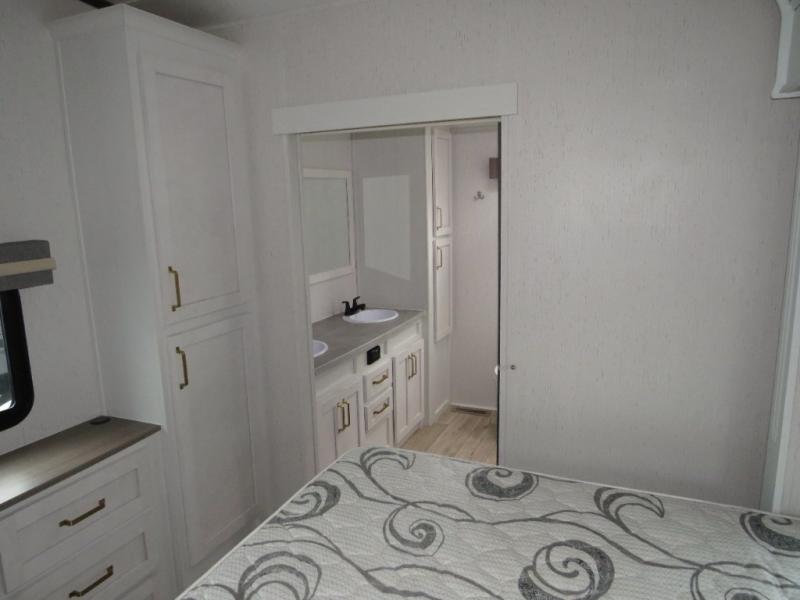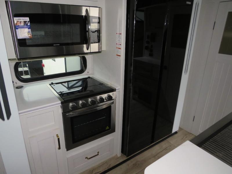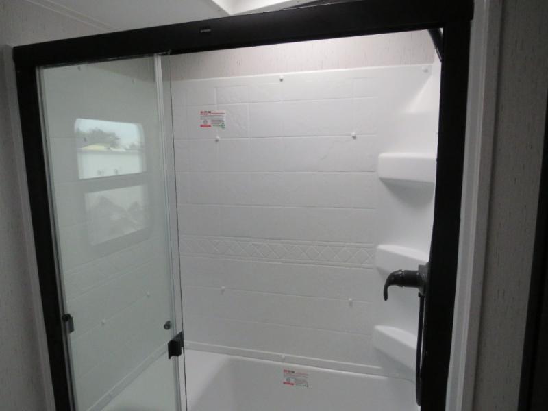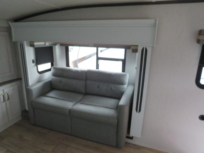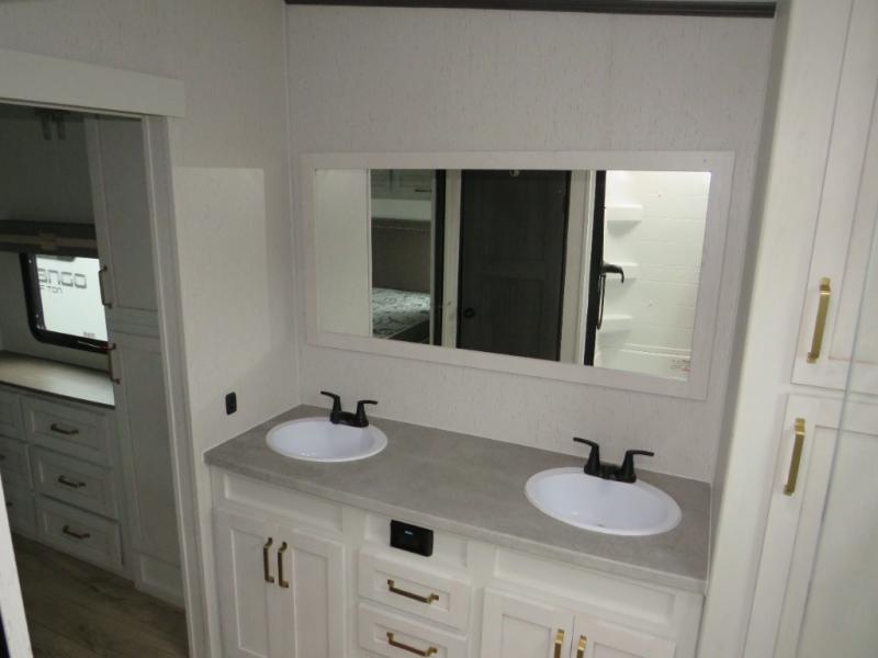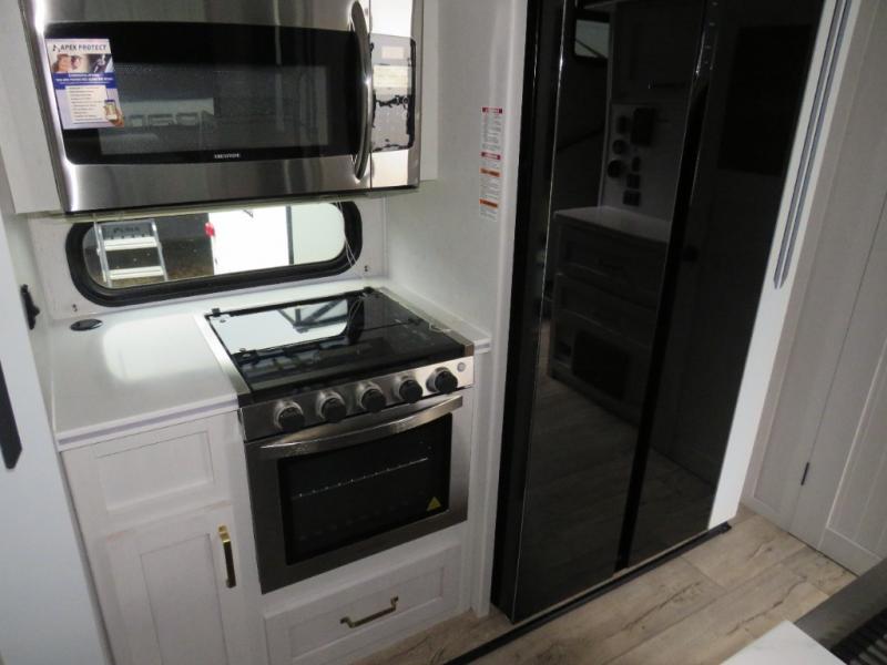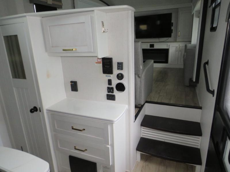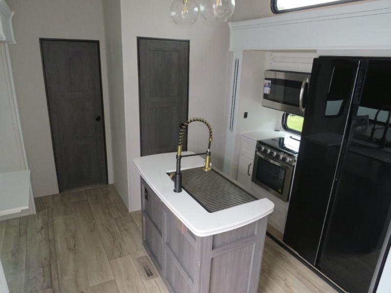 Experience a comfortable camping trip with this fifth wheel! The front living area not only has opposing sofa slides, but also theater seating across from an entertainment center with a 40" glass fireplace and a 50" LED TV. The separate kitchen has everything you will need to prepare delicious home cooked meals including a glass top three burner cooktop with a 21" oven and a kitchen island with a large sink that has a high rise faucet with sprayer for an easy clean up. There is even a half bathroom by the kitchen so you can use it and quickly get back to cooking. The primary suite has a king bed slide for more walking around space, an entertainment center for a comfortable movie night, and access to the spacious full rear bathroom with a dual sink vanity, storage and a space prepped for a washer/dryer option.