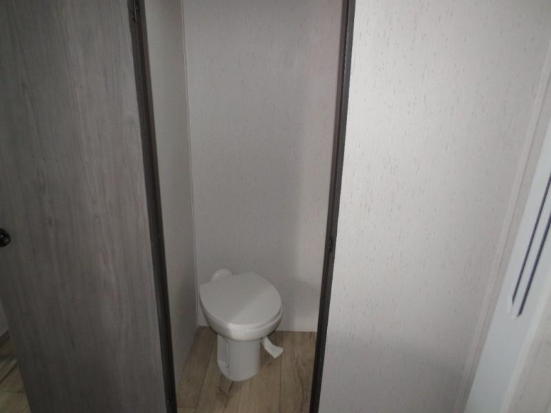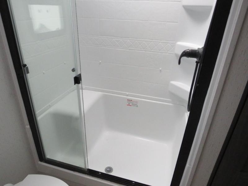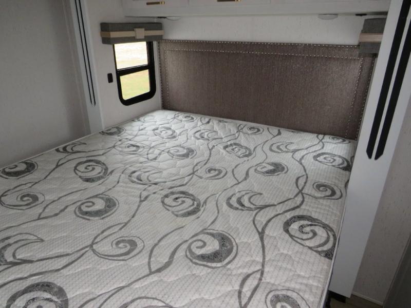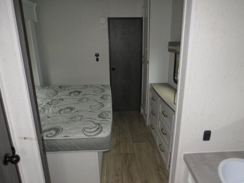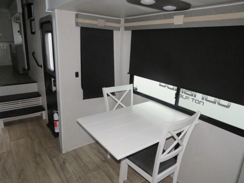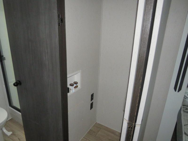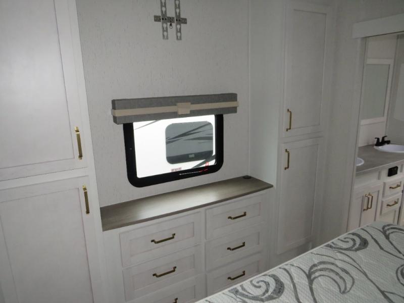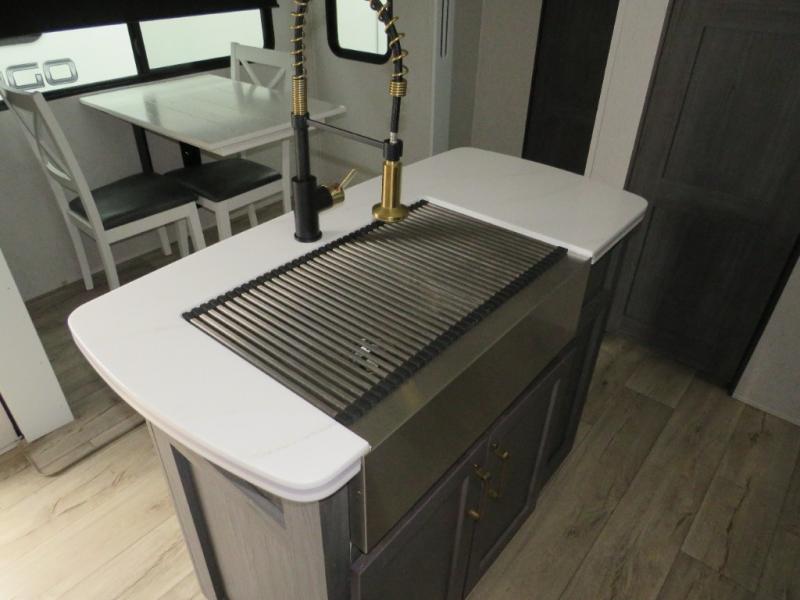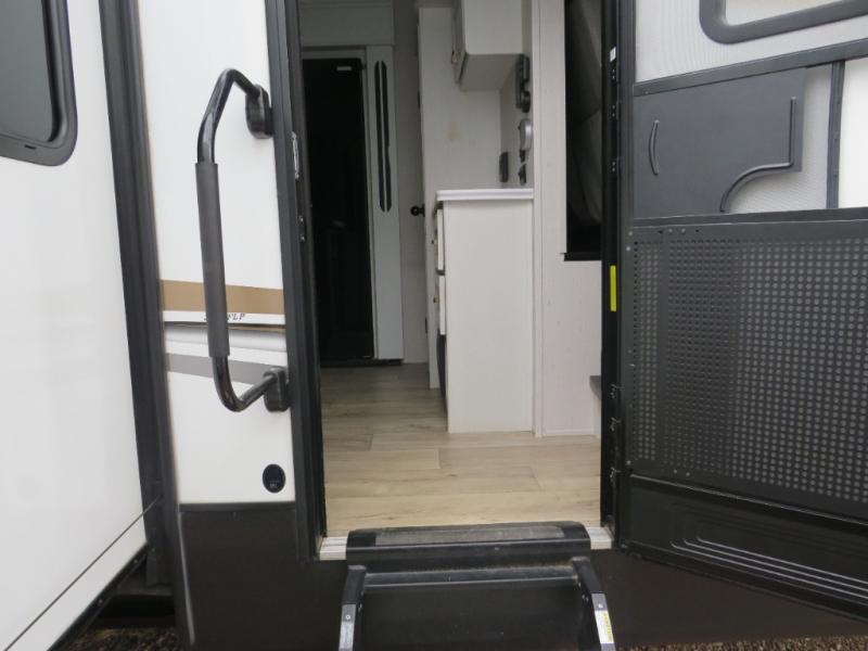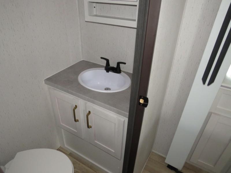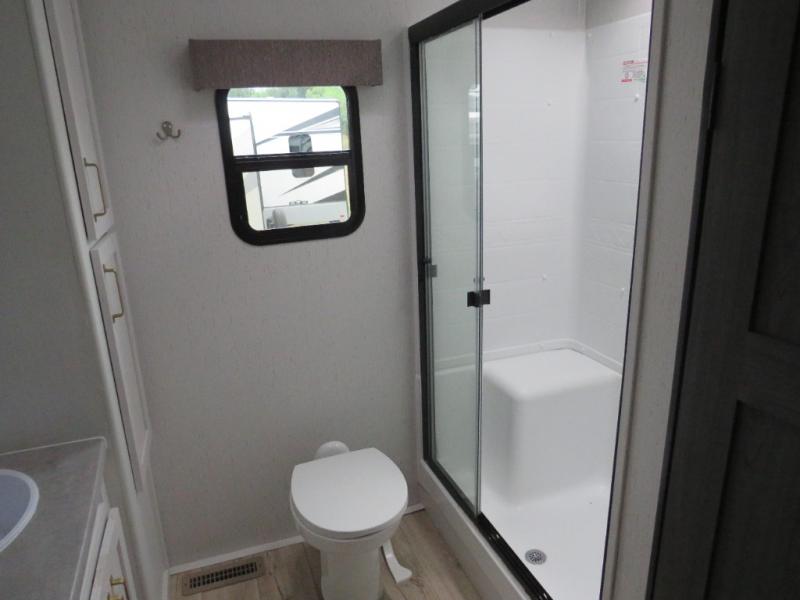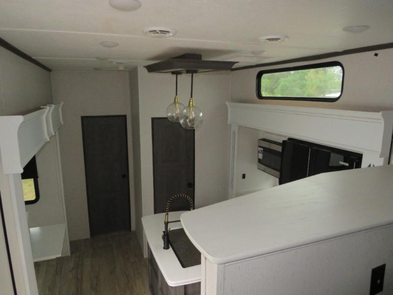 Experience a comfortable camping trip with this fifth wheel! The front living area not only has opposing sofa slides, but also theater seating across from an entertainment center with a 40" glass fireplace and a 50" LED TV. The separate kitchen has everything you will need to prepare delicious home cooked meals including a glass top three burner cooktop with a 21" oven and a kitchen island with a large sink that has a high rise faucet with sprayer for an easy clean up. There is even a half bathroom by the kitchen so you can use it and quickly get back to cooking. The primary suite has a king bed slide for more walking around space, an entertainment center for a comfortable movie night, and access to the spacious full rear bathroom with a dual sink vanity, storage and a space prepped for a washer/dryer option.