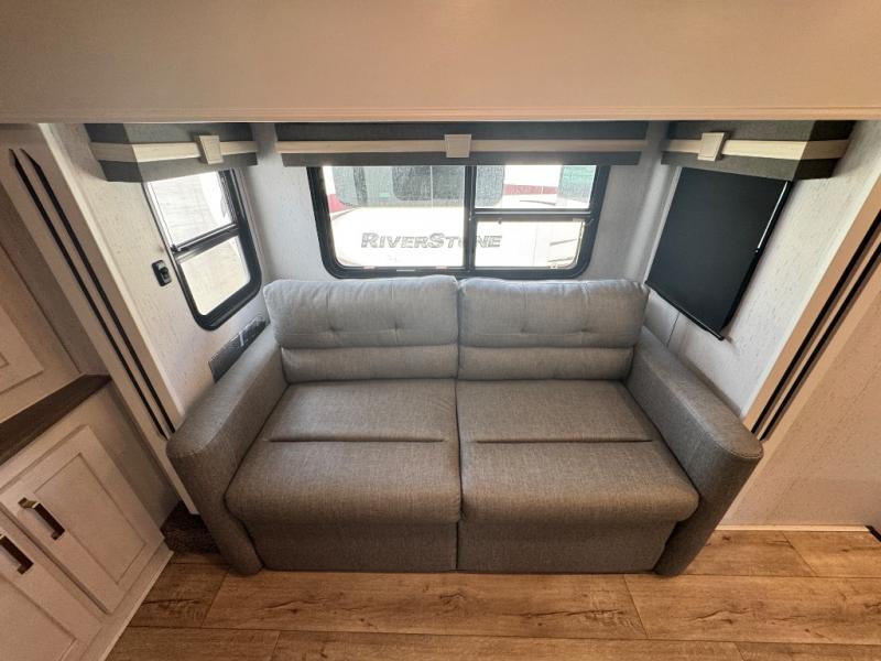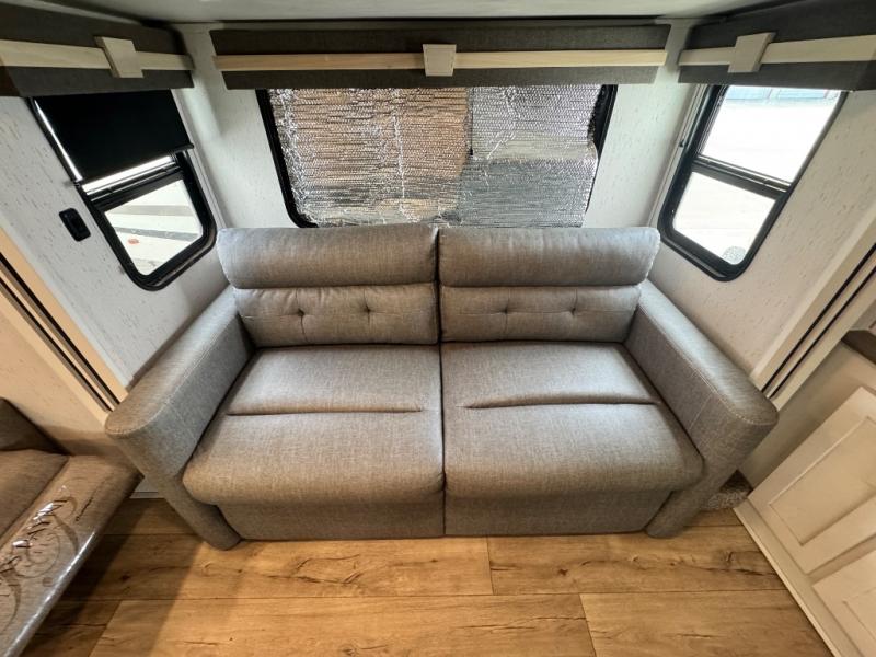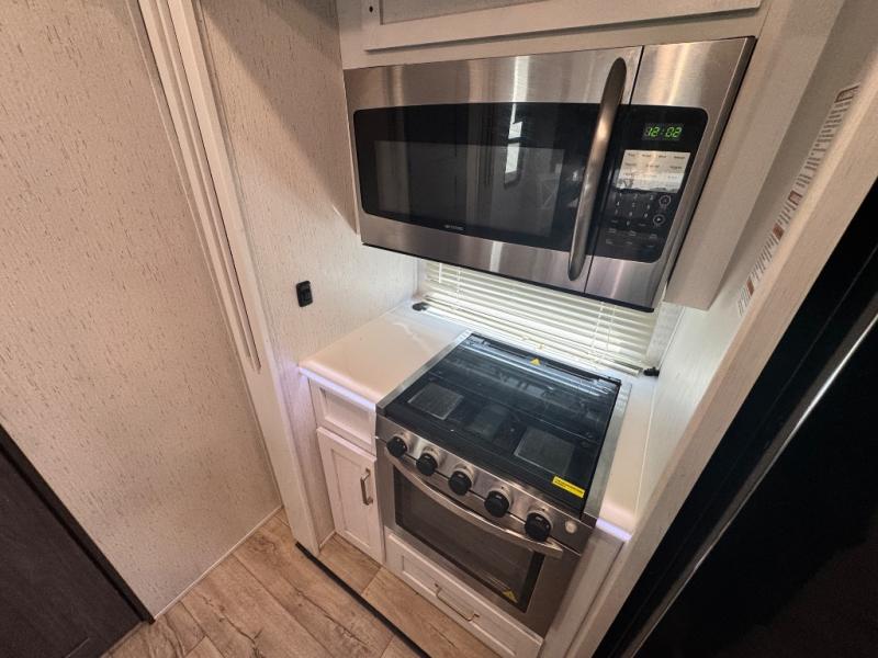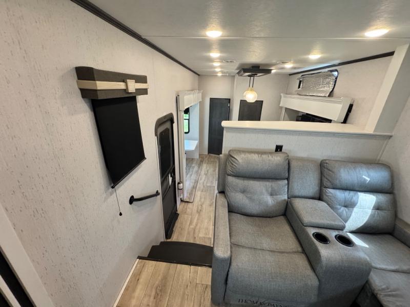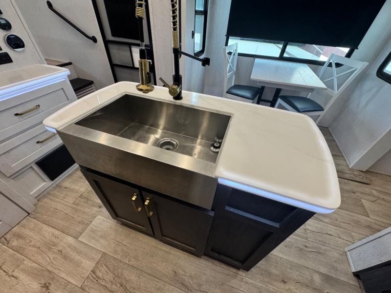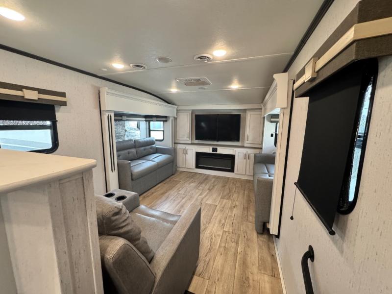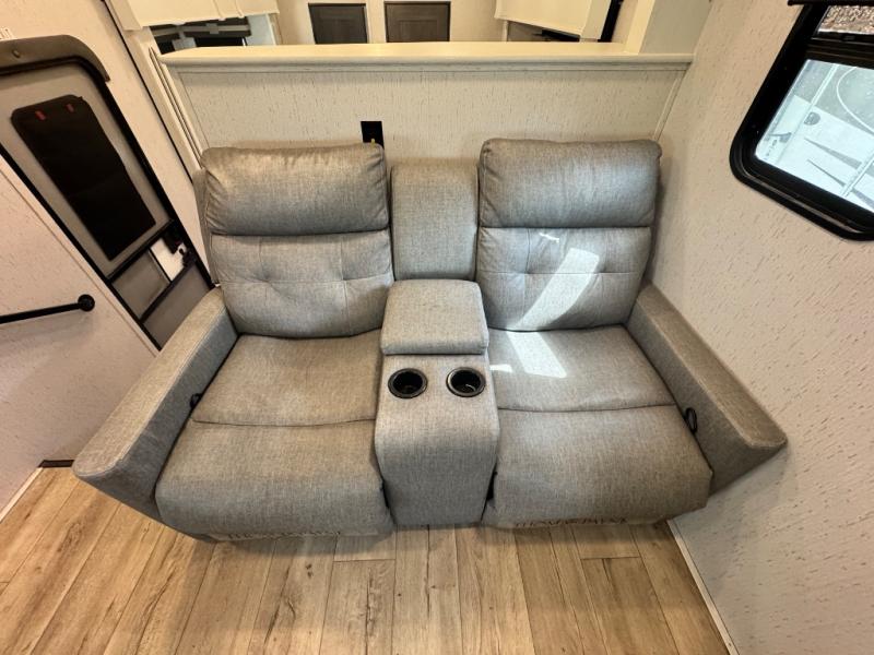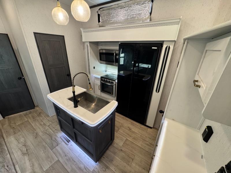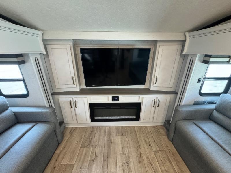 Experience a comfortable camping trip with this fifth wheel! The front living area not only has opposing sofa slides, but also theater seating across from an entertainment center with a 40" glass fireplace and a 50" LED TV. The separate kitchen has everything you will need to prepare delicious home cooked meals including a glass top three burner cooktop with a 21" oven and a kitchen island with a large sink that has a high rise faucet with sprayer for an easy clean up. There is even a half bathroom by the kitchen so you can use it and quickly get back to cooking. The master suite has a king bed slide for more walking around space, an entertainment center for a comfortable movie night, and access to the spacious full rear bathroom with a dual sink vanity, storage and a space prepped for a washer/dryer option.