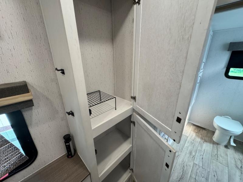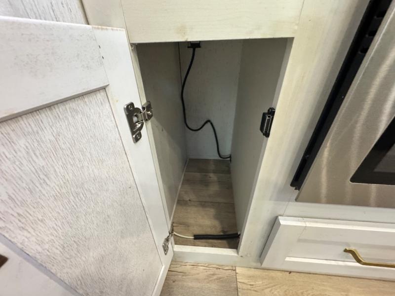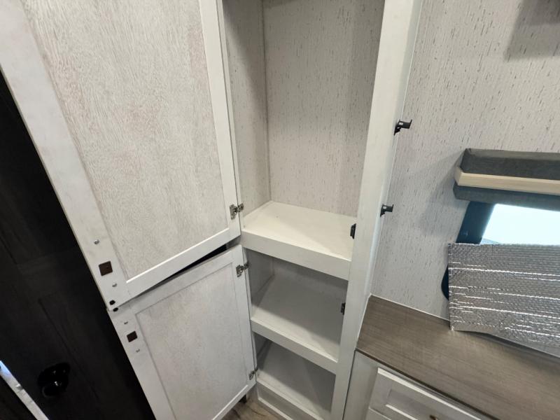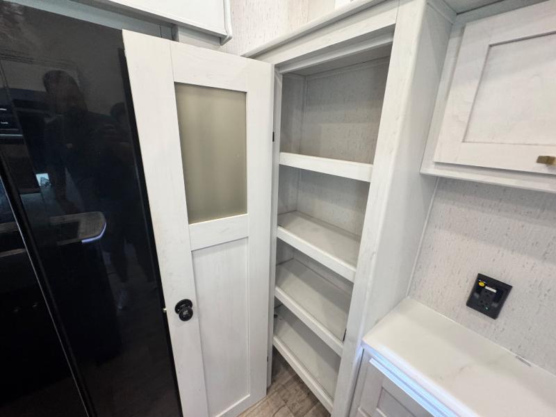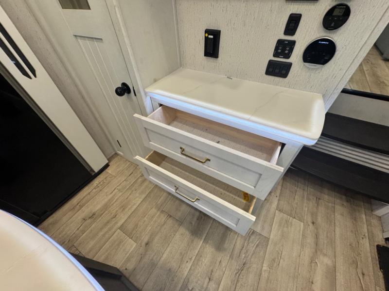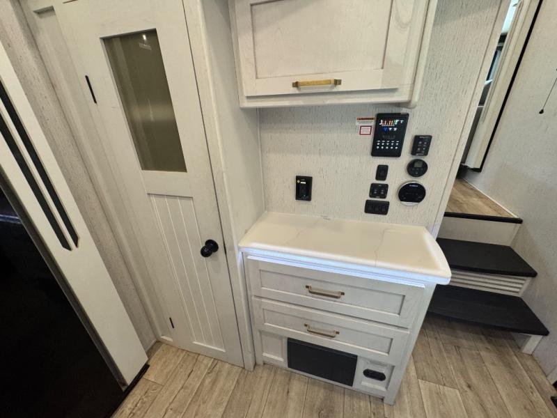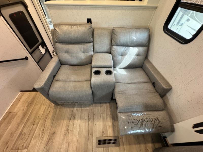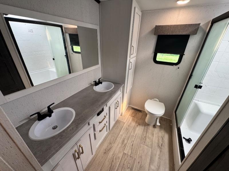 Experience a comfortable camping trip with this fifth wheel! The front living area not only has opposing sofa slides, but also theater seating across from an entertainment center with a 40" glass fireplace and a 50" LED TV. The separate kitchen has everything you will need to prepare delicious home cooked meals including a glass top three burner cooktop with a 21" oven and a kitchen island with a large sink that has a high rise faucet with sprayer for an easy clean up. There is even a half bathroom by the kitchen so you can use it and quickly get back to cooking. The master suite has a king bed slide for more walking around space, an entertainment center for a comfortable movie night, and access to the spacious full rear bathroom with a dual sink vanity, storage and a space prepped for a washer/dryer option.