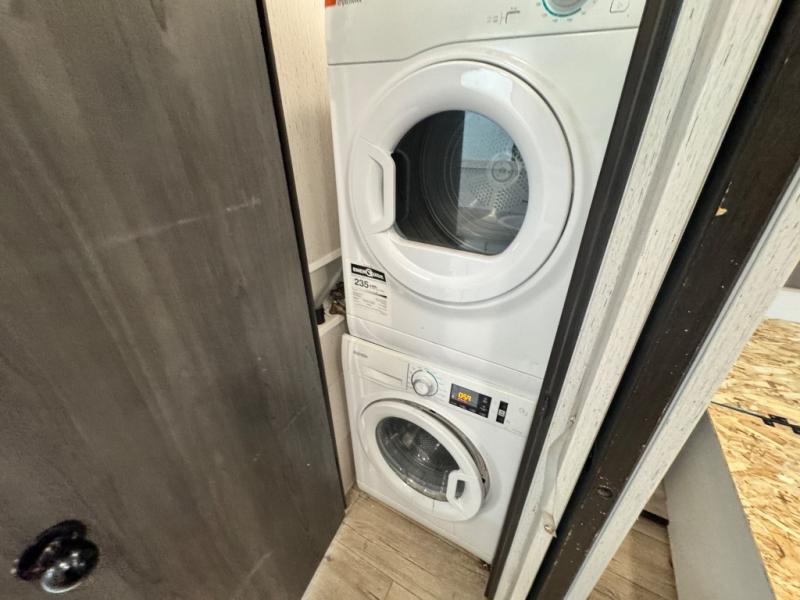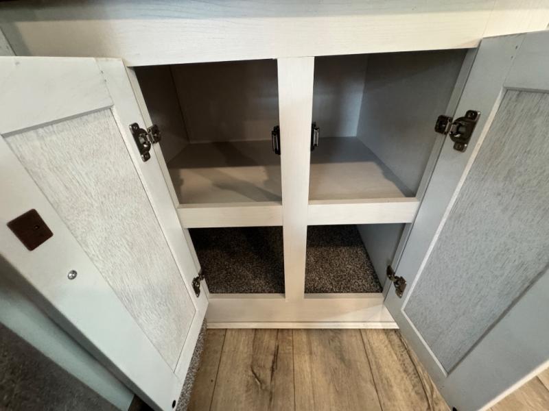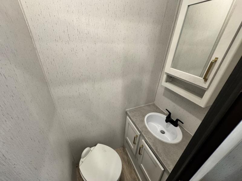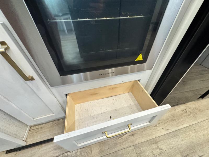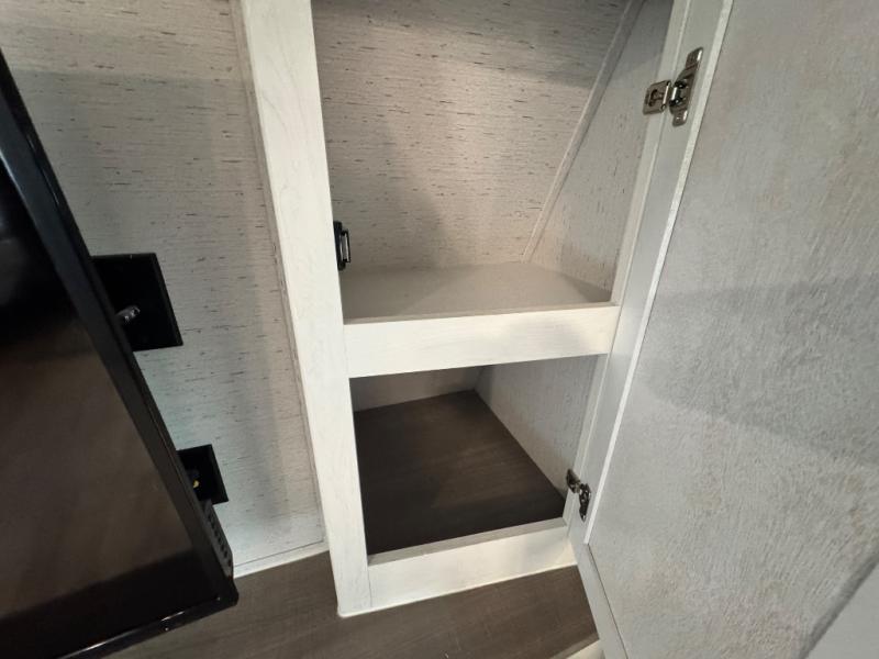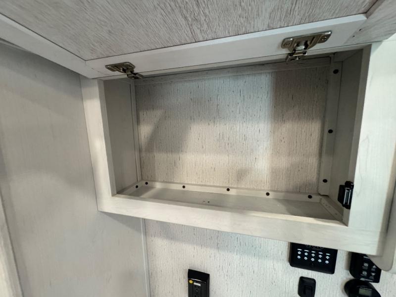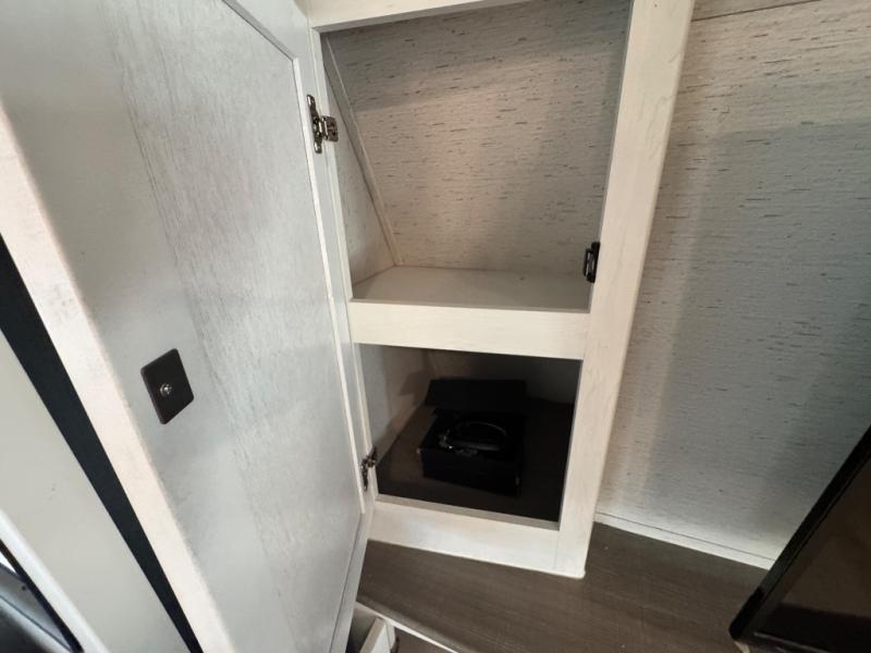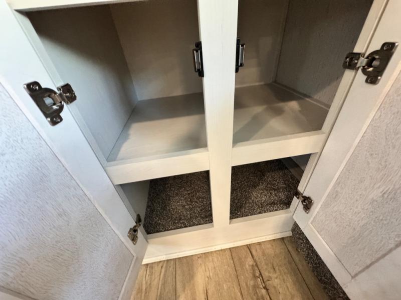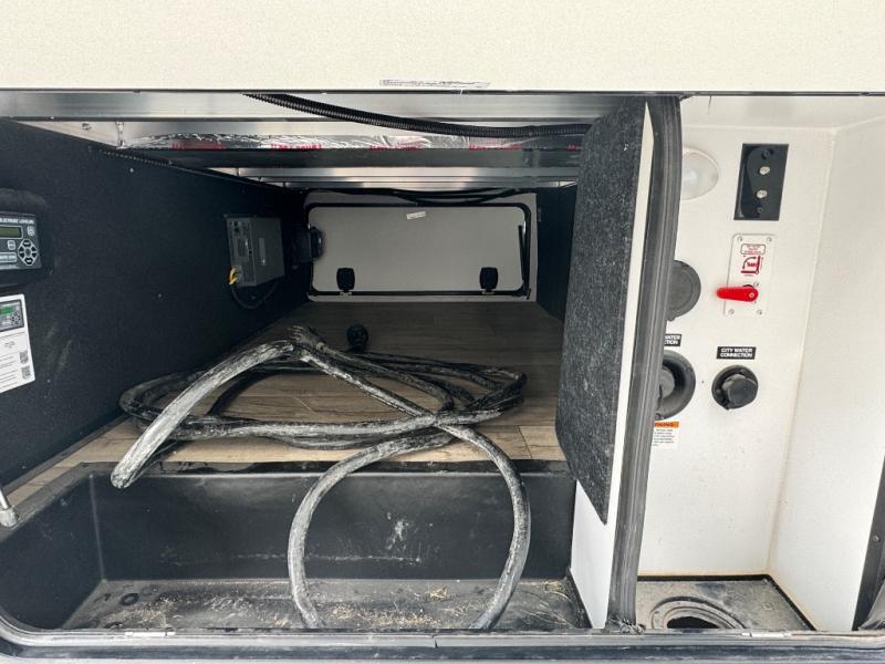 Experience a comfortable camping trip with this fifth wheel! The front living area not only has opposing sofa slides, but also theater seating across from an entertainment center with a 40" glass fireplace and a 50" LED TV. The separate kitchen has everything you will need to prepare delicious home cooked meals including a glass top three burner cooktop with a 21" oven and a kitchen island with a large sink that has a high rise faucet with sprayer for an easy clean up. There is even a half bathroom by the kitchen so you can use it and quickly get back to cooking. The master suite has a king bed slide for more walking around space, an entertainment center for a comfortable movie night, and access to the spacious full rear bathroom with a dual sink vanity, storage and a space prepped for a washer/dryer option.