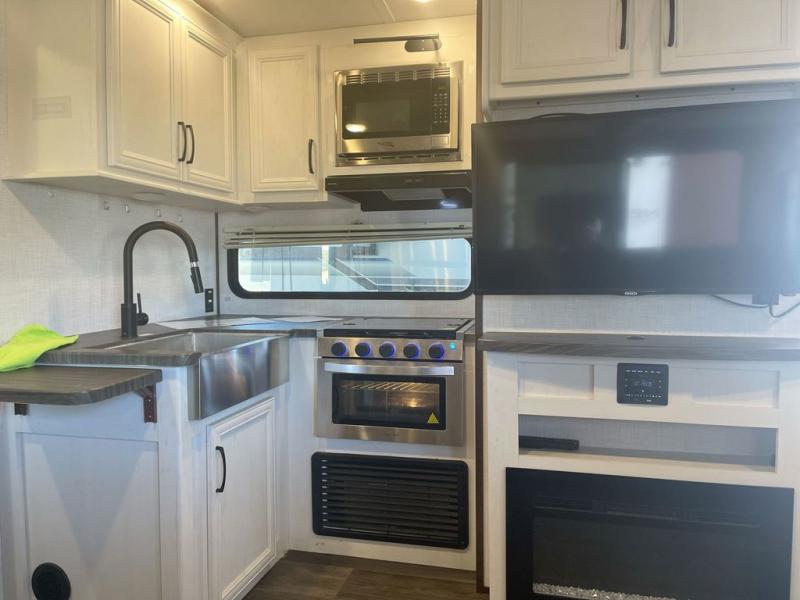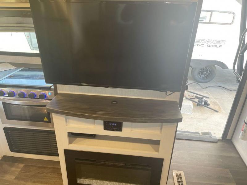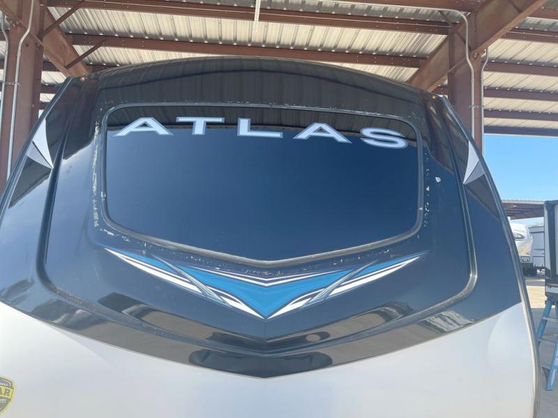 You and your spouse can have your own getaway whenever you want with this Atlas travel trailer! This trailer is perfectly suited for two people to enjoy camping, and it comes with everything needed to make you both feel comfortable, like a private bedroom with king-size bed, a 78" chaise lounge with removable table, a full rear bathroom, and a complete kitchen with countertop extension. You even have some extra amenities that put the cherry on top, like the entertainment center with an LED HDTV and fireplace below and the pop-up power station in the kitchen.