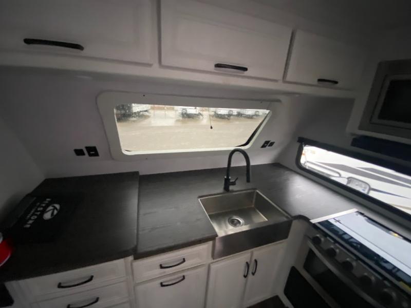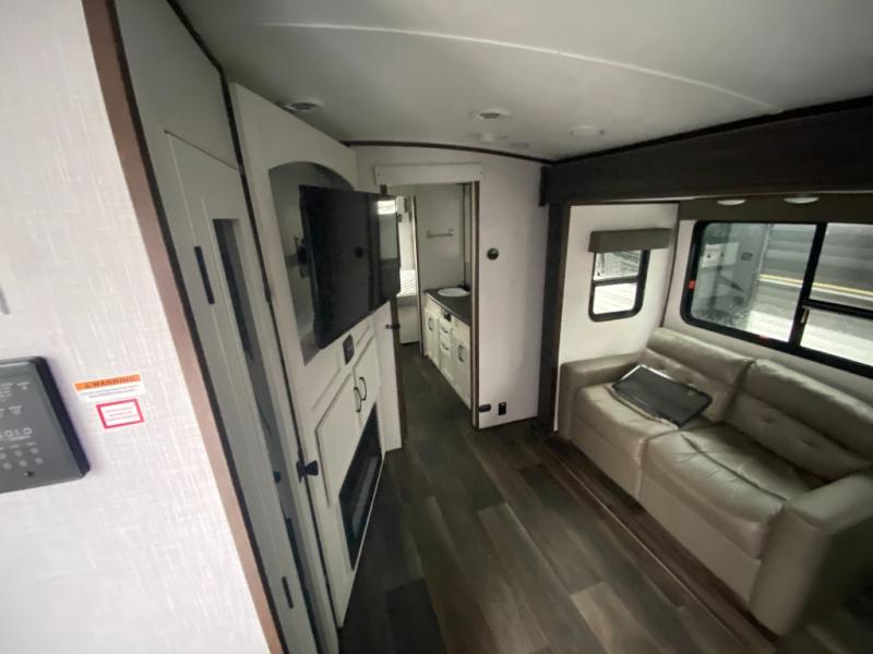 The central living space offers generous seating and natural light, making it perfect for relaxing after a day of exploring. Slideouts expand the living footprint, creating an open, inviting interior.