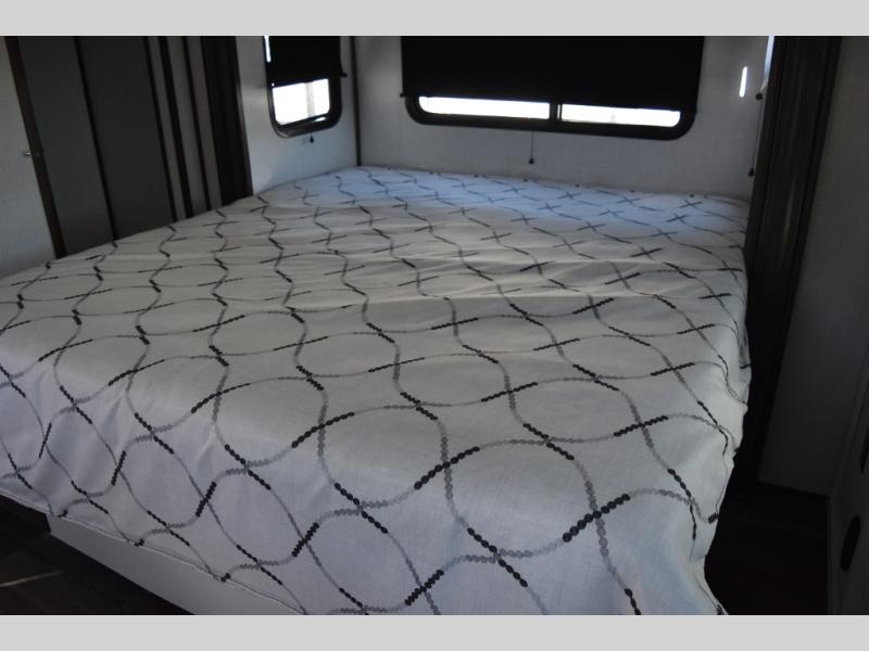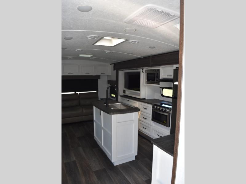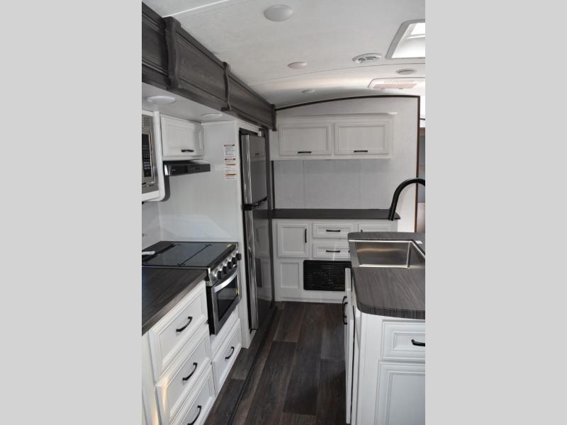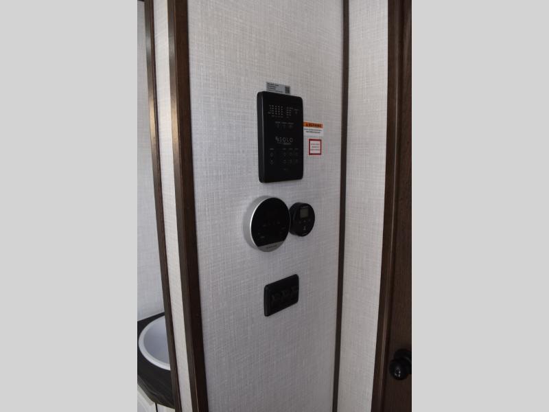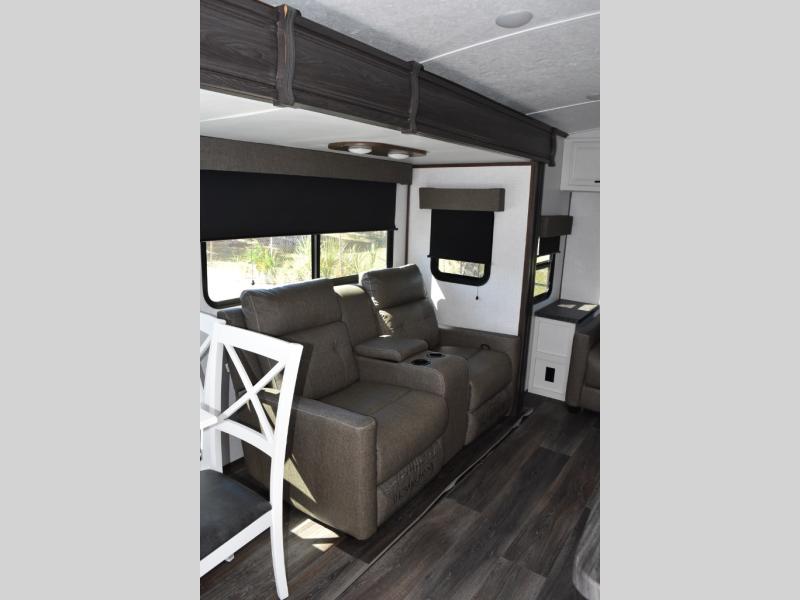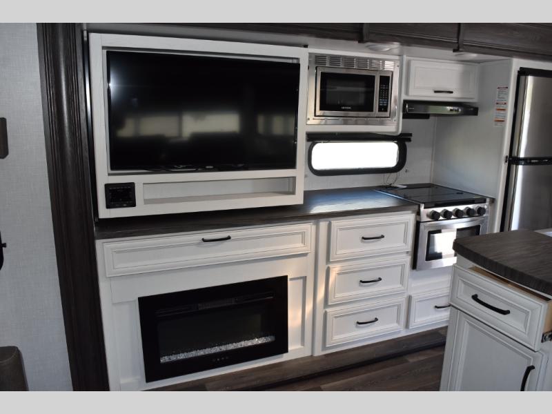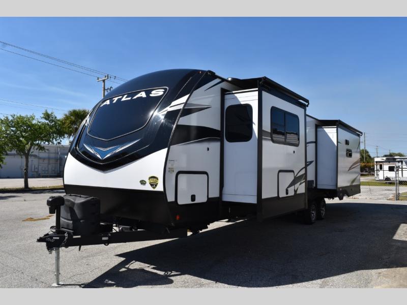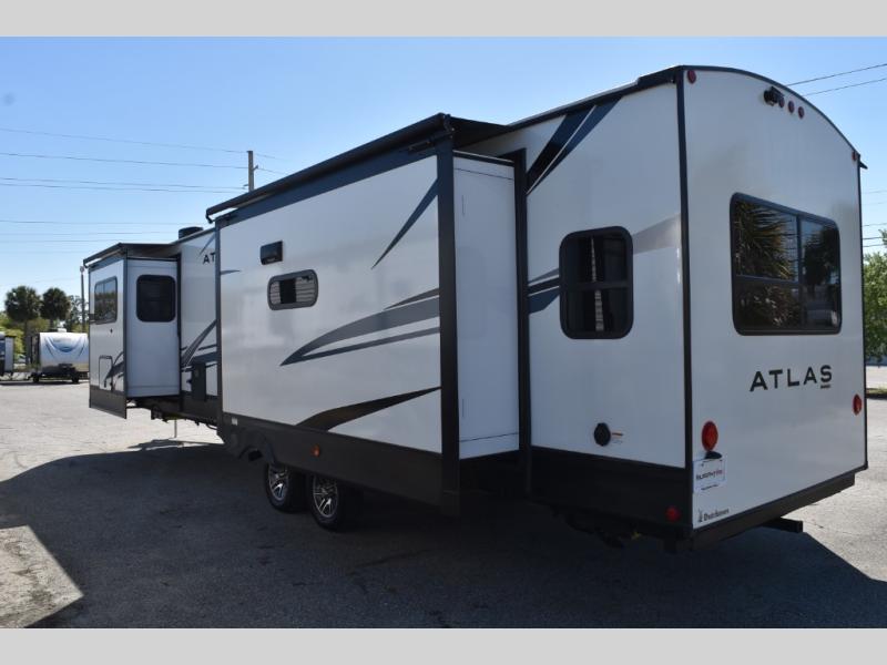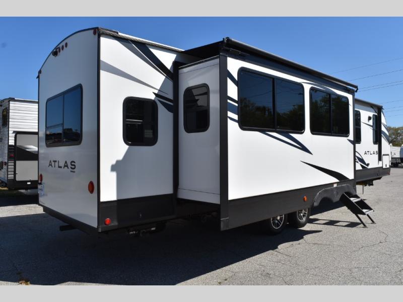 Take this Atlas travel trailer out for a weekend of adventure! You will have plenty of amenities to keep you comfortable, like the fireplace, king-size bed, sofa, theater seating, and full bathroom. You will also have great space with the slide out in the bedroom and the opposing slides in the living area. A free-standing dinette gives you a place to sit down with a bowl of soup, and the large pantry will help you store the ingredients needed to make that soup. There is a pop-up power station in the kitchen as well as solid-surface countertops for years of use.