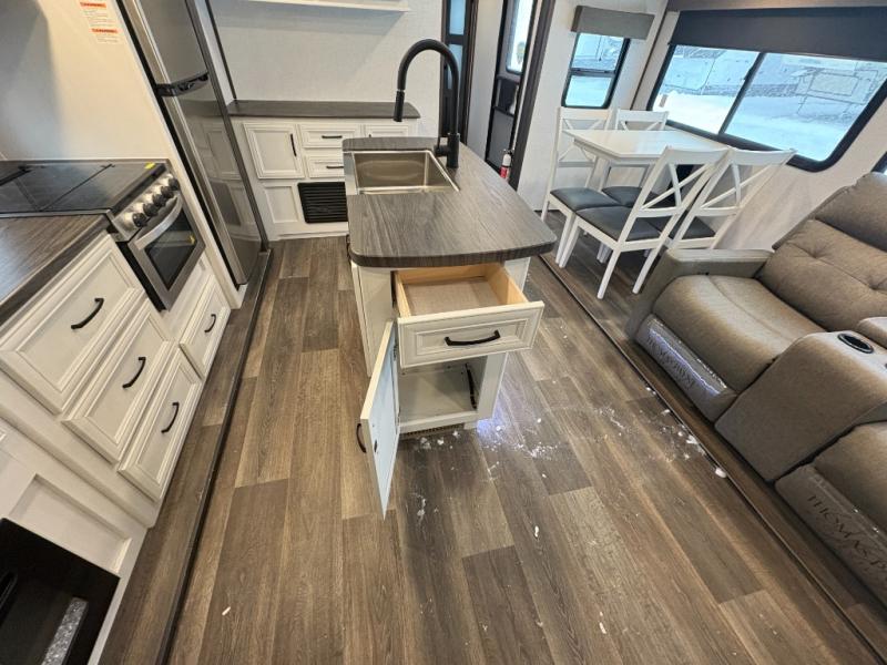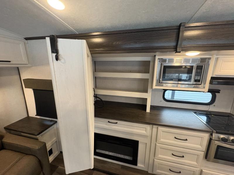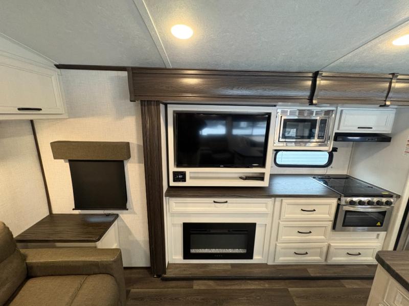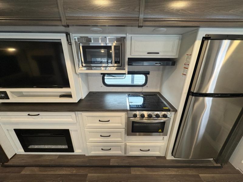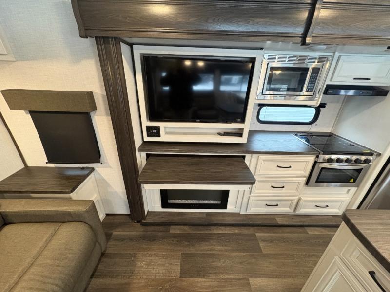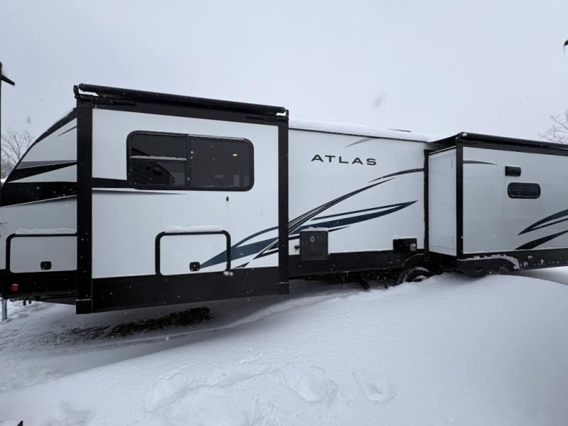 Take this Atlas travel trailer out for a weekend of adventure! You will have plenty of amenities to keep you comfortable, like the fireplace, king-size bed, sofa, theater seating, and full bathroom. You will also have great space with the slide out in the bedroom and the opposing slides in the living area. A free-standing dinette gives you a place to sit down with a bowl of soup, and the large pantry will help you store the ingredients needed to make that soup. There is a pop-up power station in the kitchen as well as solid-surface countertops for years of use.