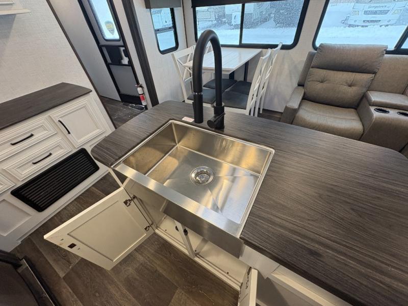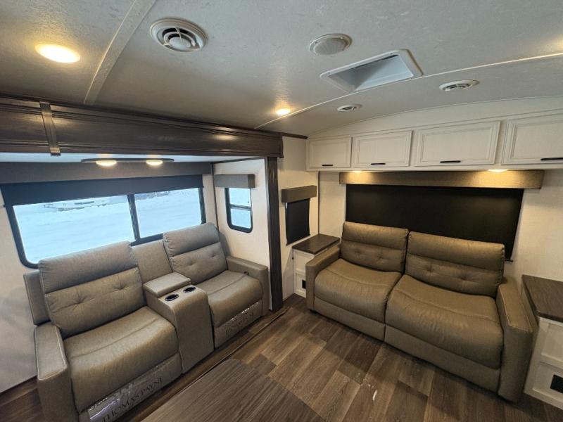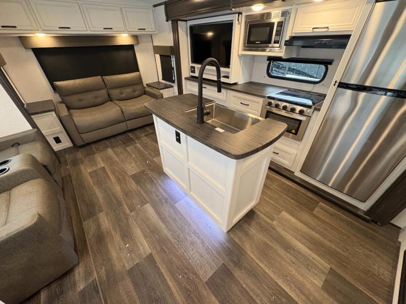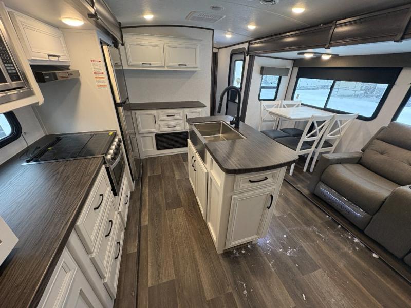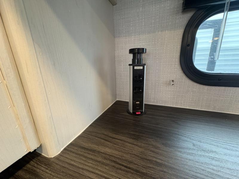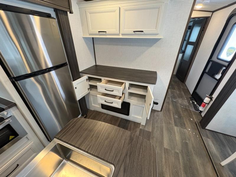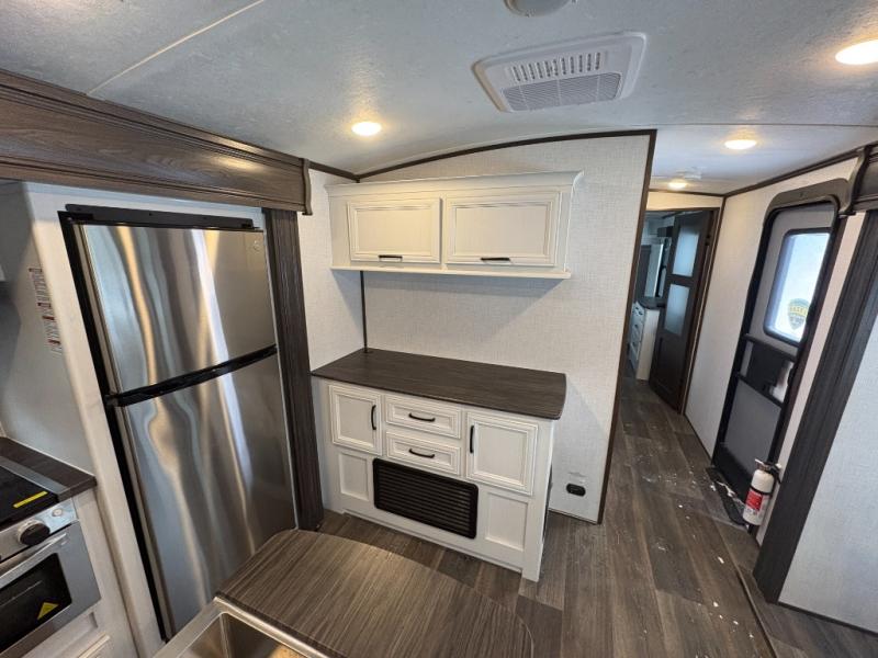 Take this Atlas travel trailer out for a weekend of adventure! You will have plenty of amenities to keep you comfortable, like the fireplace, king-size bed, sofa, theater seating, and full bathroom. You will also have great space with the slide out in the bedroom and the opposing slides in the living area. A free-standing dinette gives you a place to sit down with a bowl of soup, and the large pantry will help you store the ingredients needed to make that soup. There is a pop-up power station in the kitchen as well as solid-surface countertops for years of use.