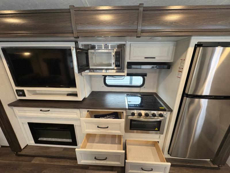 Journeys have never been more fun or packed with amenities than with the Dutchmen Atlas fifth wheel or travel trailer! These units come equipped with outside speakers, preparations for a backup camera, an oversized lighted pass-through storage, and a fully enclosed and heated underbelly. The friction-hinge entry door won't fly away when you open it, and the exterior spray port lets you hook up a hose to provide water when you need it. The fifth wheels have an electric four-point leveling system, and the travel trailers have electric stabilizer jacks. A painted fiberglass front cap protects the front portion of your Atlas, and the electric adjustable awning with LED lights is going to allow you to party outside with shade when you want it.