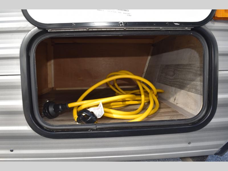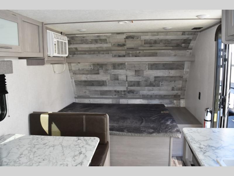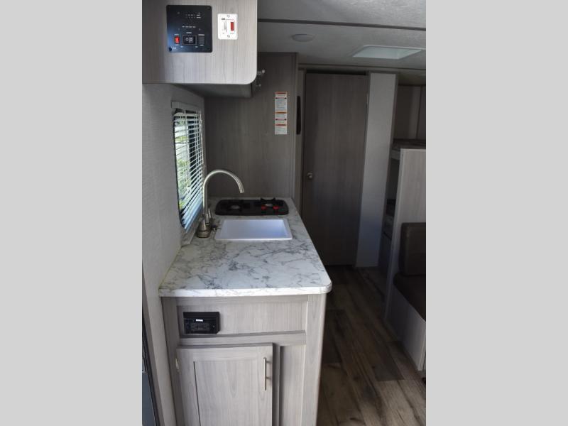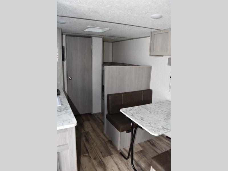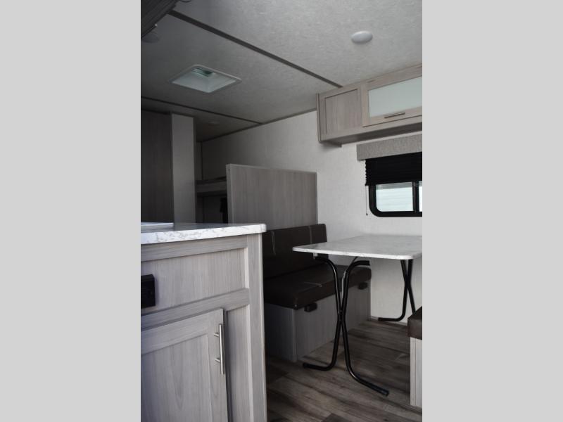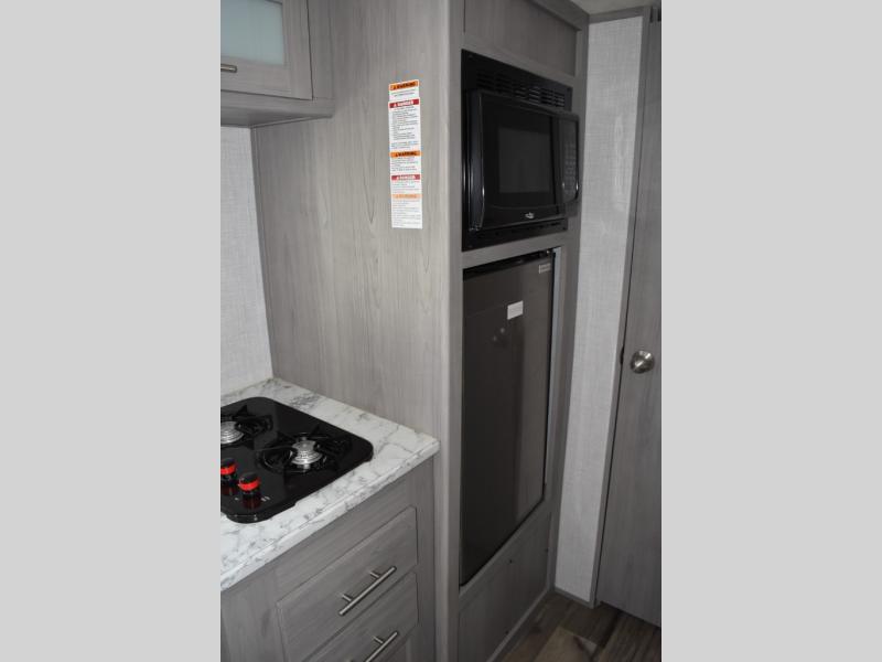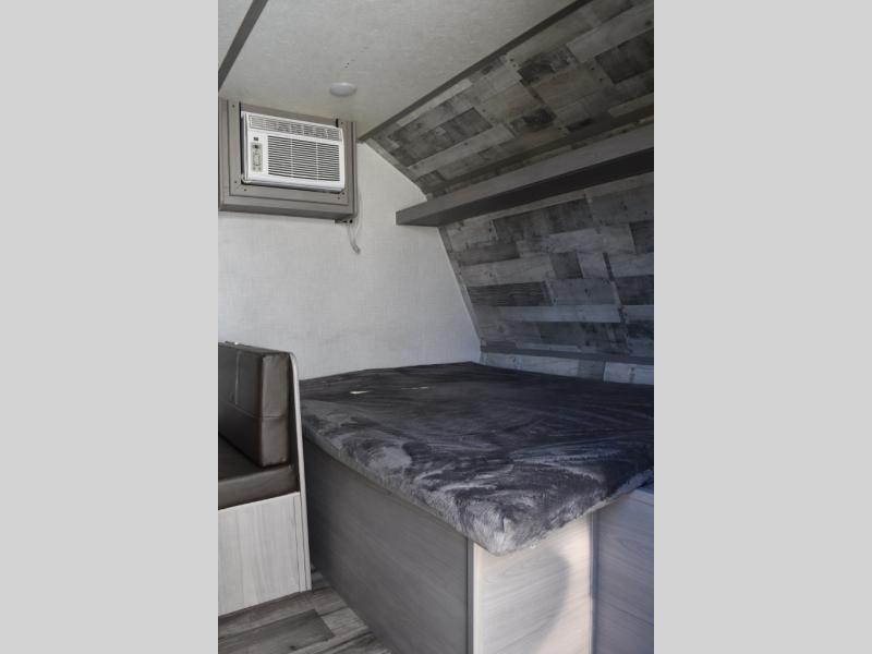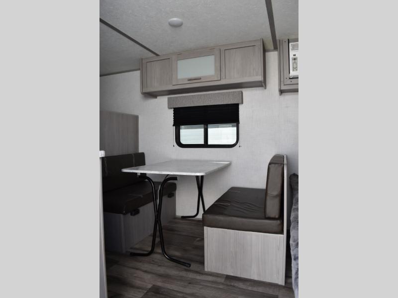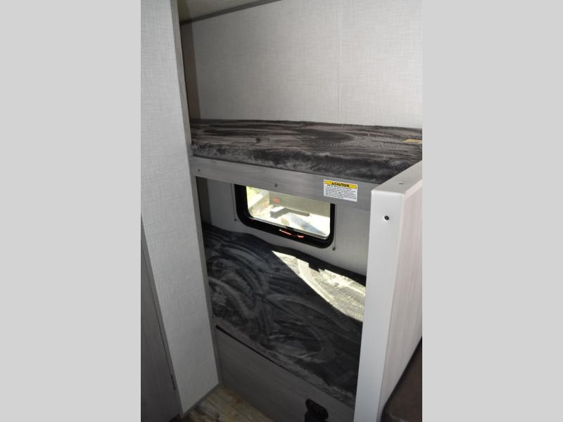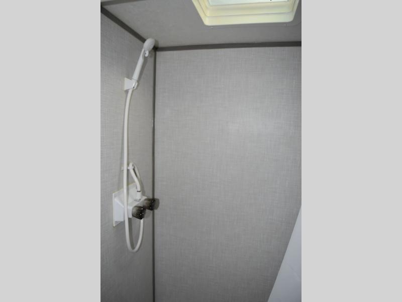 After making dinner on the two burner cooktop or inside the microwave, you can dine at the booth dinette or outside under the 8' power awning if you brought along your camping chairs. Either way you will be comfortable and the dinette may even sleep one person if needed. After playing outdoors all day, everyone can return to get cleaned up in the private toilet and shower room then fall asleep on the queen bed up front or the bunk beds in the rear. And everyone can wake up the next morning to do it over again.