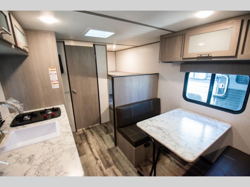 After making dinner on the two burner cooktop or inside the microwave, you can dine at the booth dinette or outside under the 8' power awning if you brought along your camping chairs. Either way you will be comfortable and the dinette may even sleep one person if needed. After playing outdoors all day, everyone can return to get cleaned up in the private toilet and shower room then fall asleep on the queen bed up front or the bunk beds in the rear. And everyone can wake up the next morning to do it over again.