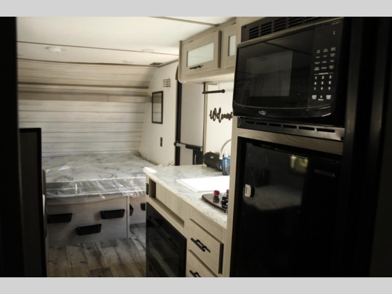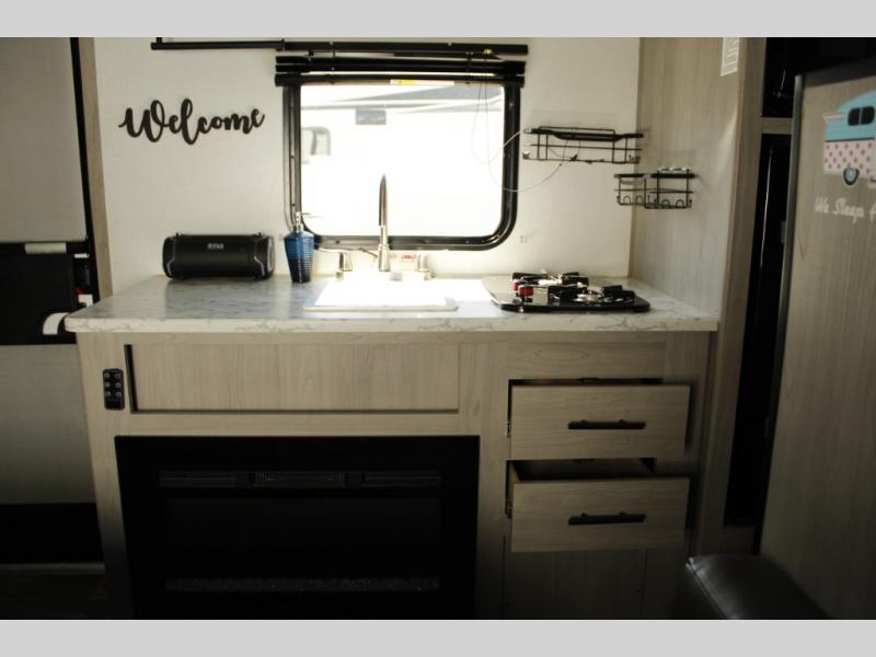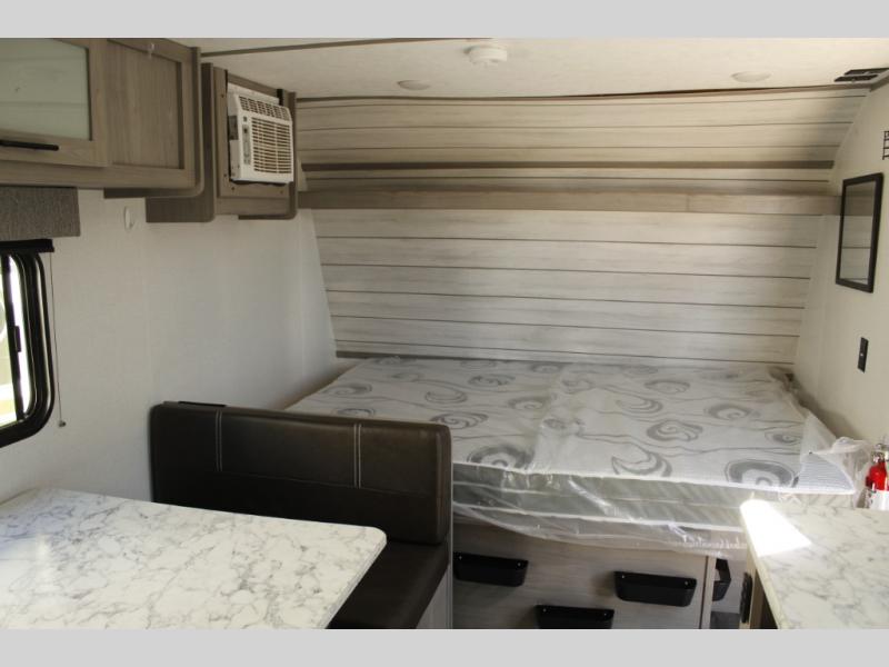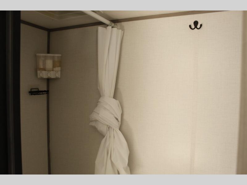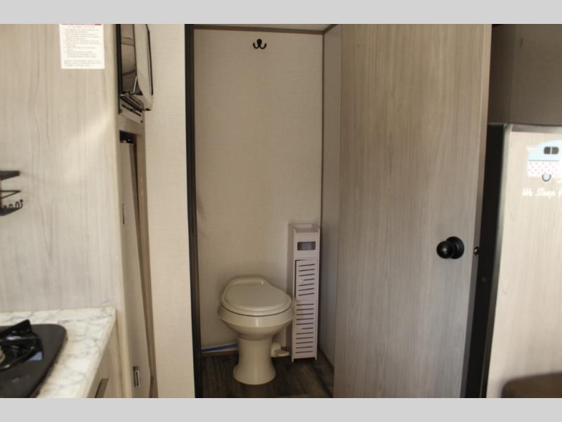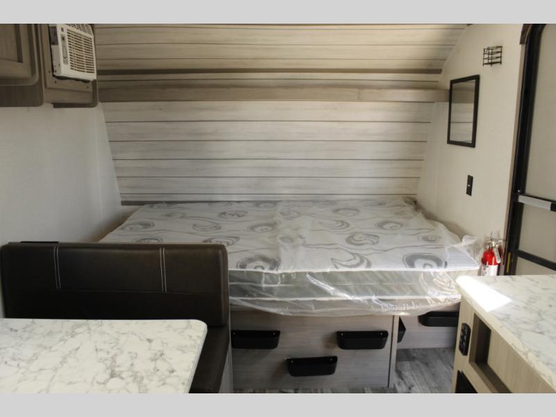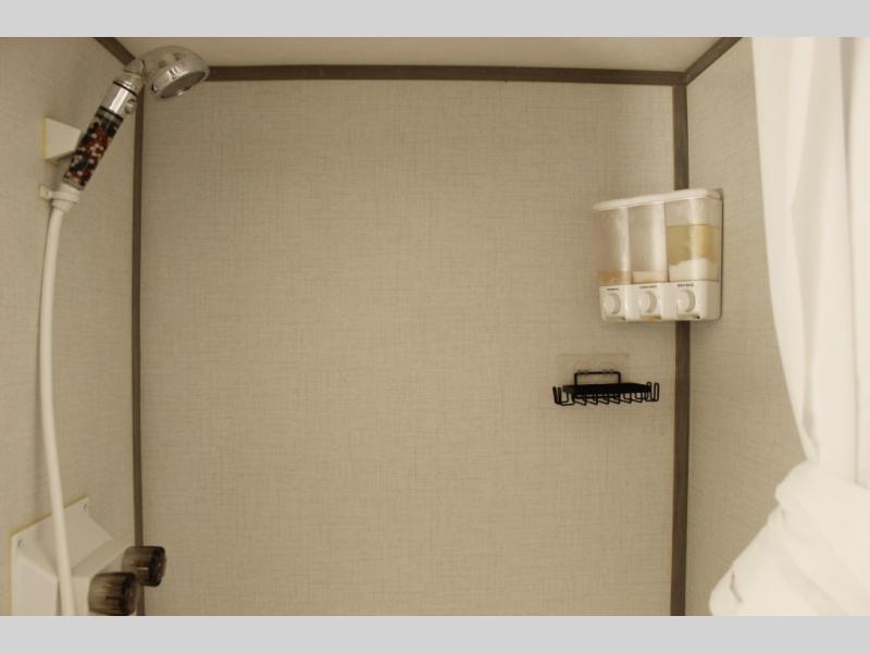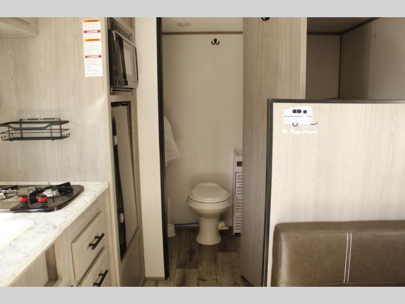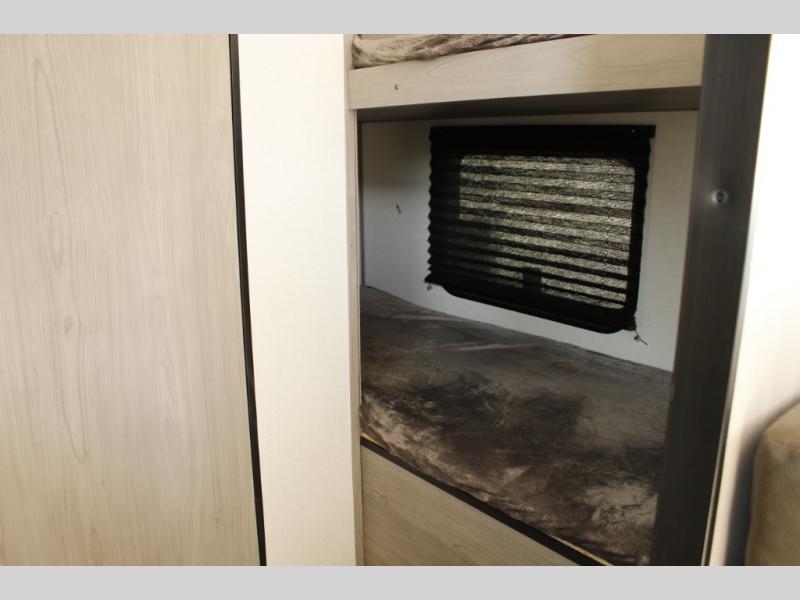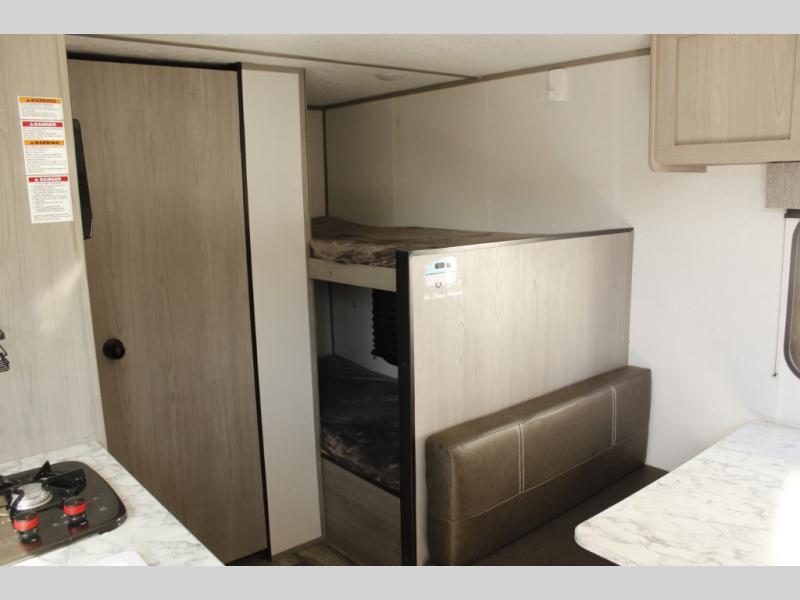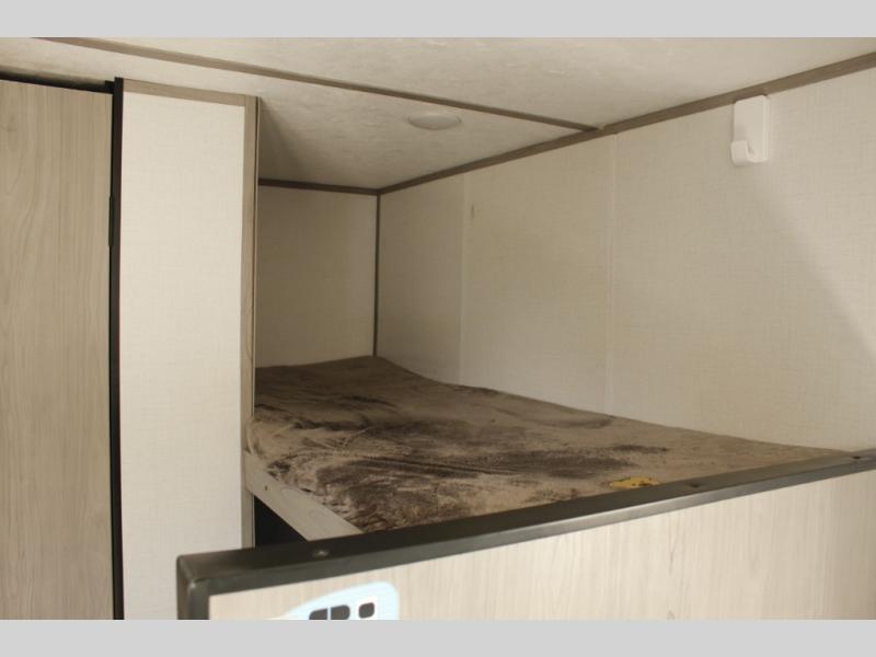 After making dinner on the two burner cooktop or inside the microwave, you can dine at the booth dinette or outside under the 8' power awning if you brought along your camping chairs. Either way you will be comfortable and the dinette may even sleep one person if needed. After playing outdoors all day, everyone can return to get cleaned up in the private toilet and shower room then fall asleep on the queen bed up front or the bunk beds in the rear. And everyone can wake up the next morning to do it over again.