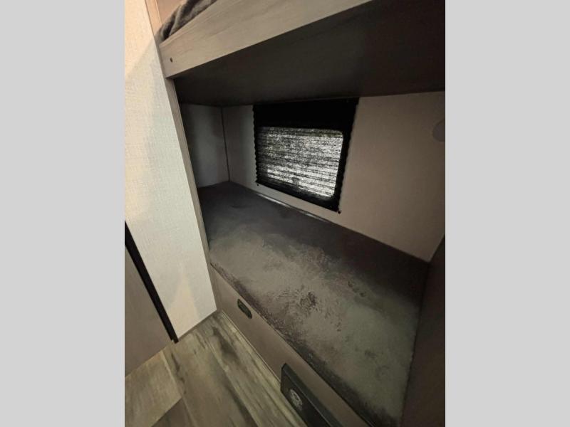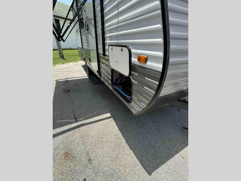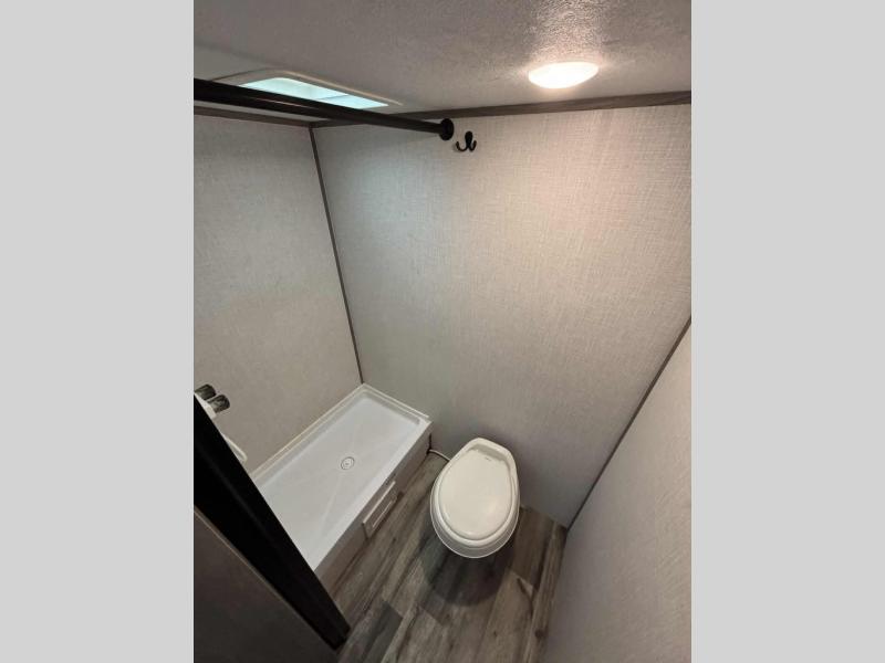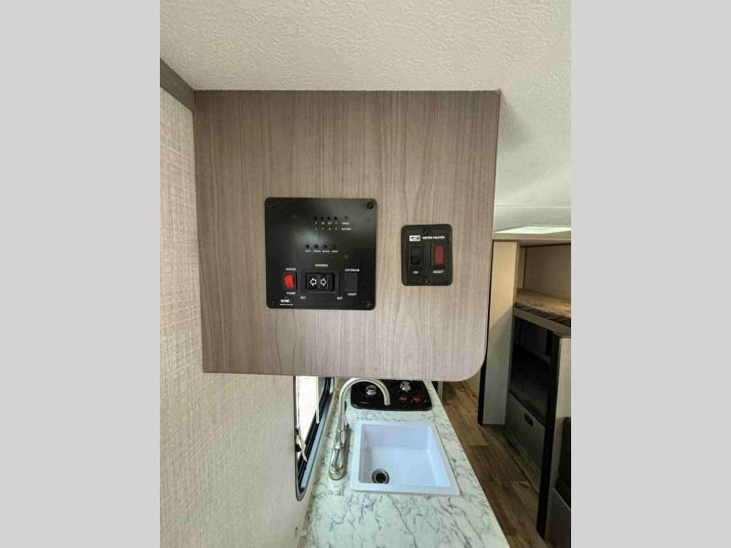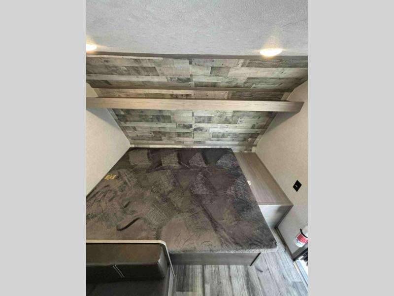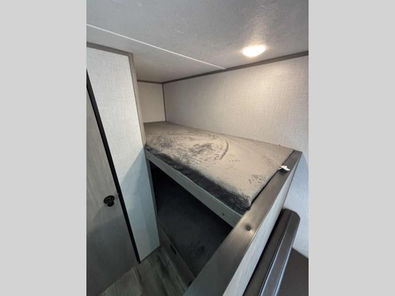 After making dinner on the two burner cooktop or inside the microwave, you can dine at the booth dinette or outside under the 8' power awning if you brought along your camping chairs. Either way you will be comfortable and the dinette may even sleep one person if needed. After playing outdoors all day, everyone can return to get cleaned up in the private toilet and shower room then fall asleep on the queen bed up front or the bunk beds in the rear. And everyone can wake up the next morning to do it over again.