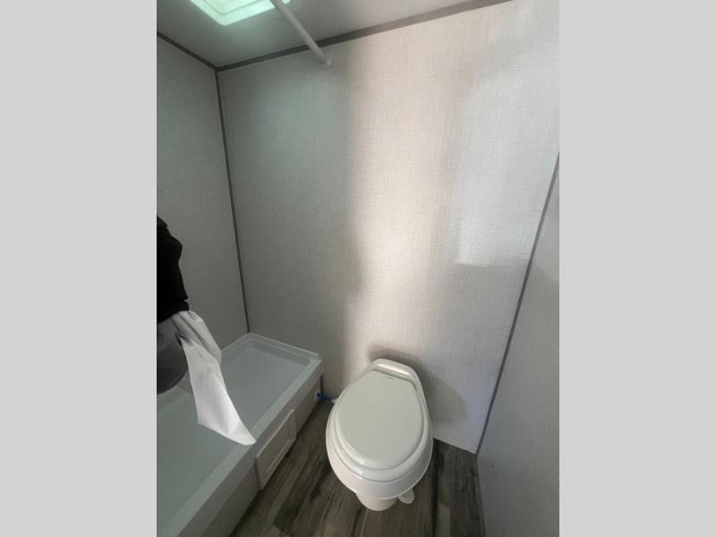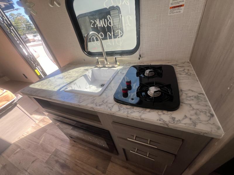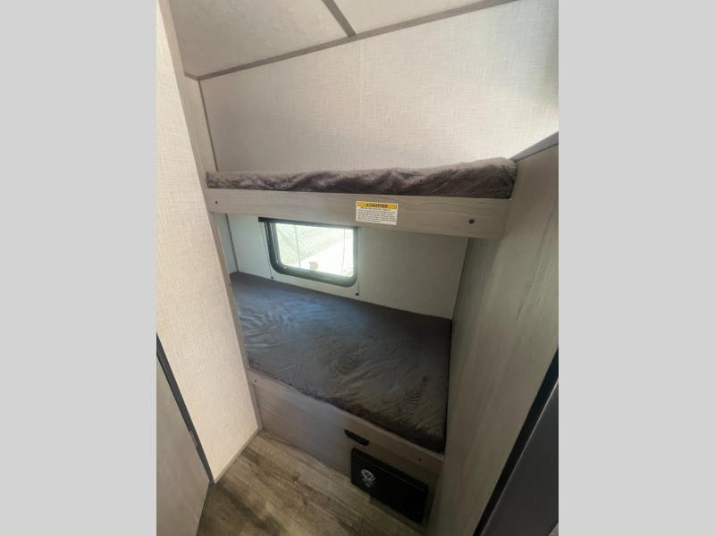 After making dinner on the two burner cooktop or inside the microwave, you can dine at the booth dinette or outside under the 8' power awning if you brought along your camping chairs. Either way you will be comfortable and the dinette may even sleep one person if needed. After playing outdoors all day, everyone can return to get cleaned up in the private toilet and shower room then fall asleep on the queen bed up front or the bunk beds in the rear. And everyone can wake up the next morning to do it over again.