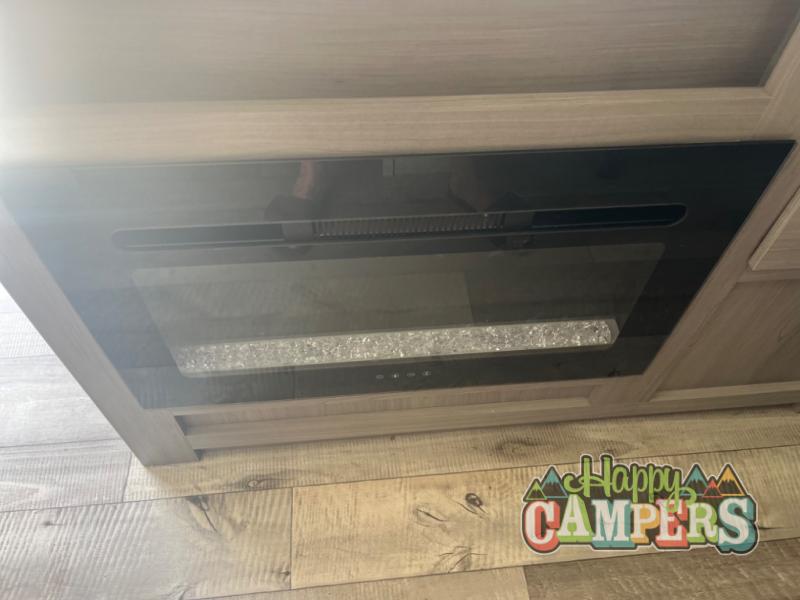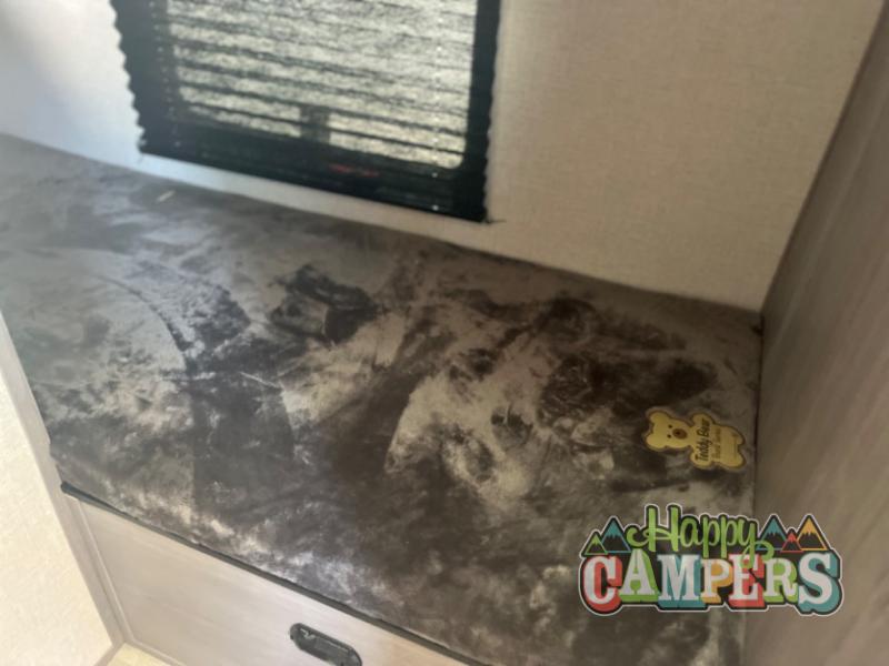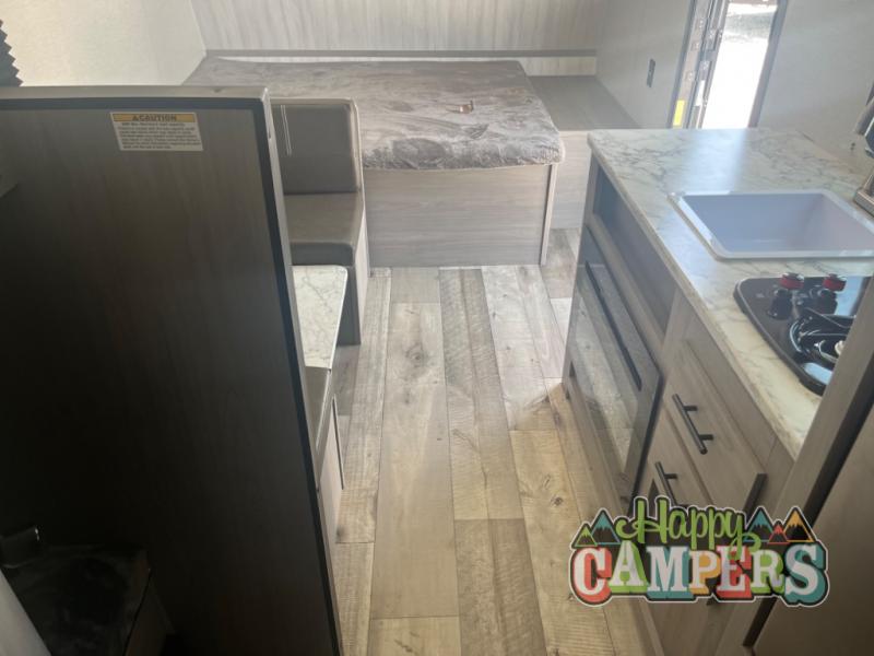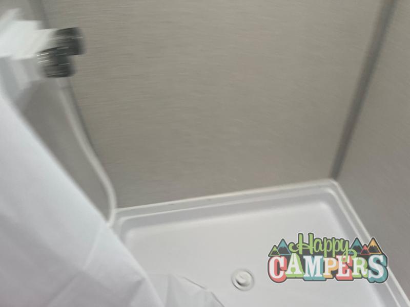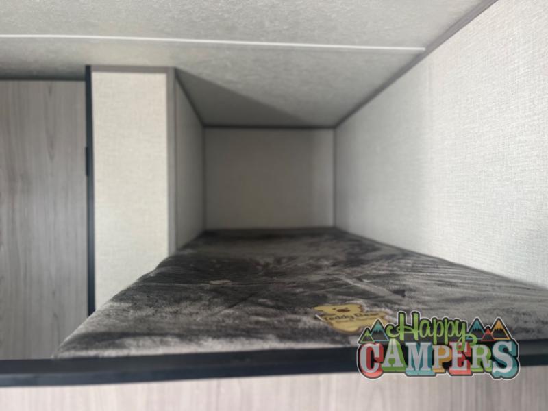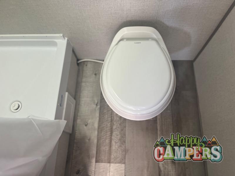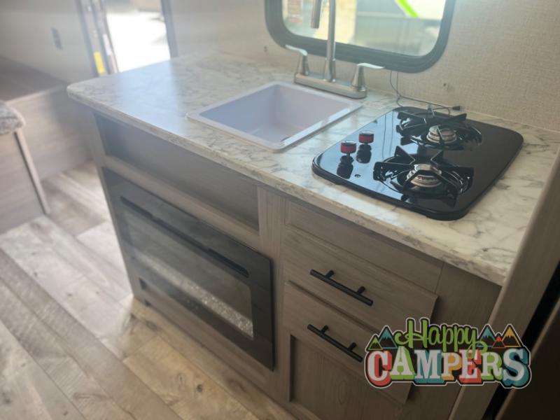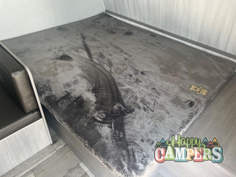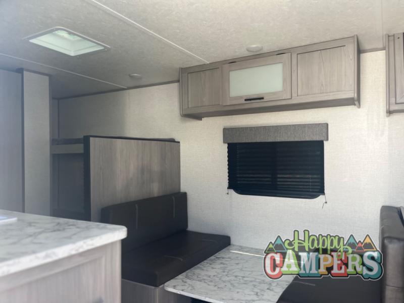 After making dinner on the two burner cooktop or inside the microwave, you can dine at the booth dinette or outside under the 8' power awning if you brought along your camping chairs. Either way you will be comfortable and the dinette may even sleep one person if needed. After playing outdoors all day, everyone can return to get cleaned up in the private toilet and shower room then fall asleep on the queen bed up front or the bunk beds in the rear. And everyone can wake up the next morning to do it over again.