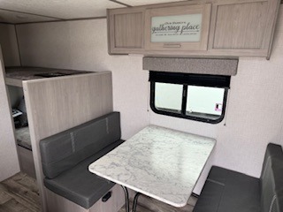 After making dinner on the two burner cooktop or inside the microwave, you can dine at the booth dinette or outside under the 8' power awning if you brought along your camping chairs. Either way you will be comfortable and the dinette may even sleep one person if needed. After playing outdoors all day, everyone can return to get cleaned up in the private toilet and shower room then fall asleep on the queen bed up front or the bunk beds in the rear. And everyone can wake up the next morning to do it over again.