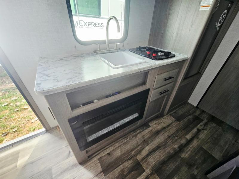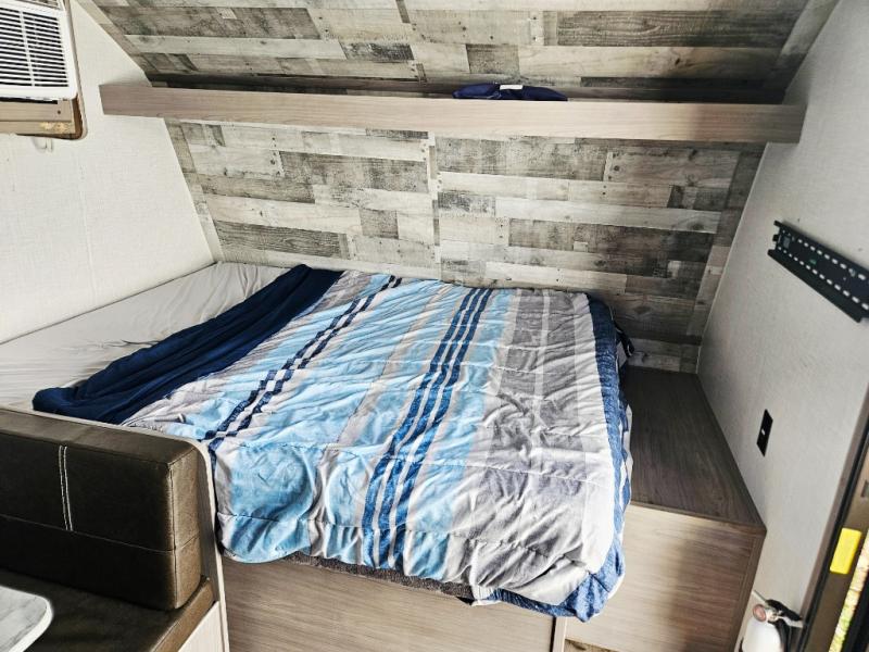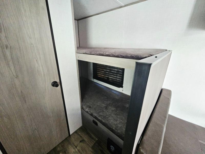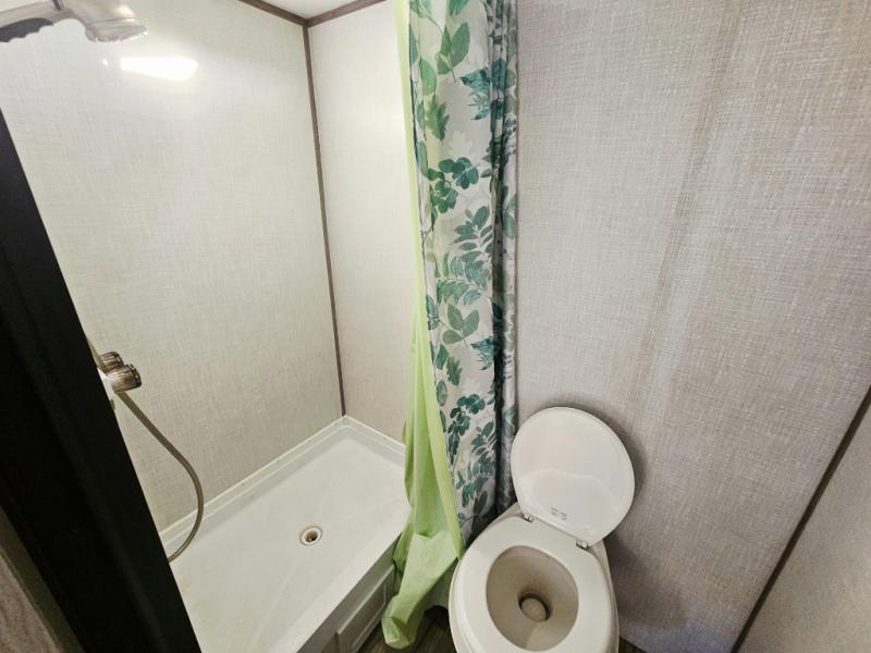 After making dinner on the two burner cooktop or inside the microwave, you can dine at the booth dinette or outside under the 8' power awning if you brought along your camping chairs. Either way you will be comfortable and the dinette may even sleep one person if needed. After playing outdoors all day, everyone can return to get cleaned up in the private toilet and shower room then fall asleep on the queen bed up front or the bunk beds in the rear. And everyone can wake up the next morning to do it over again.