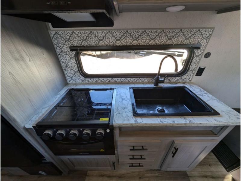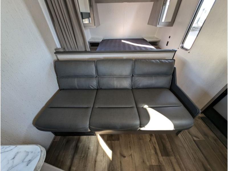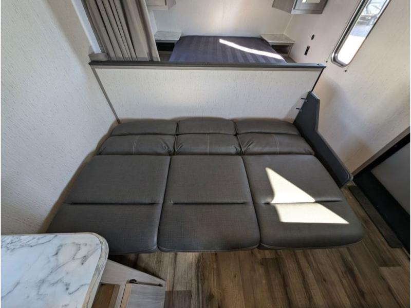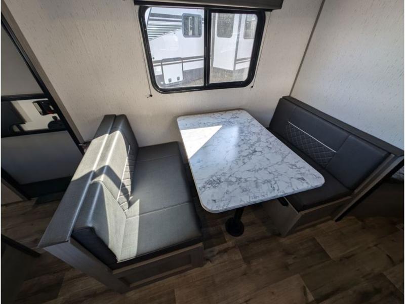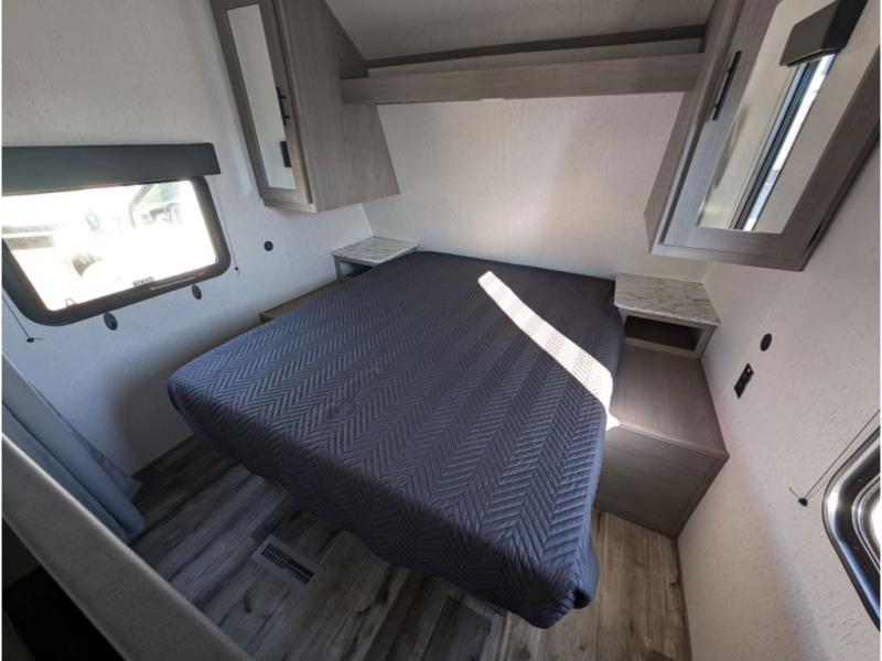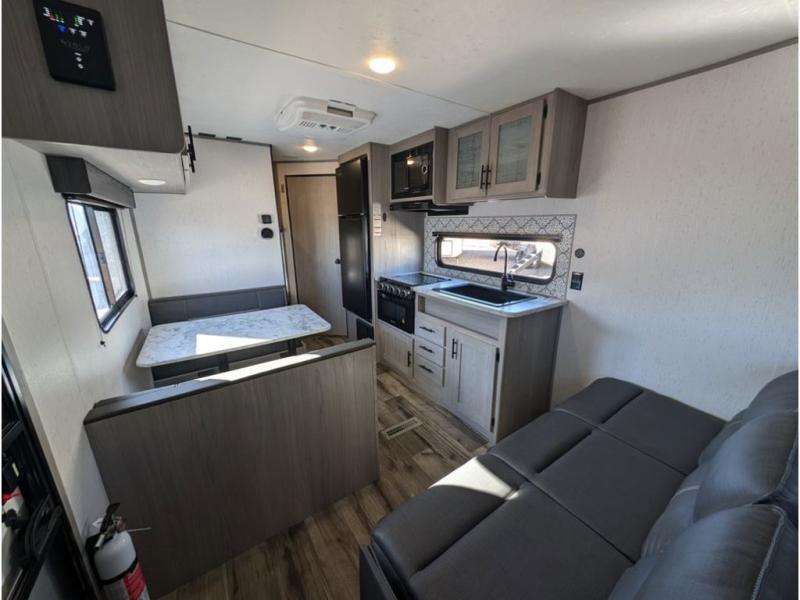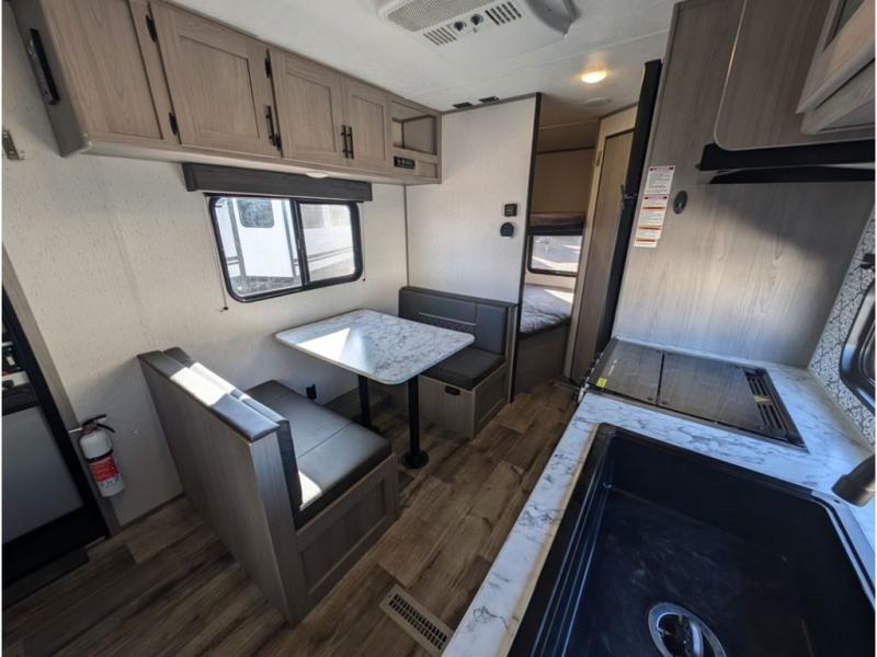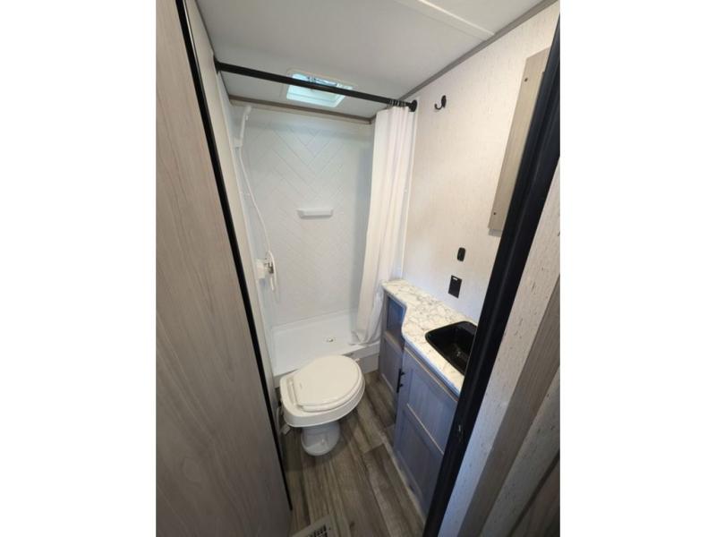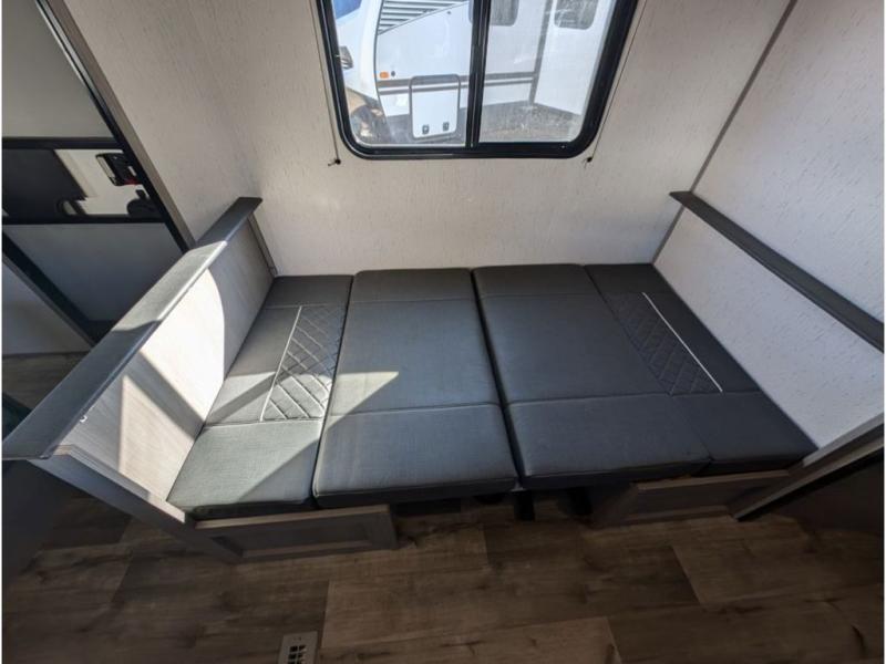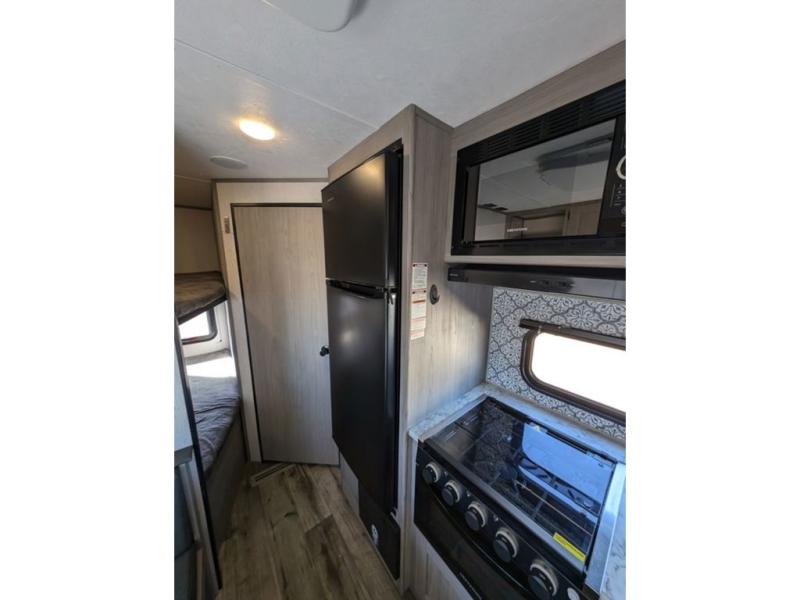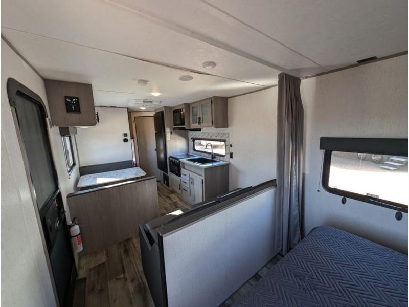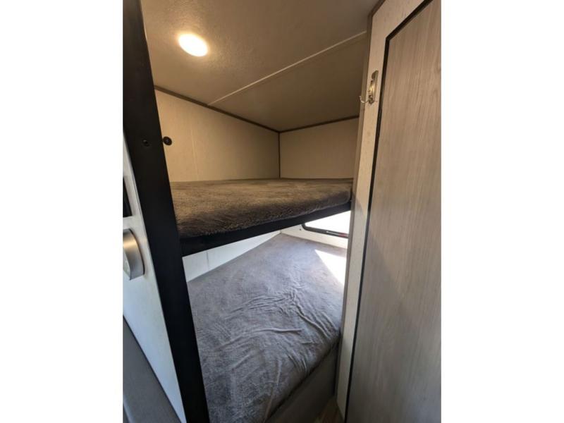 You can't go wrong with this travel trailer in tow! Whether you're relaxing under the 14' power awning, cooking in the full kitchen, or playing a game at the booth dinette, memories will be made. The double-size bunks provide more sleeping space, and the front bedroom will give you your own space to enjoy. This model also includes a full bath so you don't have to use the camp's facilities, and the bath fan will keep everything fresh. This model also incudes a 10 cu. ft. refrigerator, overhead compartments, and a pass-through storage for your larger camp gear!