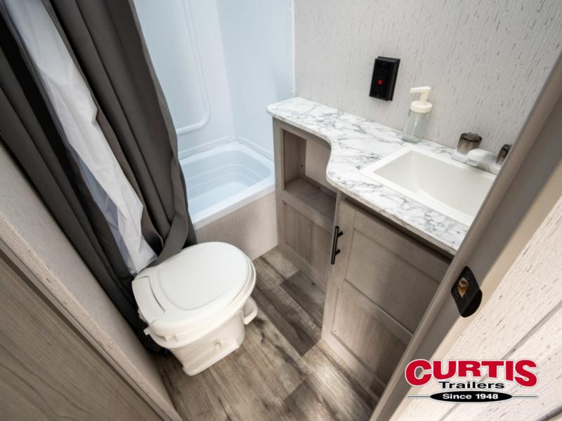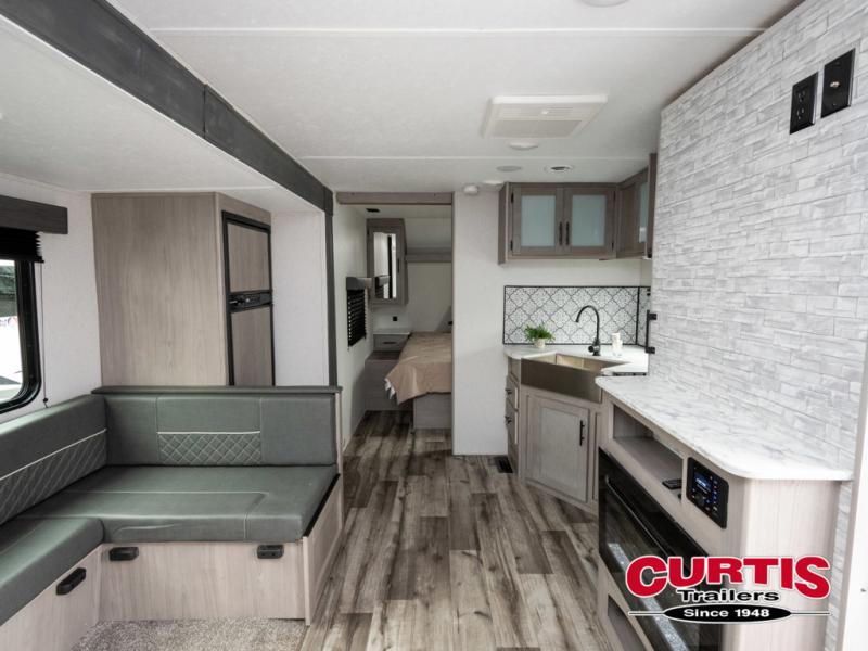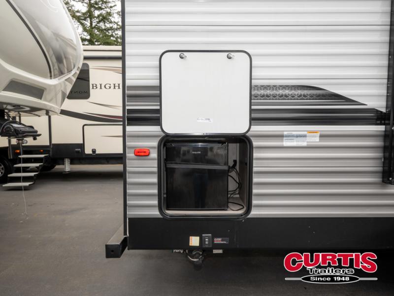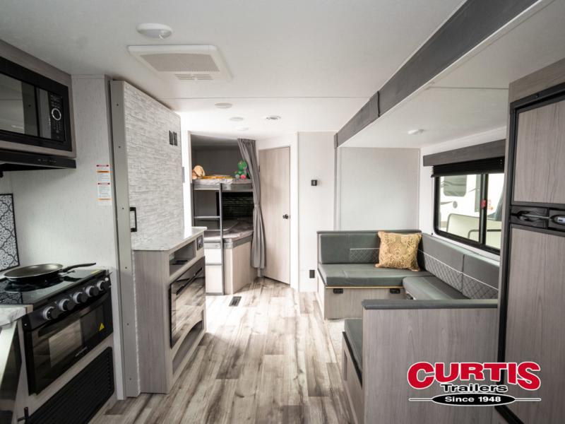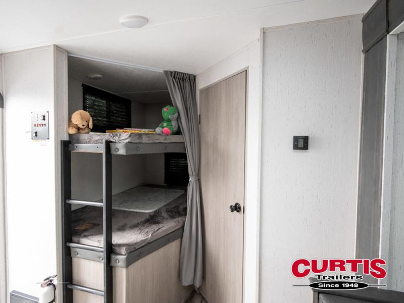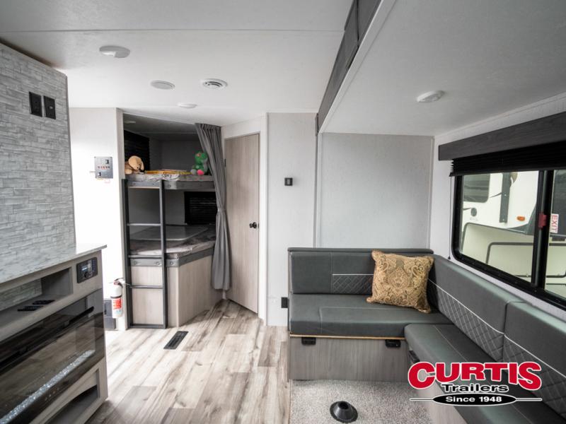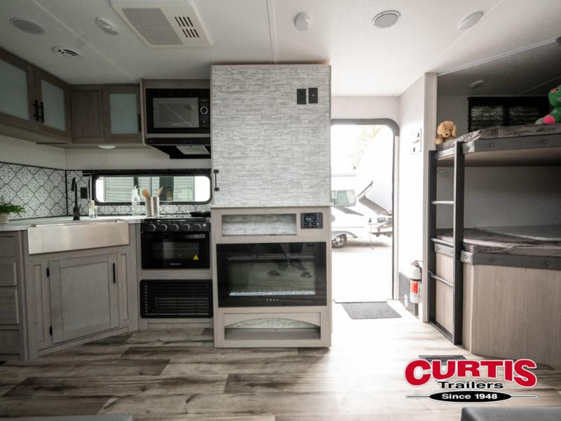 If you enjoy making memories and telling lots of stories, then take this trailer with you on your next trip! You will be able to offer sleeping space for four on the double-size bunks in the rear next to the entry and the full bathroom, plus the conventional U-shaped dinette once easily setup for bedtime gives two more a space to call theirs. Of course, the front bedroom with a queen bed and dual wardrobes will be all yours especially when you want privacy. Everyone can gather around the U-shaped dinette to visit, plan the day's activities, and enjoy the fireplace while the cook makes meals using the kitchen appliances. And don't forget about the outside kitchen when cooking, and the power awning when you want to relax outside.