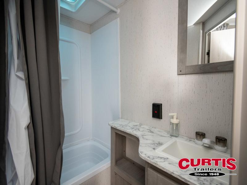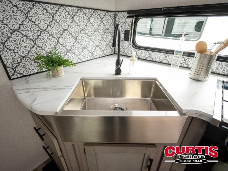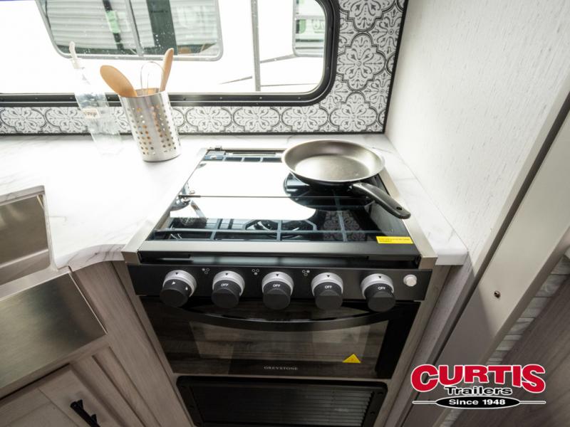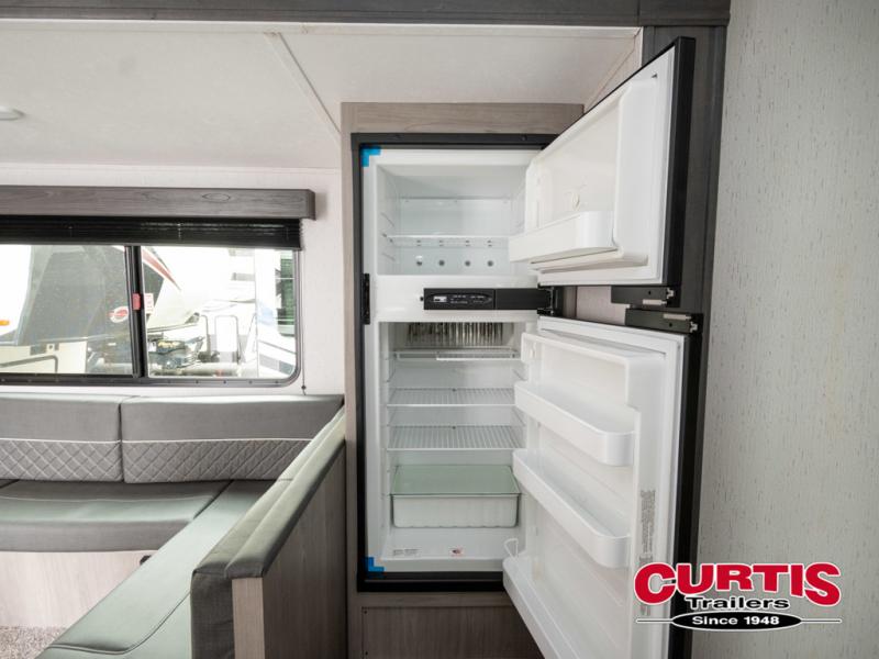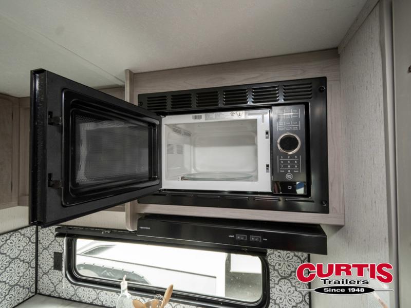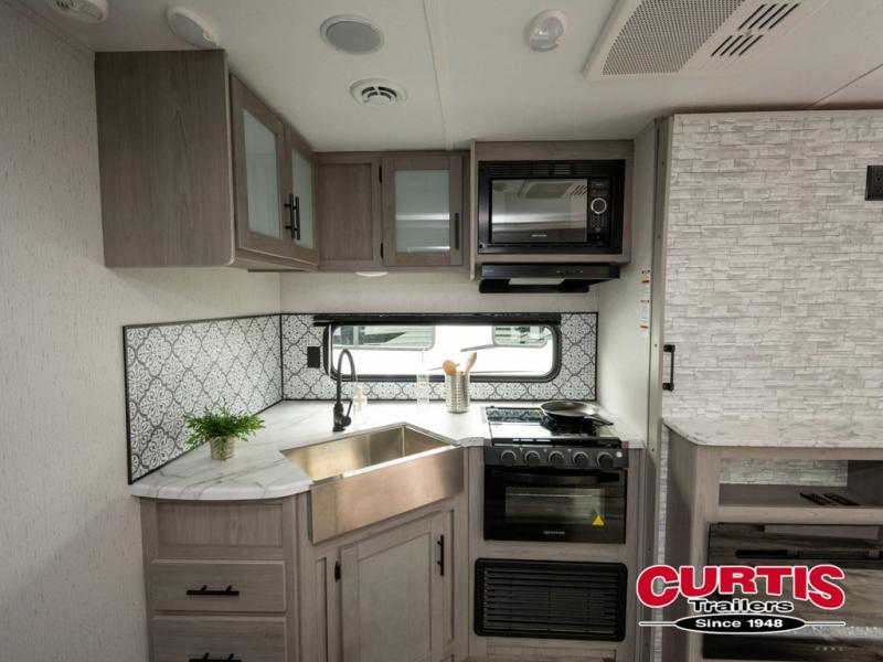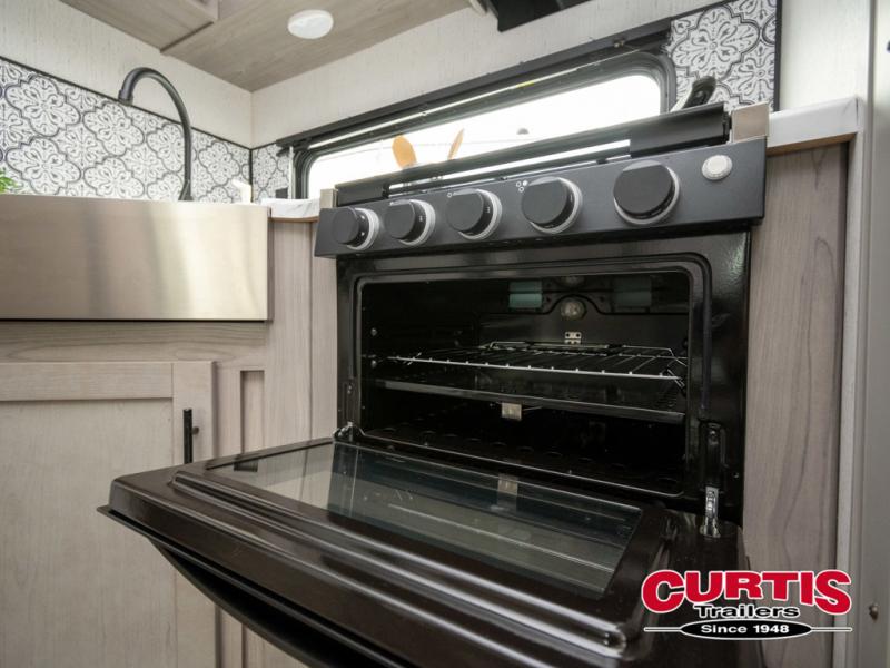If you enjoy making memories and telling lots of stories, then take this trailer with you on your next trip! You will be able to offer sleeping space for four on the double-size bunks in the rear next to the entry and the full bathroom, plus the conventional U-shaped dinette once easily setup for bedtime gives two more a space to call theirs. Of course, the front bedroom with a queen bed and dual wardrobes will be all yours especially when you want privacy. Everyone can gather around the U-shaped dinette to visit, plan the day's activities, and enjoy the fireplace while the cook makes meals using the kitchen appliances. And don't forget about the outside kitchen when cooking, and the power awning when you want to relax outside.