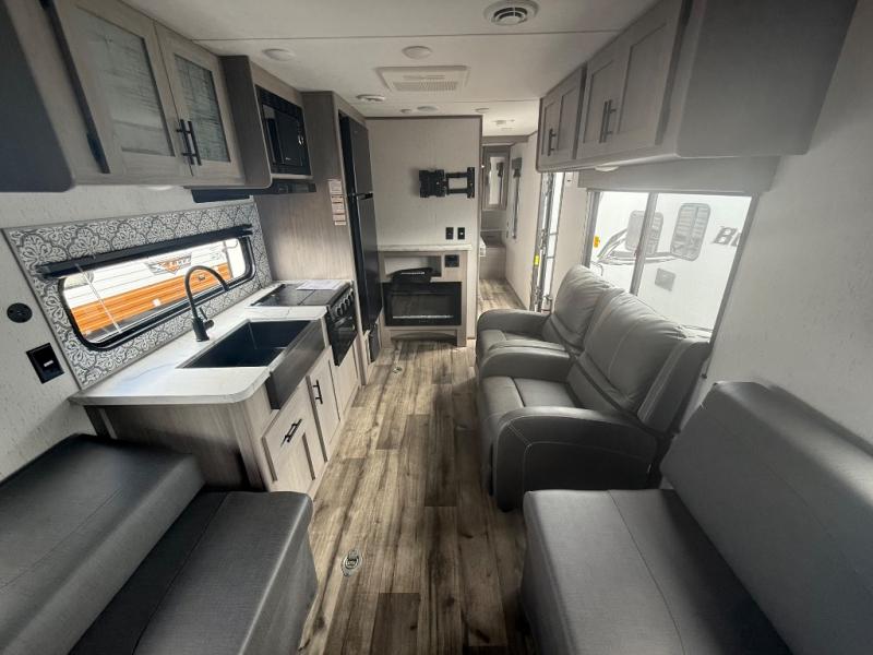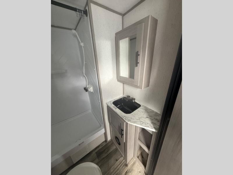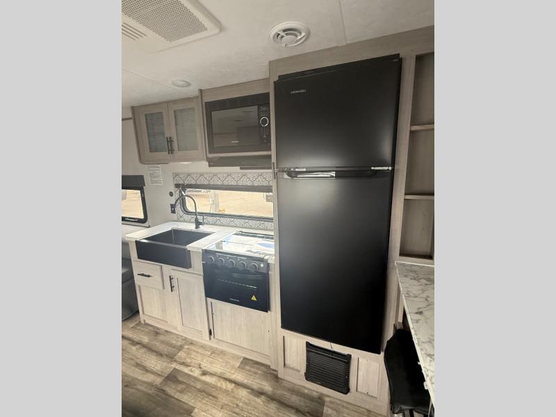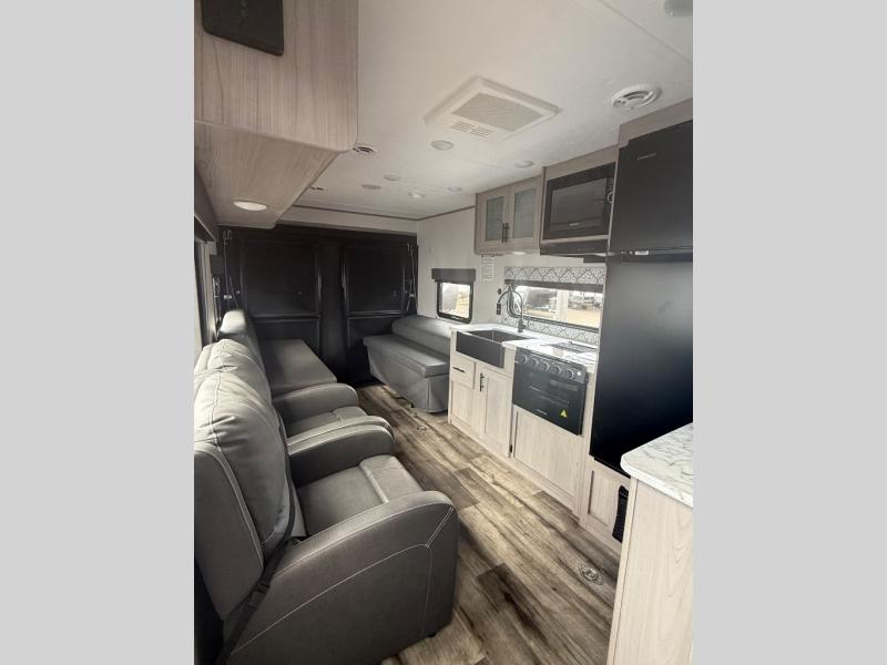 Get ready for adventure and some trail rides when you have this trailer at the campsite. You can easily load your toys using the ramp door into 13'3" of cargo space that becomes the main living and kitchen area once unloaded. Relax and dine on the dual opposing sofas with a table in between and/or on the two swivel rockers. The kitchen offers full amenities including a 10 cu. ft. refrigerator for your cold items and beverages. The front bedroom offers privacy when you need it, plus clothing storage and windows, and the full bathroom allows you to stay clean even if you had to use the outside shower to get the dirt off first. Extra features in this toy hauler include a 1,600 lb. rated rear ramp door, 2,500 lb. rated recessed D-rings and maximized storage flat floors.