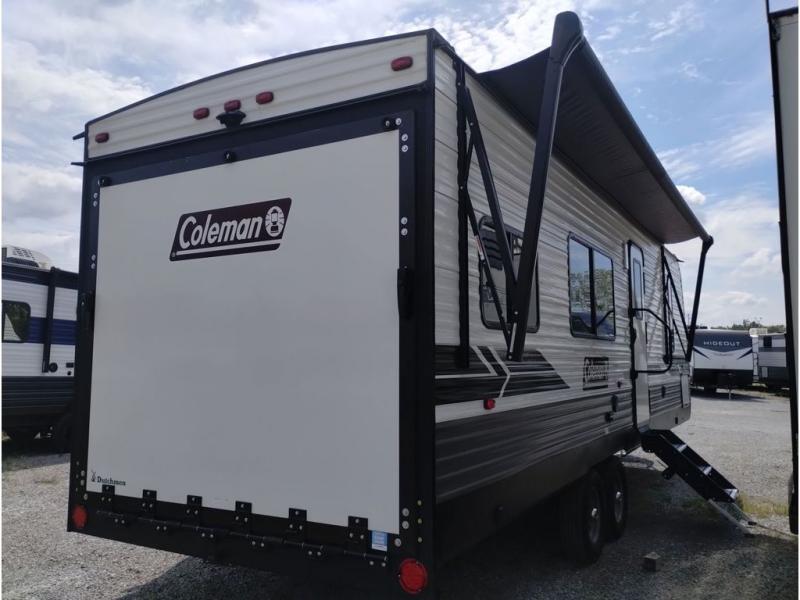 With any Coleman Lantern Series travel trailer and toy hauler travel trailer, the interior will impress with upgraded residential grade linoleum and Eyewear luxury furniture for style and durability, the undermounted large kitchen sink with stainless steel high-rise kitchen faucet, and seamless countertops, plus the hard valances in the living room and master bedroom and the AM/FM/CD/AUX/Bluetooth stereo. The Dutchmen construction advantage is included and provides a durable roof structure with a TPO roof, 3/8" decking, fiberglass insulation, and a lauan interior panel, plus an insulated structure with a metal exterior panel, a wood frame with R7 thermal insulation and an lauan interior panel. Also included is the Blade air flow system which helps reduce air turbulence and noise with duct elbows and wyes that feature enlarged inlets. Choose a Coleman Lantern Series because you appreciate quality, value and design when you camp!