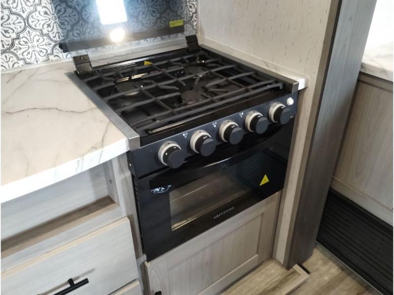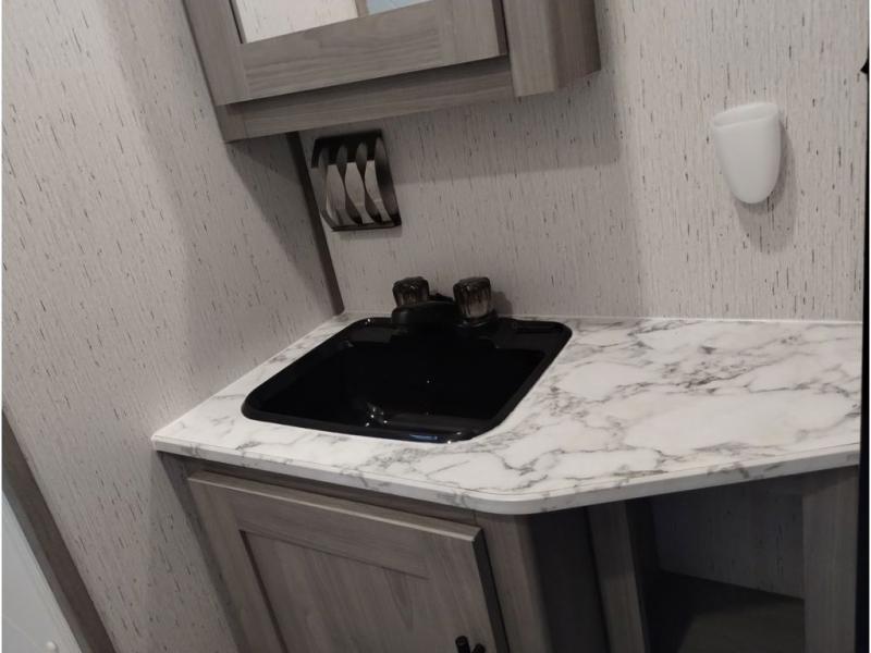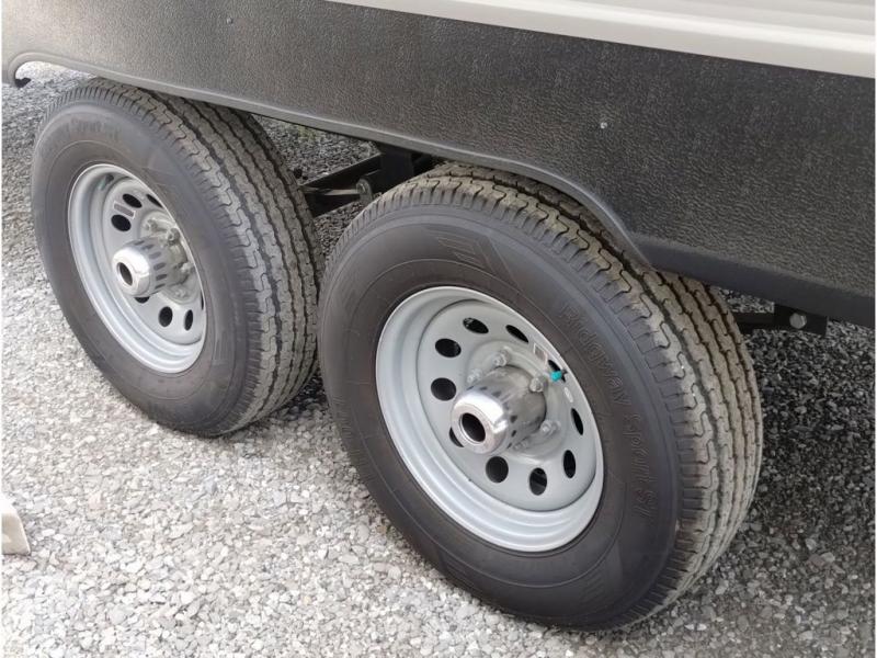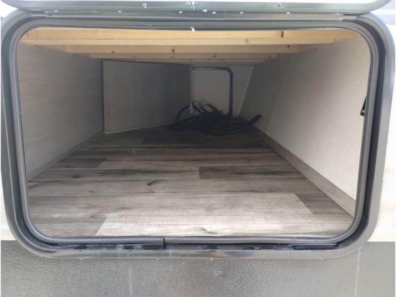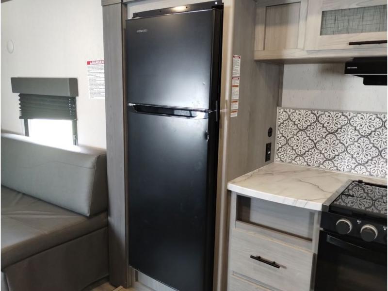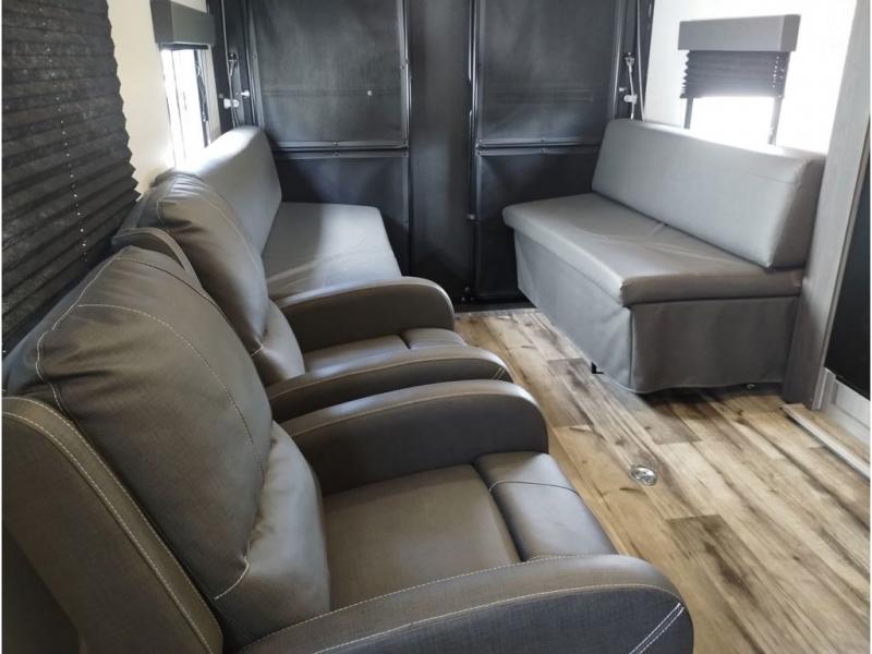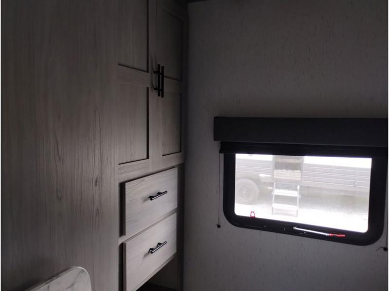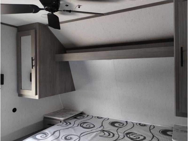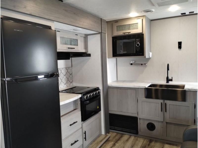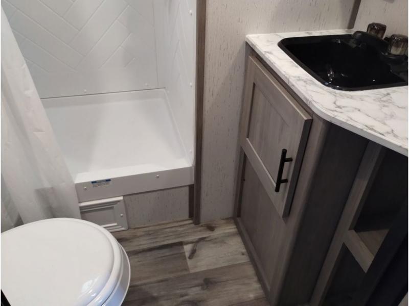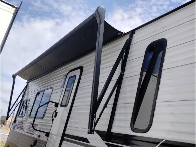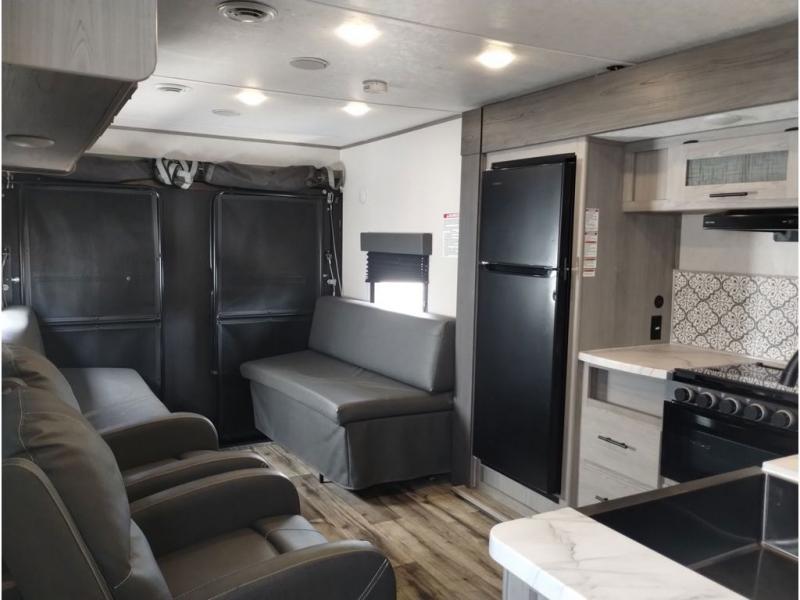 Looking for enough cargo space to carry your toy(s) to the off-road park you dream about? This travel trailer toy hauler gives you 13' of cargo space to secure your toys for the trip, and once you have reach your destination and unloaded, you can enjoy this main area as your kitchen and living space as well as a bedroom when the furniture is utilized to sleep on. In the rear you will find dual opposing sofas with a table in between and two swivel rockers. The kitchen slide offers full amenities including a 10 cu. ft. refrigerator to store leftovers and such, plus the farm style sink with high rise faucet and extra counter space will come in handy. Head to the front bedroom to fall quickly asleep after getting cleaned up in the full bathroom. You will appreciate more features such as power stabilizer jacks, an outside shower, and more. And some toy hauler features include a 1,600 lb. rated rear ramp door, 2,500 lb. rated recessed D-rings and maximized storage flat floors.