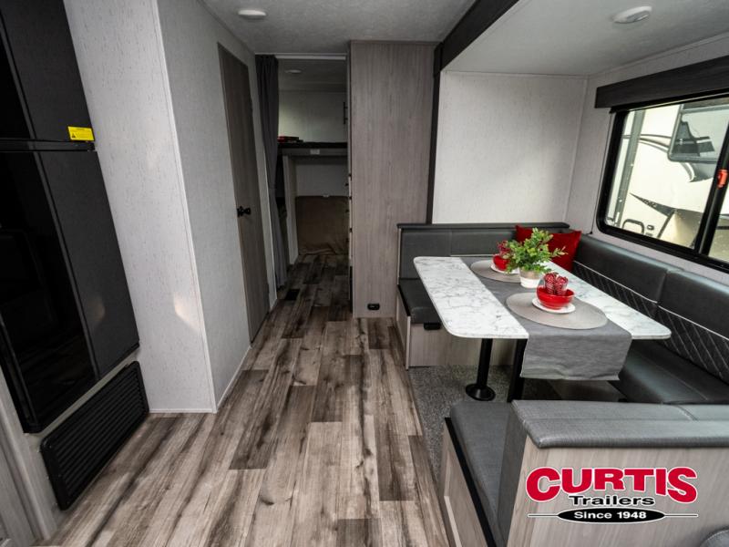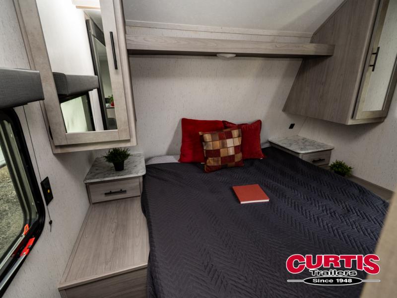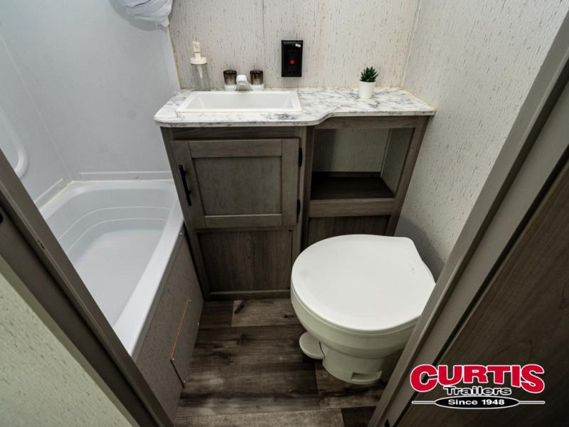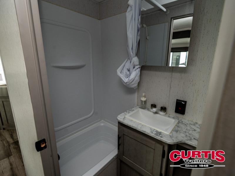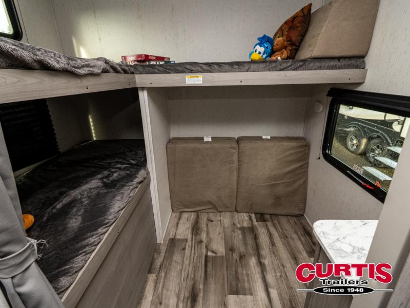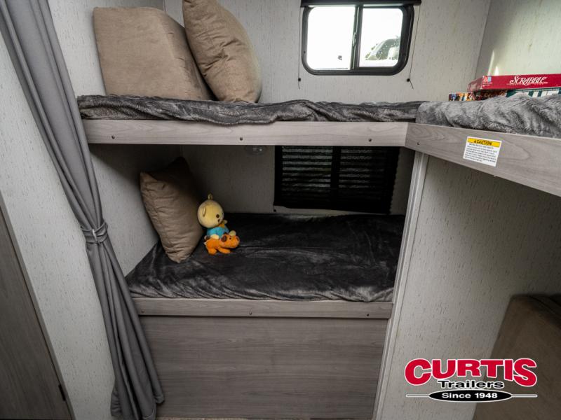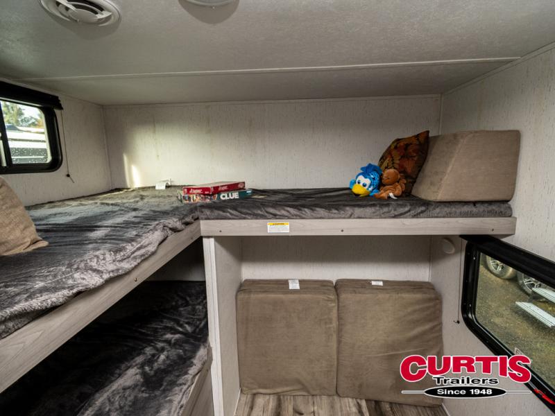 This trailer offers a private bunkhouse which is a popular feature for larger families needing lots of sleeping space! Your kids or friends will love having three bunks to choose from, plus a sofa allowing them to share bedtime stories as they talk about their day. And there is a full bathroom just outside the bunkhouse for convenience. You and your person can sleep on the opposite side in the front bedroom on a queen bed with access from each side and storage. The cook will enjoy having a farm style sink with high rise faucet, and kitchen appliances including a 7 cu. ft. refrigerator to store leftovers. There are many more features to enjoy such as the power tongue jack when setting up, the outside shower when your shoes are too dirty to bring inside, and the USB ports when you cellphone battery is low.