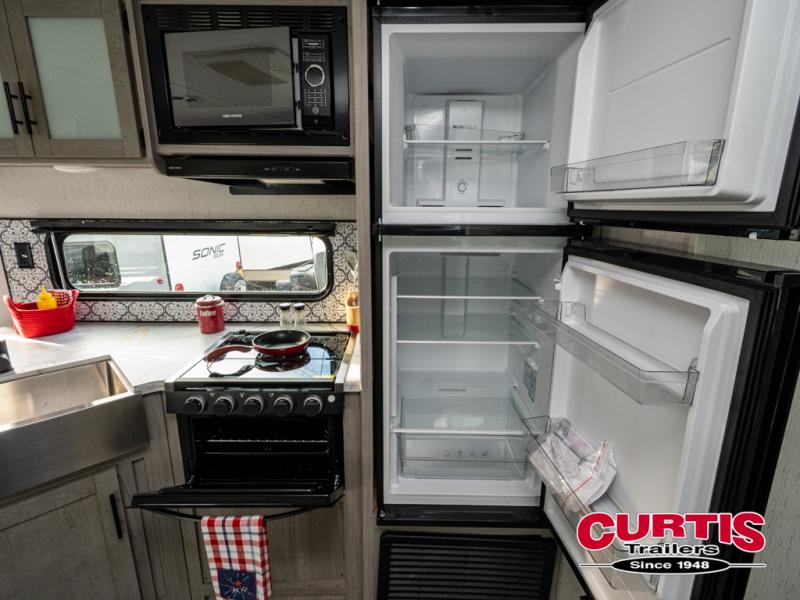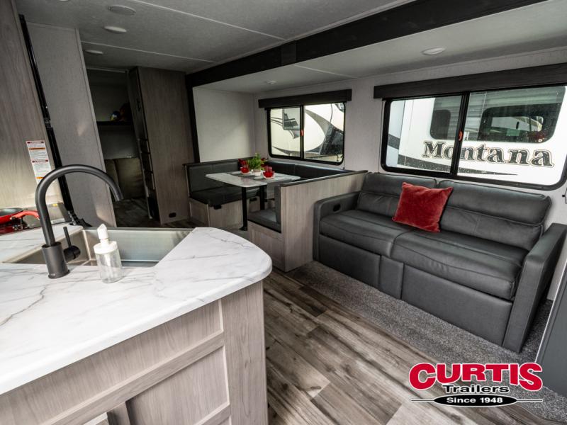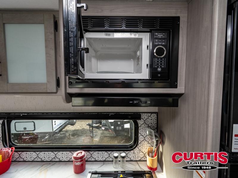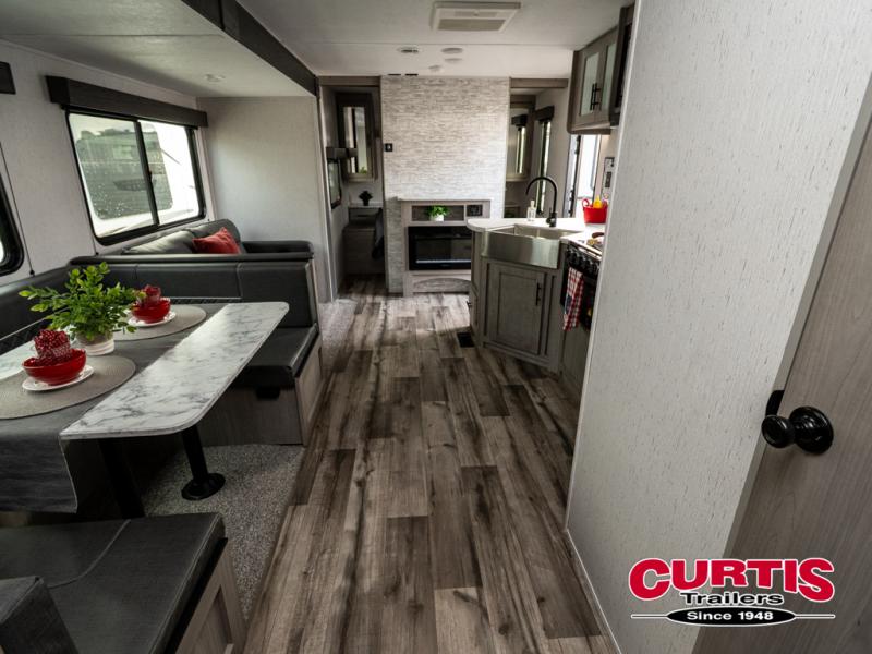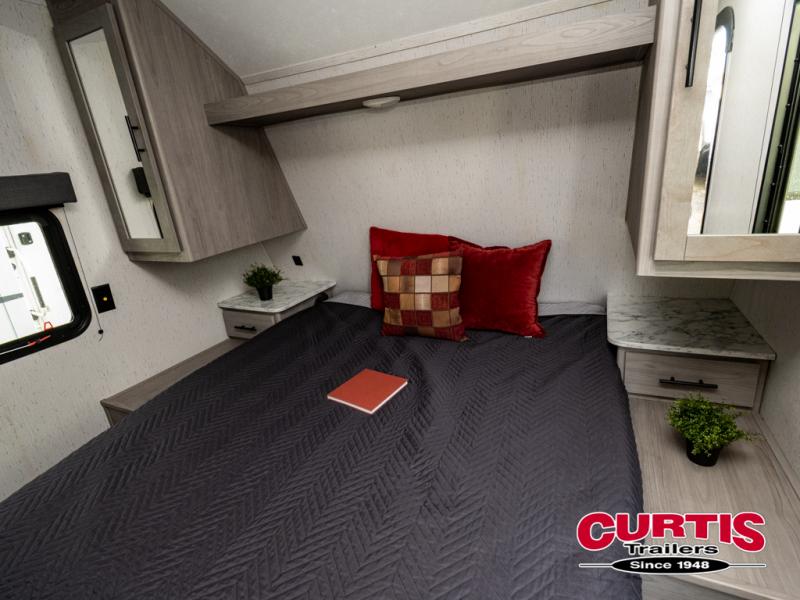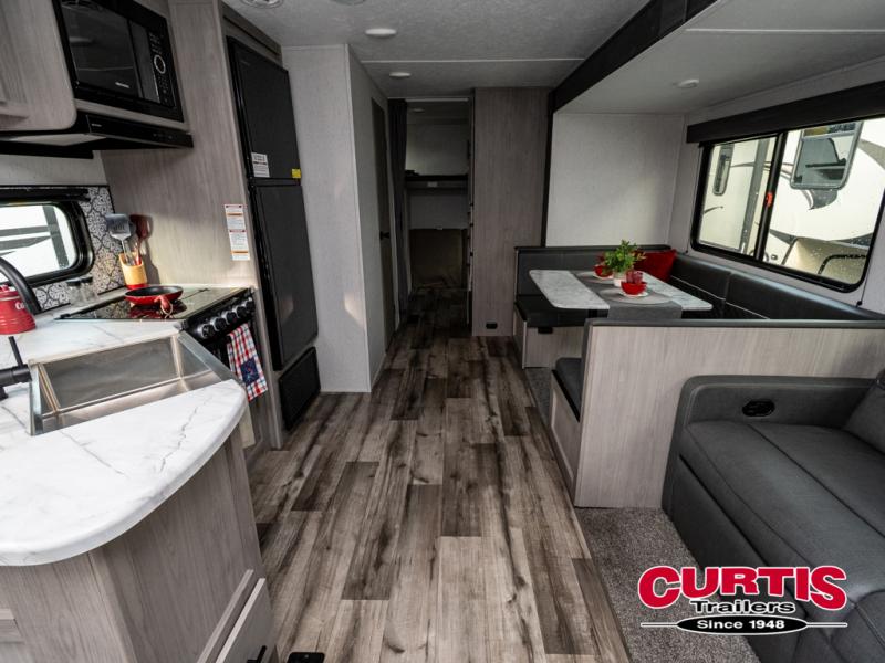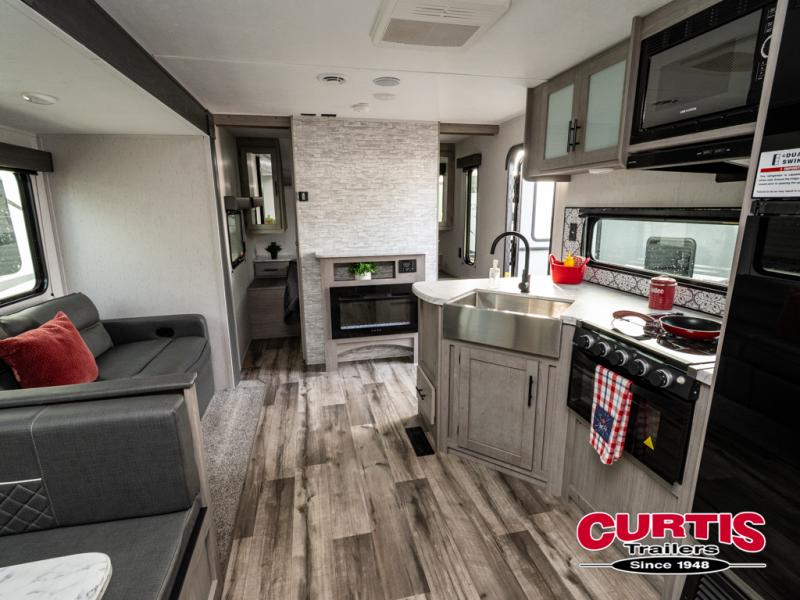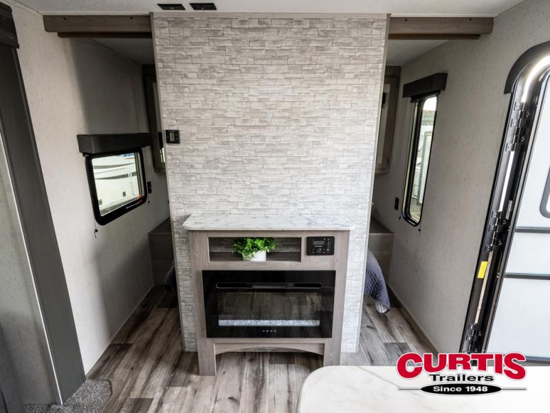 This trailer offers a private bunkhouse which is a popular feature for larger families needing lots of sleeping space! Your kids or friends will love having three bunks to choose from, plus a sofa allowing them to share bedtime stories as they talk about their day. And there is a full bathroom just outside the bunkhouse for convenience. You and your person can sleep on the opposite side in the front bedroom on a queen bed with access from each side and storage. The cook will enjoy having a farm style sink with high rise faucet, and kitchen appliances including a 7 cu. ft. refrigerator to store leftovers. There are many more features to enjoy such as the power tongue jack when setting up, the outside shower when your shoes are too dirty to bring inside, and the USB ports when you cellphone battery is low.