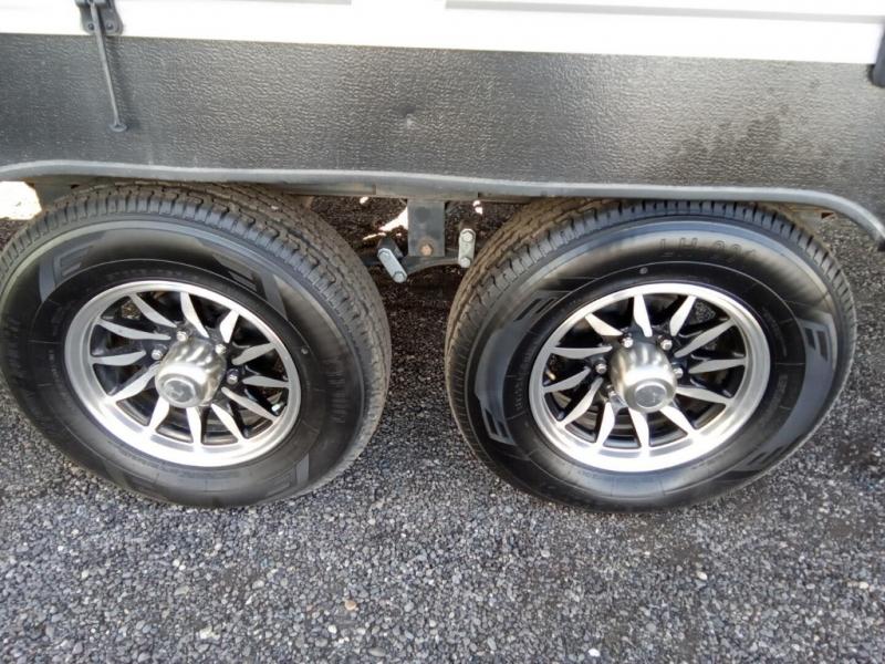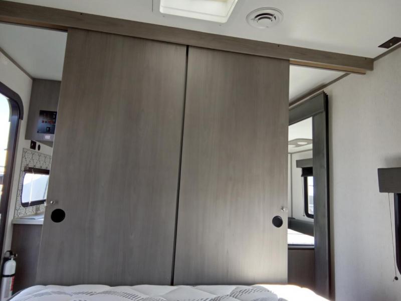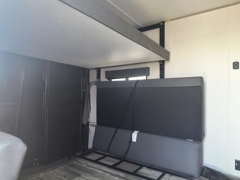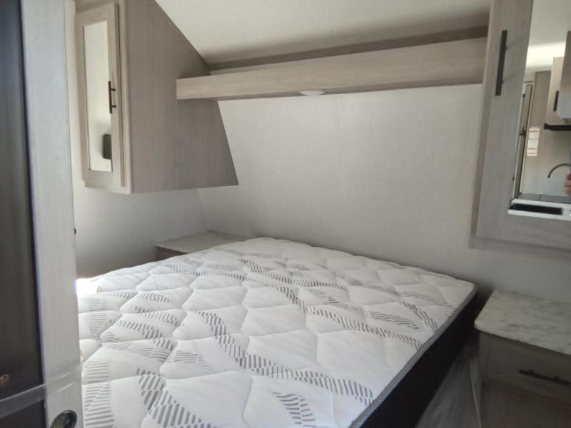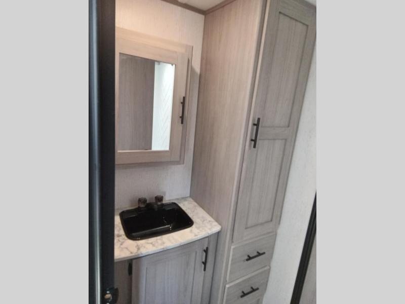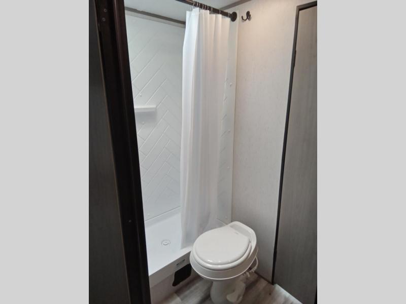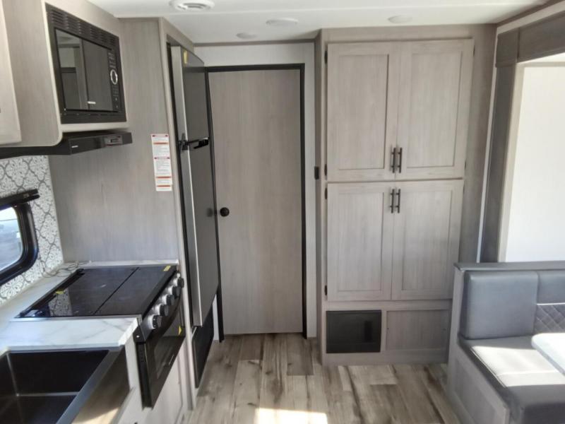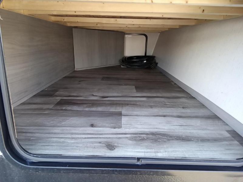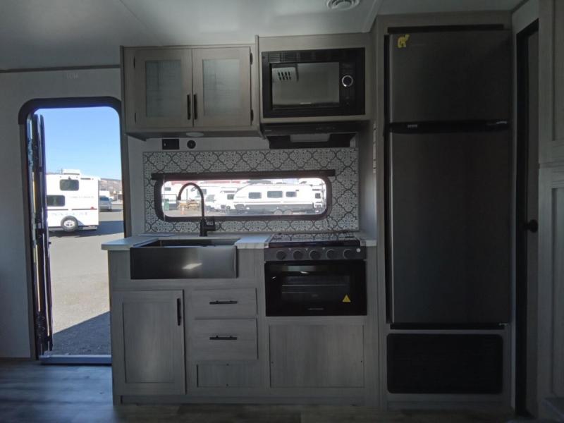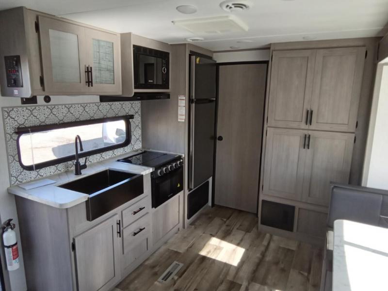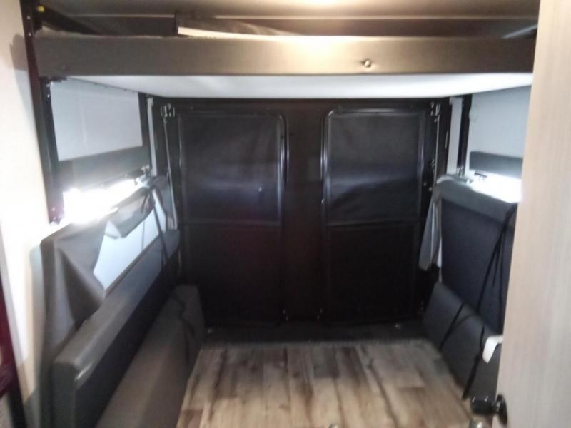 This trailer offers a separate cargo area for your toys and a separate living and kitchen area for you to relax and unwind after a fun ride! The 10' cargo space gives you a side man door to be able to check on your toys while traveling, two sofas with a table in between as well as an overhead bed so you can utilize this space as a second living/dining/bedroom once the toys have been unloaded. The walk-through bathroom gives you access from both the cargo area and the main area for convenience. And the kitchen provides full amenities including a 10 cu. ft. refrigerator, and a farm style sink with high rise faucet to easily keep all the dishes clean. And the front bedroom provides privacy when needed. You will appreciate more features such as a power tongue jack and an outside shower. And some toy hauler features include a 1,600 lb. rated rear ramp door, 2,500 lb. rated recessed D-rings and maximized storage flat floors.