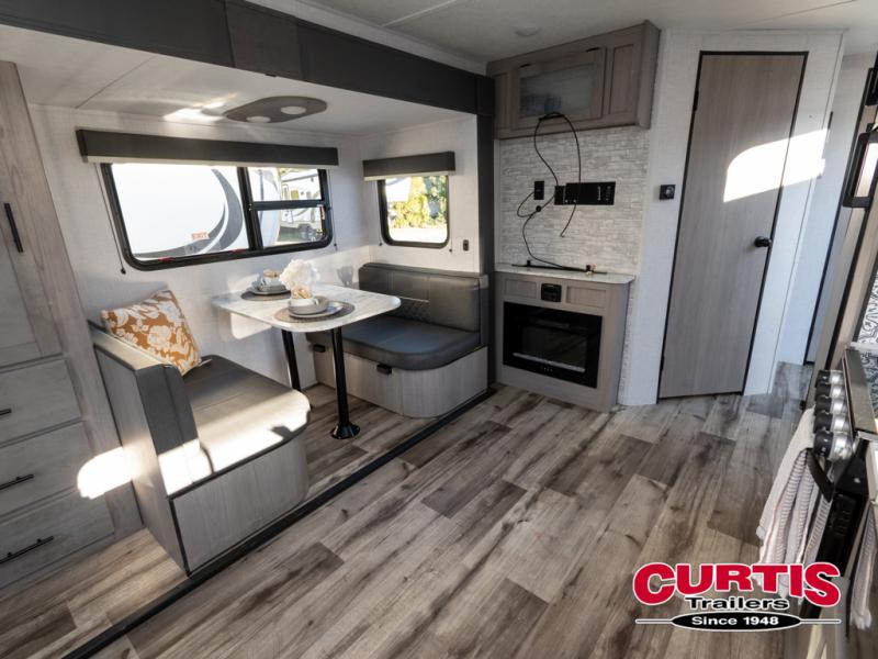It won't be long after you return from your first camping trip with this Coleman Light travel trailer that you'll want to plan another one! This trailer is light enough to make the trip an easy one and accommodating enough to make the trip quite enjoyable. There is a reclining sofa to sit on in front of the fireplace. The single slide holds the booth dinette so that it isn't in the way of anyone relaxing on the sofa. An oven, three-burner range, microwave, and 7-cubic foot refrigerator make the kitchen a full-service station, and the dual-entry bathroom is also fully equipped with a radius shower, toilet, and wooden medicine cabinet with mirror.