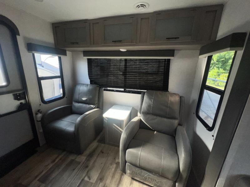 You'll feel right at home in this Coleman Light travel trailer! There are many residential comforts included on this trailer, like the residential queen bed up in the private bedroom, the two swivel rockers with end table in between, the reclining sofa, the two entry doors for great accessibility, and the fireplace for a cozy effect. The walk-through bath is a useful feature because it provides entry doors on either side which means that you can access the bathroom from the bedroom or main living area. You'll also be able to keep some extra equipment stored away in the exterior pass-through storage.