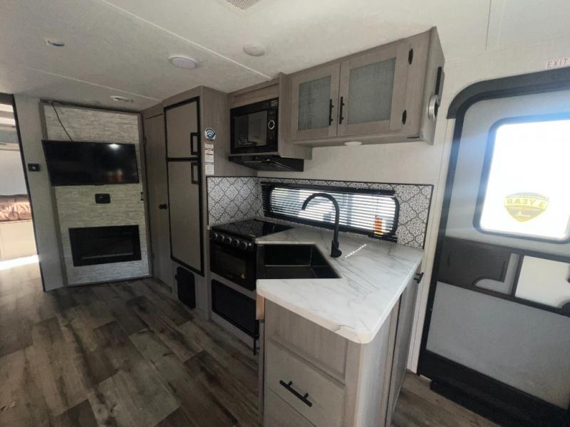 The Dutchmen Coleman Light travel trailer features an upgraded kitchen package with residential appliances, high-rise faucets, and a stainless steel farm-style sink. The fully enclosed underbelly allows all of your trailer's vital functions to be kept out of the freezing cold, and you'll have great stability as you enter your trailer by using the solid entry steps. Each model includes power stabilizer jacks, a power tongue jack, dual 20-LB propane tanks, a residential queen bed, and preparations for Wi-Fi 4G LTE. There is an aerodynamic front fiberglass cap, exterior speakers, solar charging connection, and aluminum wheels.