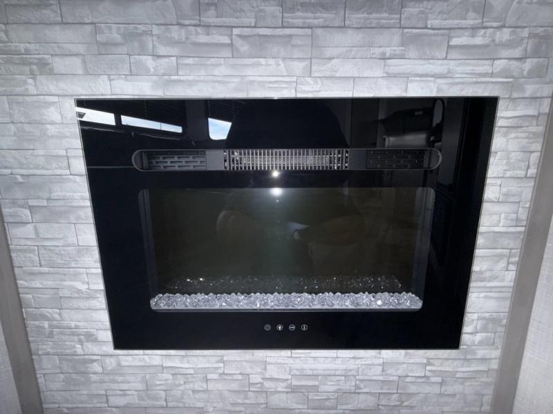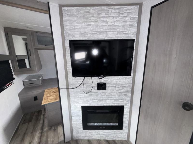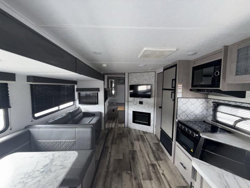 This Coleman Light travel trailer is quite accommodating with its bunk beds, U-shaped dinette, reclining sofa, and residential queen bed! There is a large slide that will create an open living area, and you can relax in front of the fireplace when you need a little extra heat on a chilly day. The hinged entertainment center hides a pantry in the kitchen, and there is also a 7-cubic foot refrigerator that you can use for cold food storage. Come and go as you please with the two entry doors, and spend some time outside cooking meals at the outdoor kitchen while the 20' power awning protects you from stray rain drops.