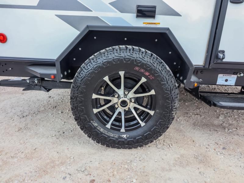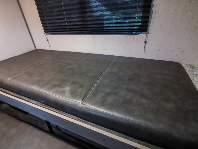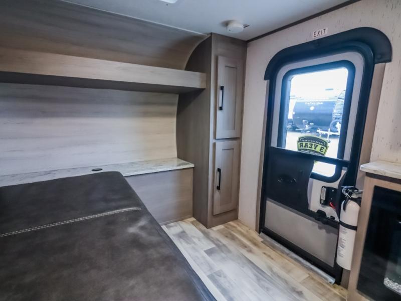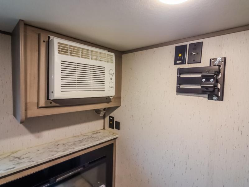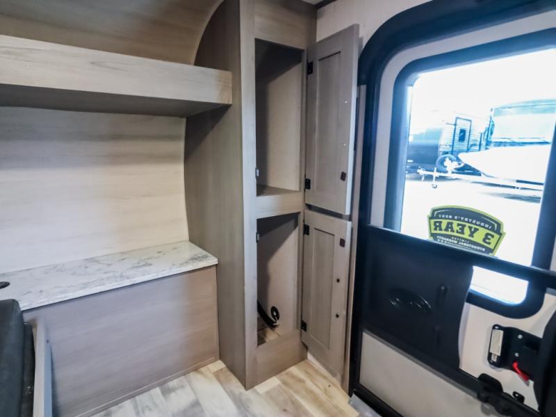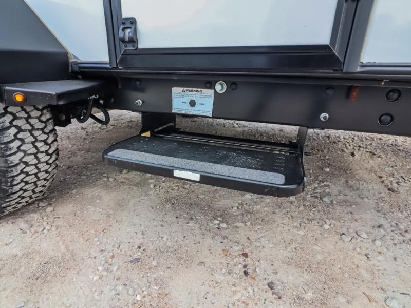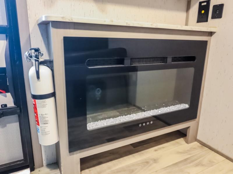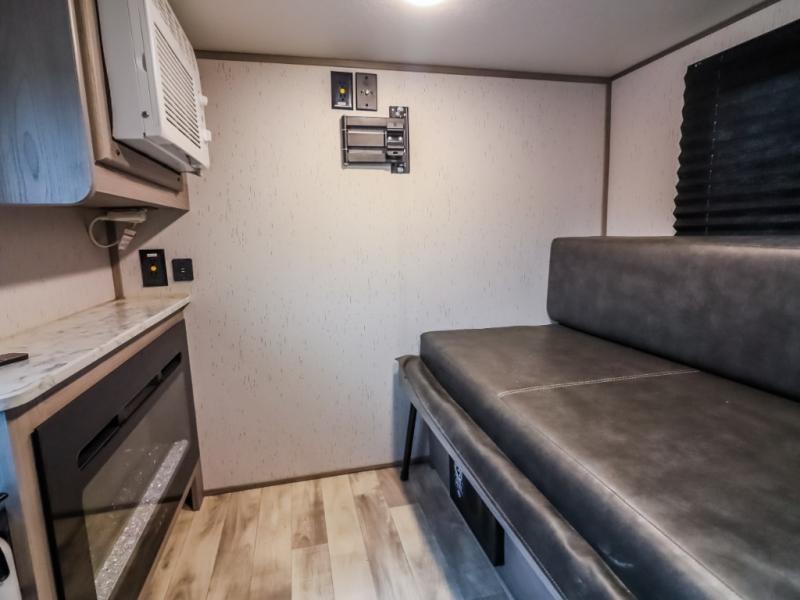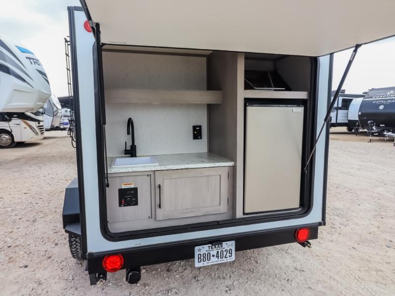 If you are looking to transition from tent camping to a trailer, take your adventures up a notch with this cozy couples unit featuring dry sleeping every night and a hatch back kitchen will be great for all of your cooking needs thanks to the sink and refrigerator, storage cabinets and shelves, plus an exterior side mount griddle for bacon and eggs in the morning and burgers in the afternoon. Inside, a fireplace to take the chill out when it's cold, and a 74" gaucho sofa for seating during the day, then easily converts to a comfortable bed at night.