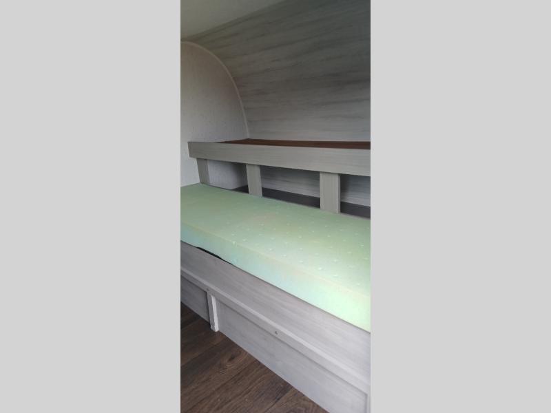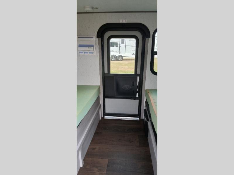 This unit is perfect for a family of 2-4 as it features dual entry, a hatch back kitchen for all of your meals and cooking needs thanks to the sink and refrigerator, storage cabinets and shelves, plus an exterior side mount griddle for perfect pancakes in the morning and burgers in the afternoon. Inside, a fireplace to take the chill out, a gaucho sofa which converts to a bed, plus the dinette also makes into more sleeping space when nighttime comes. There is also a single bunk in front which is perfect for a child, and the dual entry doors makes it easy for everyone to come and go.