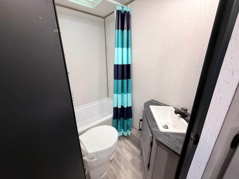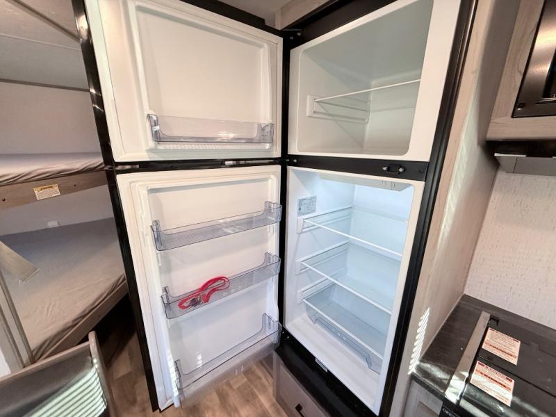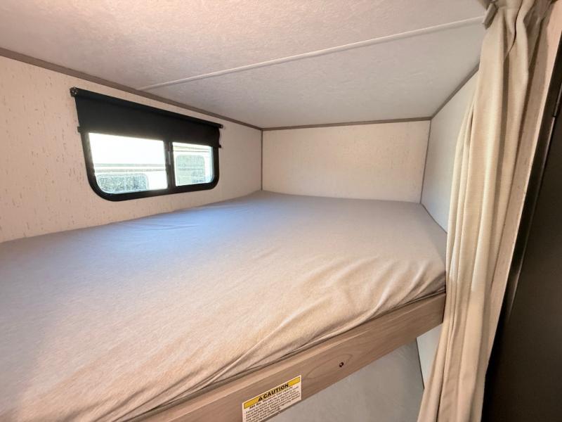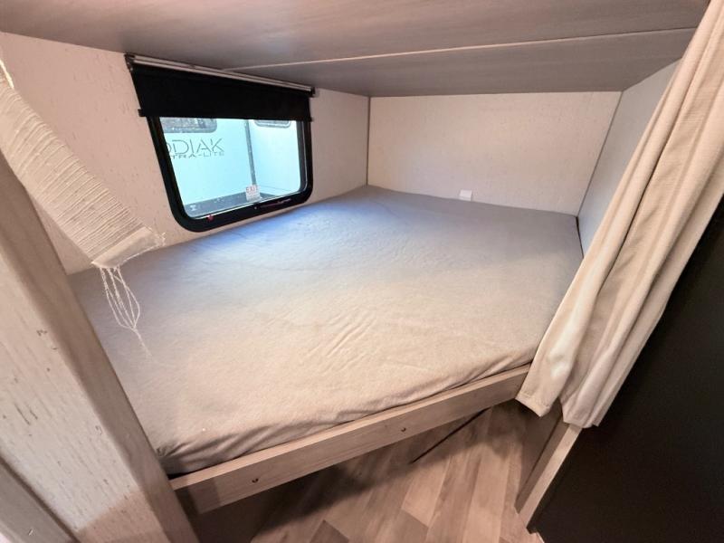 Its time to load up and head to your favorite campgrounds in this family and pet-friendly Kodiak SE travel trailer! You can place your clothing in one of the two wardrobes on each side of the residential walk-around queen bed while the kids place their bags on the bunk they chose for the weekend. You will find more storage throughout the inside, and the exterior pass-through compartment will hold the camp chairs, charcoal and such. The 10-cu. ft. 12V refrigerator can hold the cold items, plus there is storage beside it for your dry goods. Everyone can remain clean with the corner full bathroom, and you can even sleep seven if you utilize the dinette.