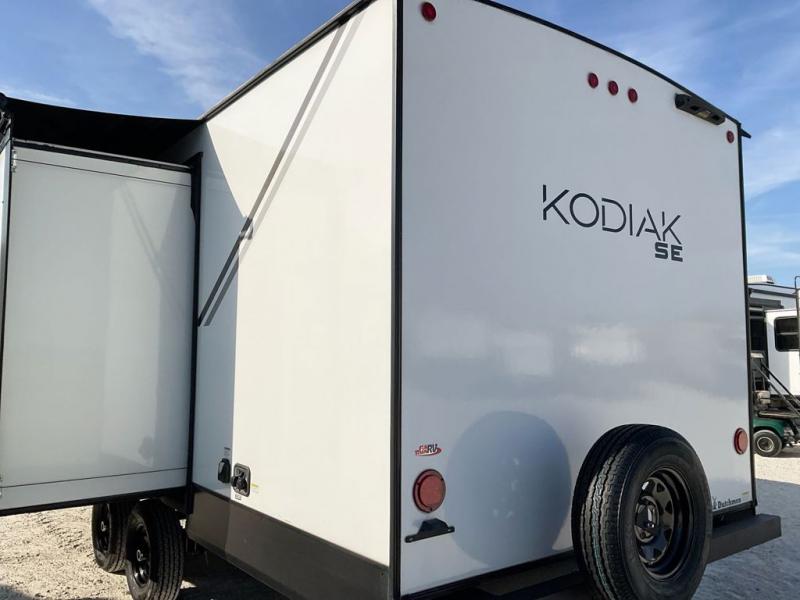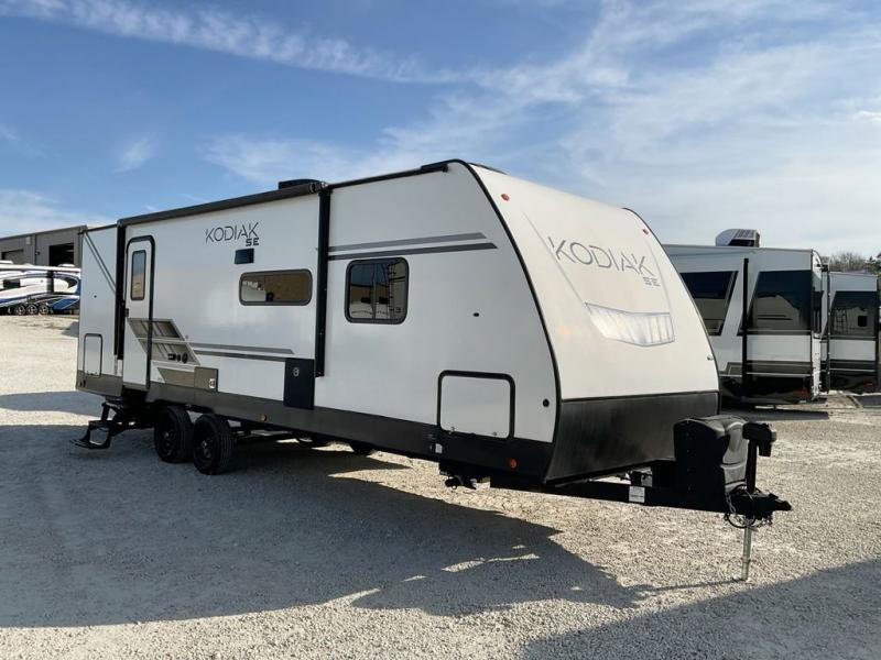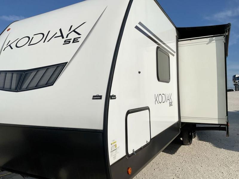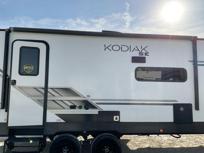 With any Kodiak SE travel trailer by Dutchmen RV, you can experience comfort while camping at a moment's notice. Each trailer includes features such as power front and rear stabilizer jacks, a power tongue jack making set-up easy, and a power awning with LED light. Each model is pet-friendly with the carpet-free slide out floor, tile flooring, and the pet leash D-ring. You can enjoy the wireless Bluetooth speaker, the LED interior and exterior lighting, and the 80" interior height. From the floor structure which includes a fully enclosed underbelly to the laminated walls with aluminum frame and block foam insulation, any Kodiak SE is built lightweight and ready for adventure!