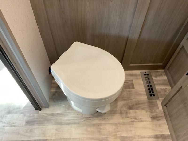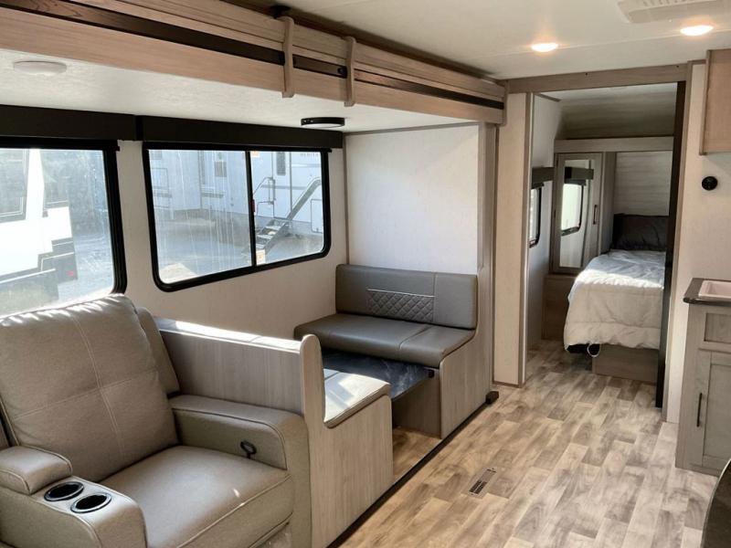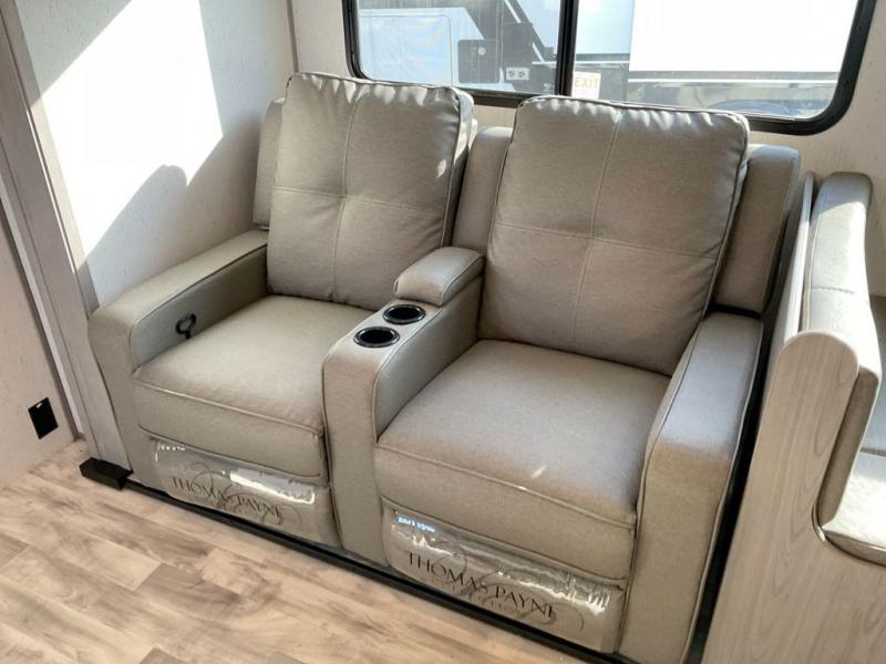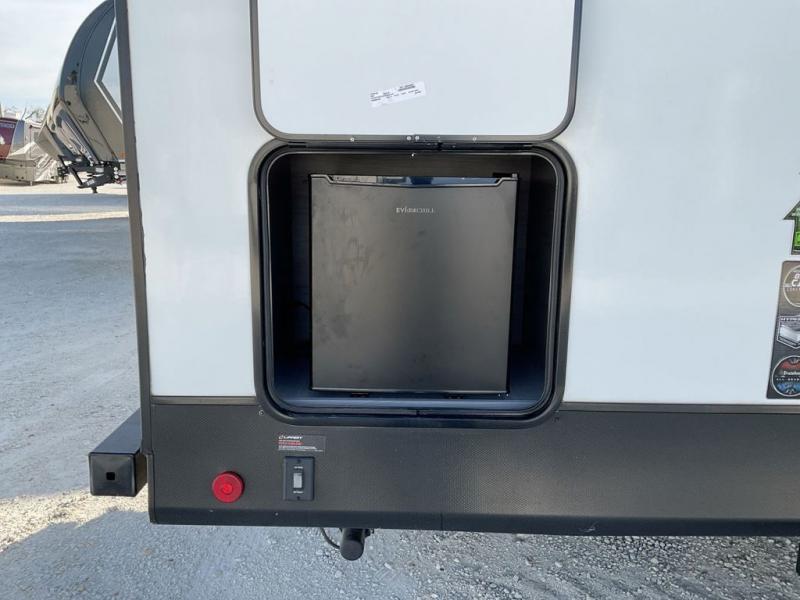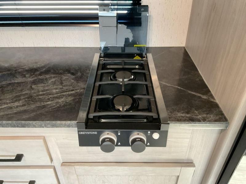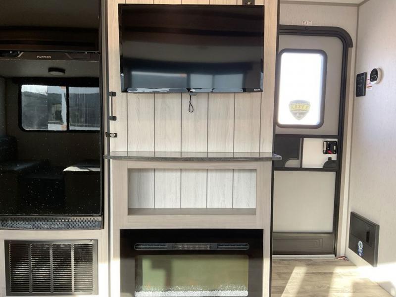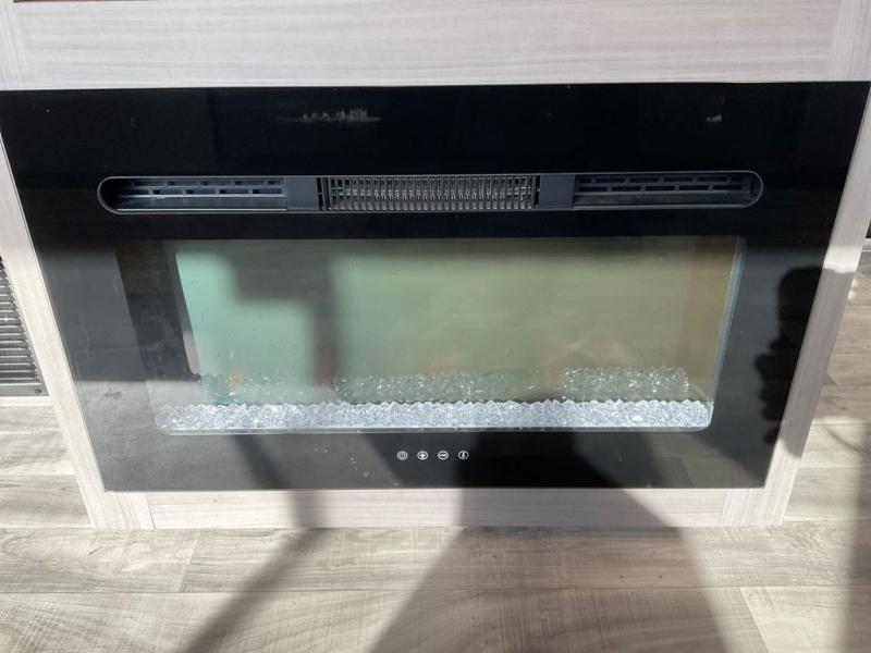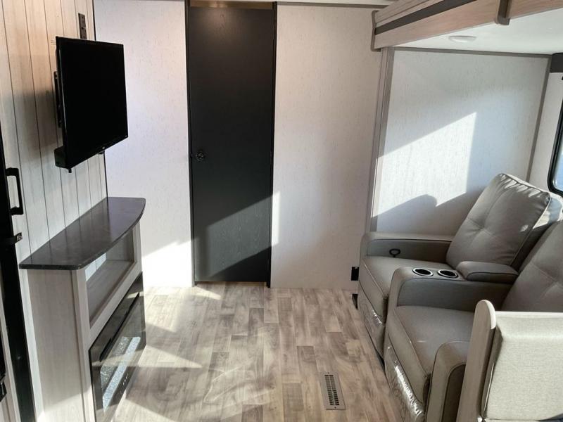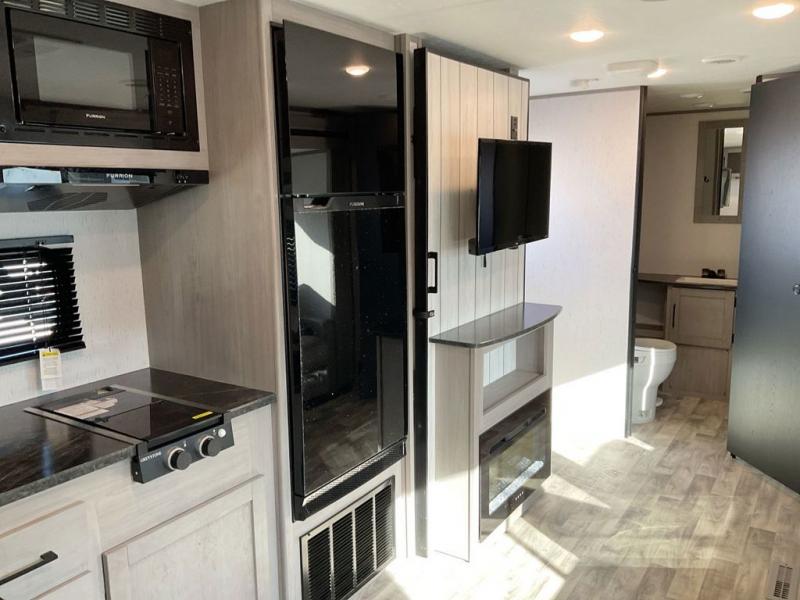This travel trailer is ready to provide you with a home-like environment while you're at the campground. You can prepare meals each day on the three burner cooktop or in the microwave oven, and there is a 10 cu. ft. 12V refrigerator for perishables. Dine at the booth dinette or take your plate outdoors to sit under the 14' power awning with LED lights. There are also theater seats inside if you want to stay close to the fireplace with a good book instead. The full rear bath includes plenty of storage space, and the front private bedroom with a queen bed will feel just like home!