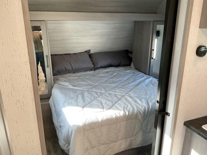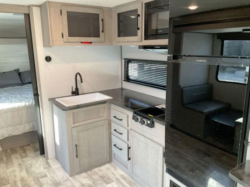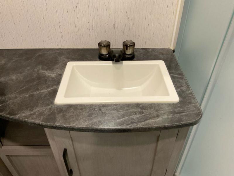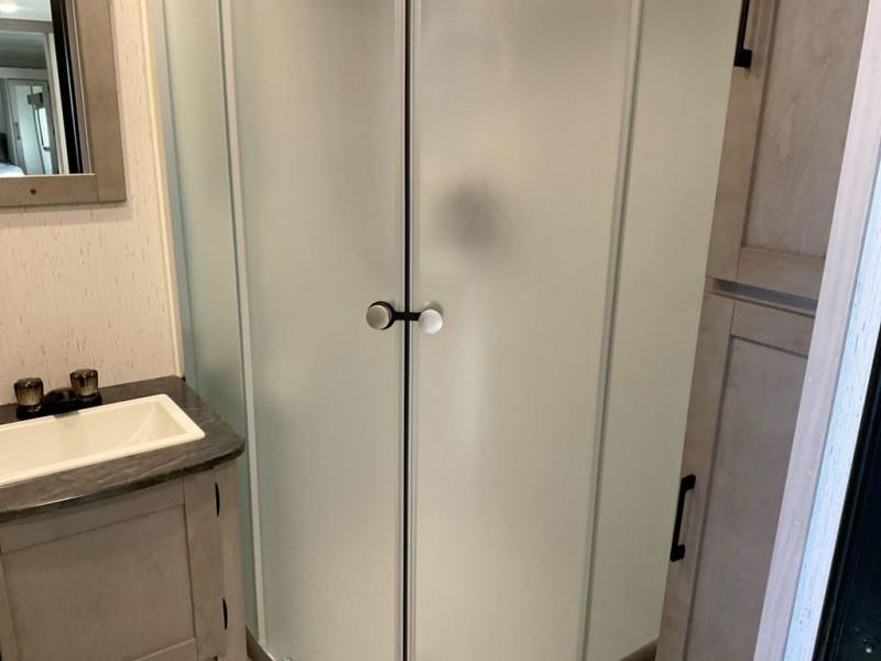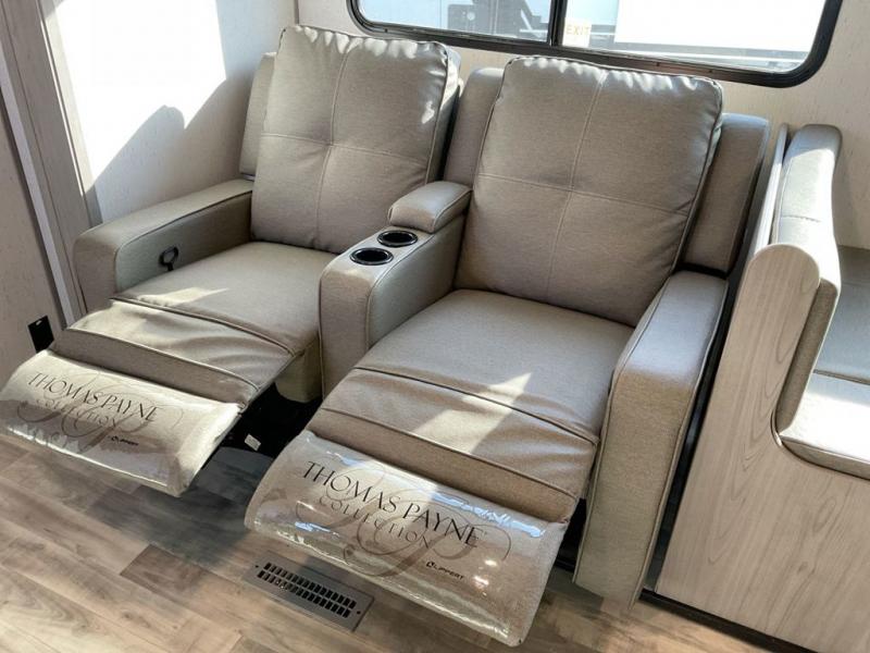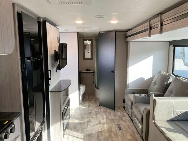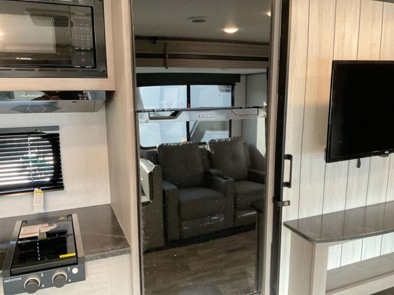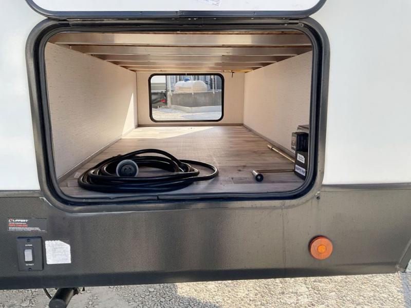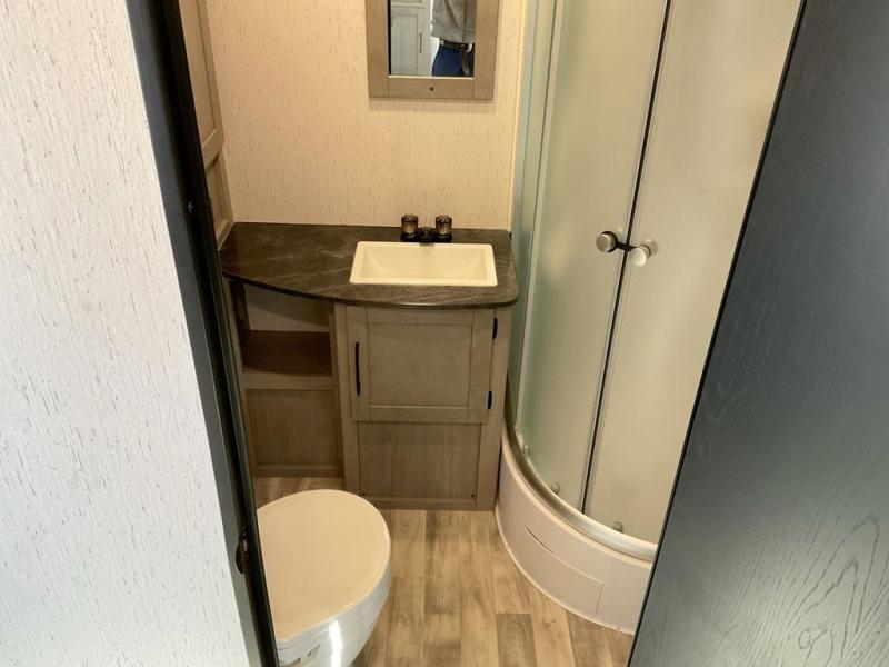 This travel trailer is ready to provide you with a home-like environment while you're at the campground. You can prepare meals each day on the three burner cooktop or in the microwave oven, and there is a 10 cu. ft. 12V refrigerator for perishables. Dine at the booth dinette or take your plate outdoors to sit under the 14' power awning with LED lights. There are also theater seats inside if you want to stay close to the fireplace with a good book instead. The full rear bath includes plenty of storage space, and the front private bedroom with a queen bed will feel just like home!