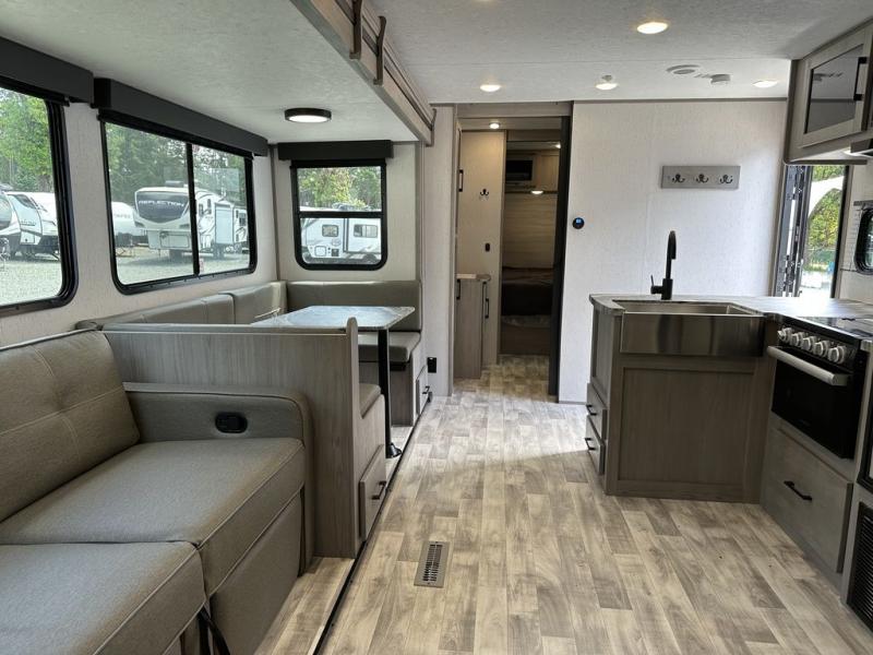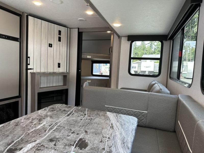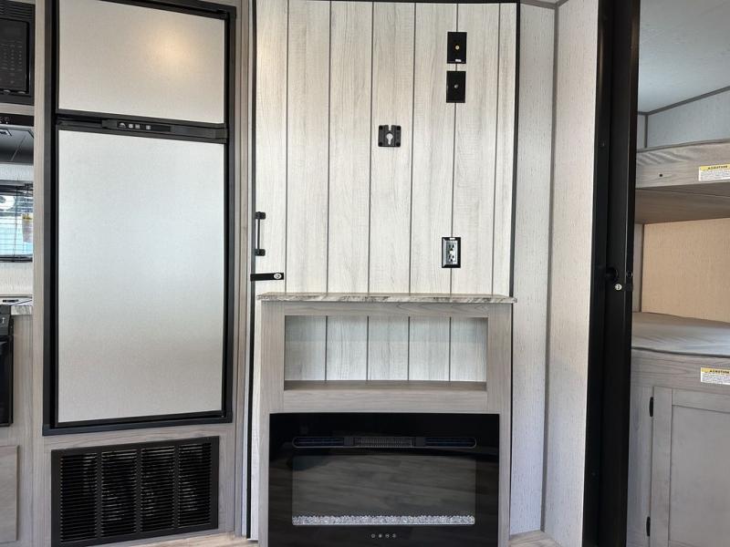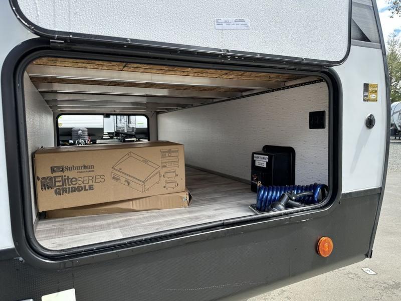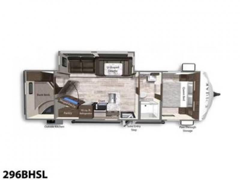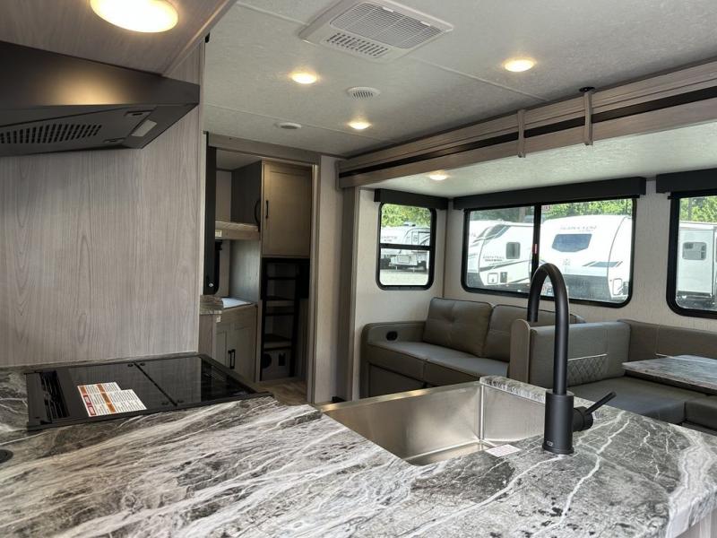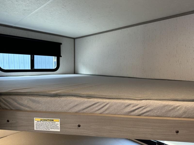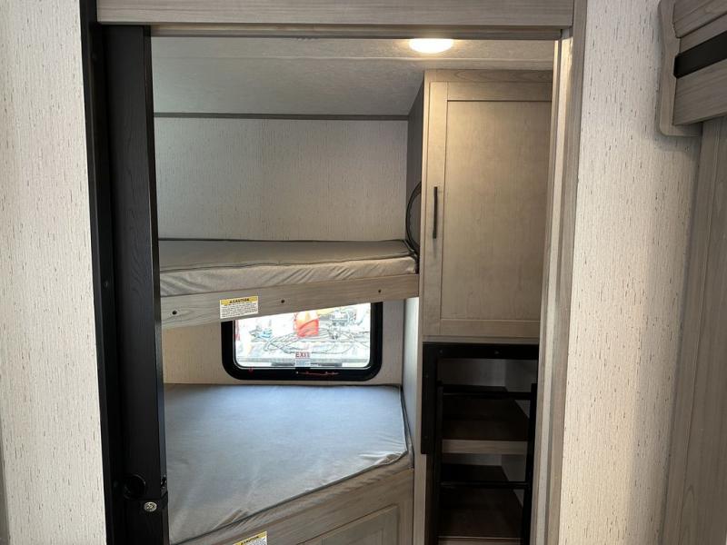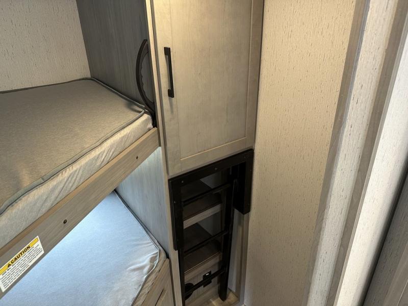 Comfort is found in this roomy travel trailer for eight! The rear bunk beds include their own door for privacy, plus there is a wardrobe here so your guests can store their things. When the large slide is out, the chef of the group can easily cook in the full kitchen, or they can use the outside kitchen if they need some fresh air. You'll also find Solid Entry steps, a 21' power awning with LED lights, plus a pass-through storage outside as well. You will love the front master bedroom with its queen bed with storage space on either side of the bed, plus the walk-through bath will be easily accessible for everyone to use!